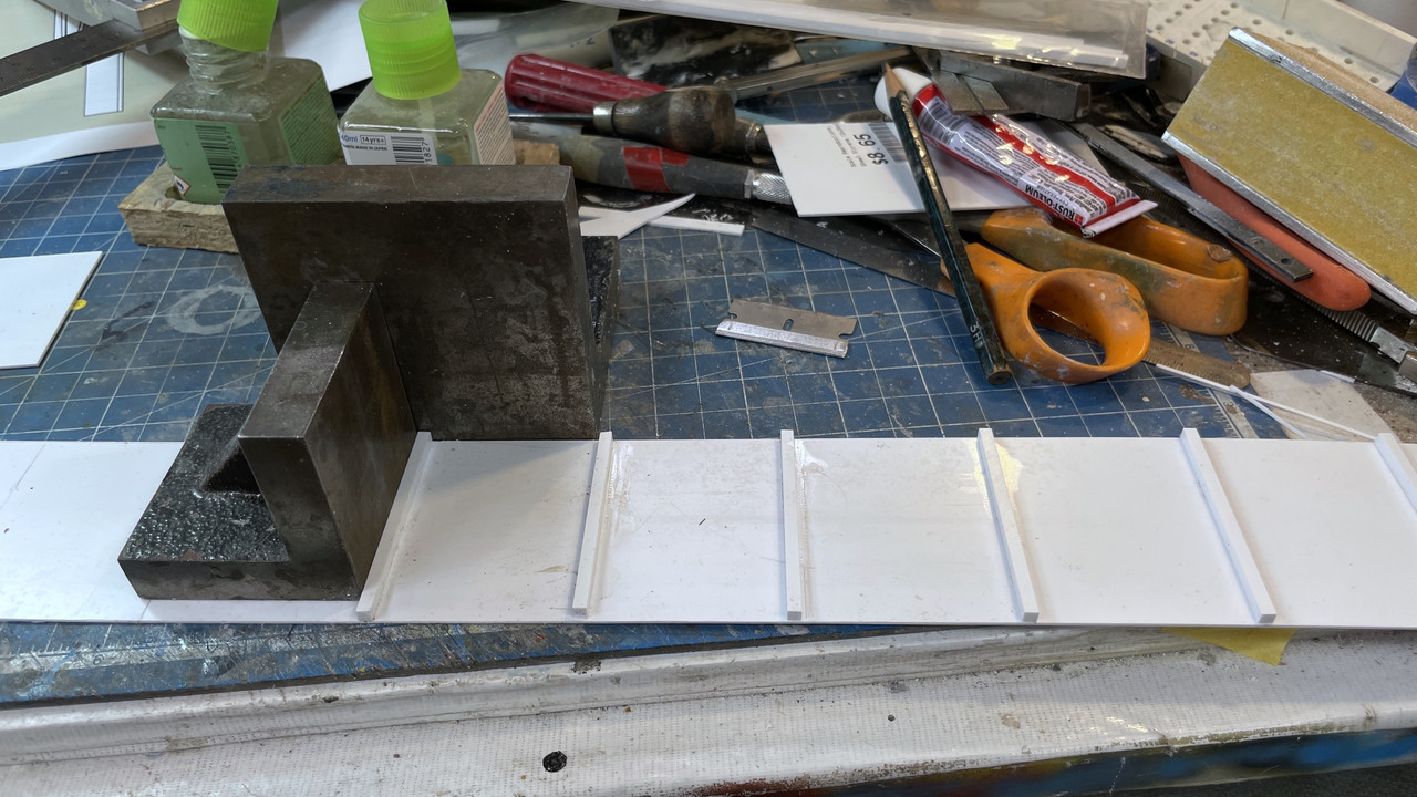 I started a short session by filling and sanding yesterday’s joinery. I am using some styrene strips to fill the big gaps and then use filler. Filler doesn’t like filling empty air. This will have all night to dry and I’ll trim and finish the filling tomorrow.