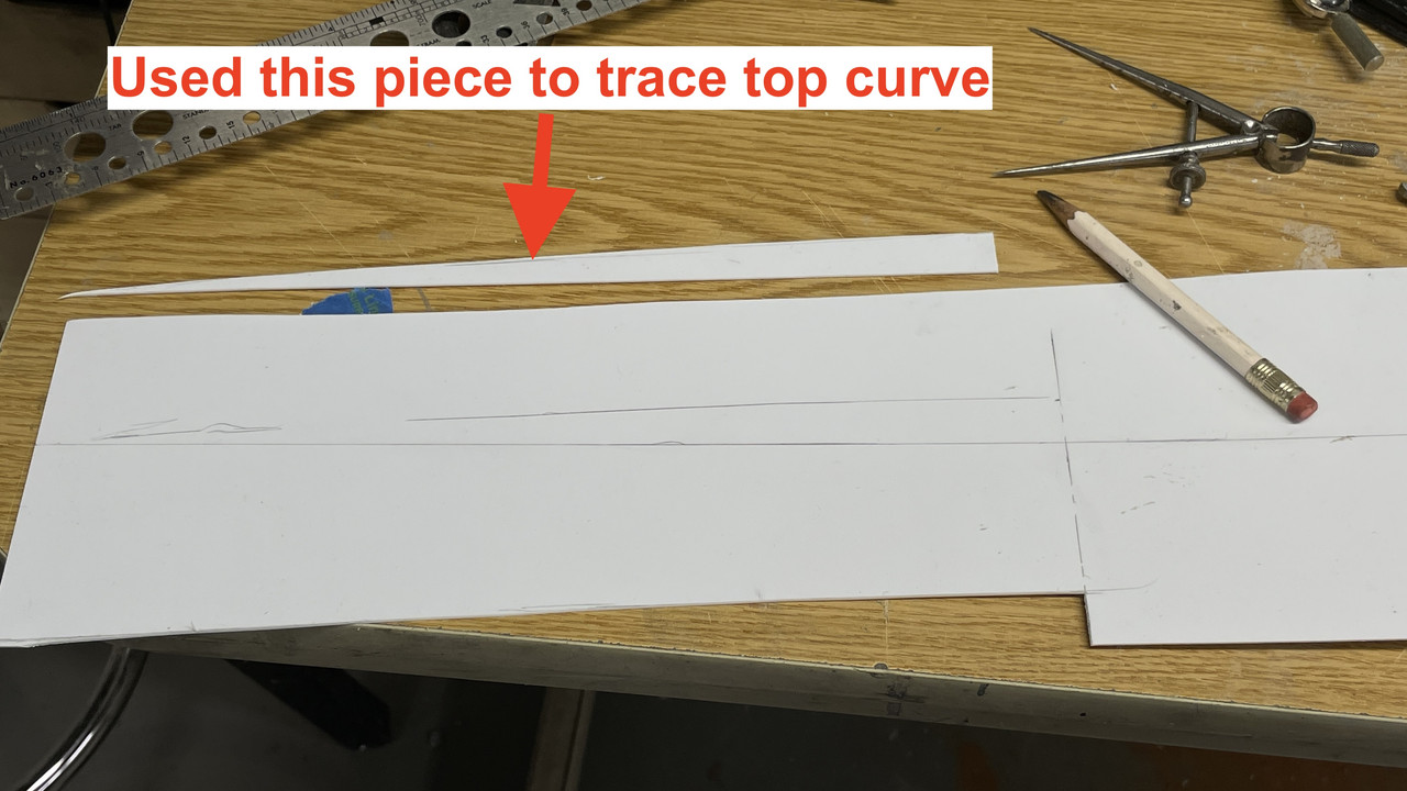 Work continued today on the barbette shells. I didn’t have a full-size pattern to trace cut the lower barbette skirt, so I did by taking the measurements from the non-scale drawing I printed. As with the other flat developed surfaces, I susepected this would need some tweaking and it did. To draw the long developed curves all I had was the mid-point height. I bent a steel ruler to form the curve and traced with a pencil. I only did one quarter of the curves (top and bottom) and then used the scrap piece to trace the same curve on the top. I cut the top and then used the same piece to trace the last curve on the bottom.