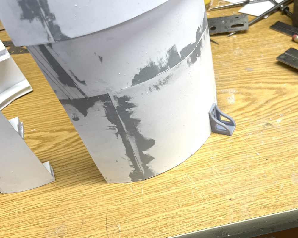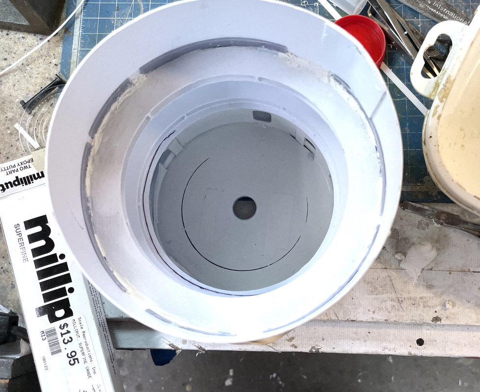 I could now go back and remove the powder flat and finally glue the bottom ring into place. Again, I used a combination of solvent cement, tube cement and med CA. With the lower edges of the truncated flat finally glued to the bottom. I went around and did final sanding and filling of the lower cylindrical structure.