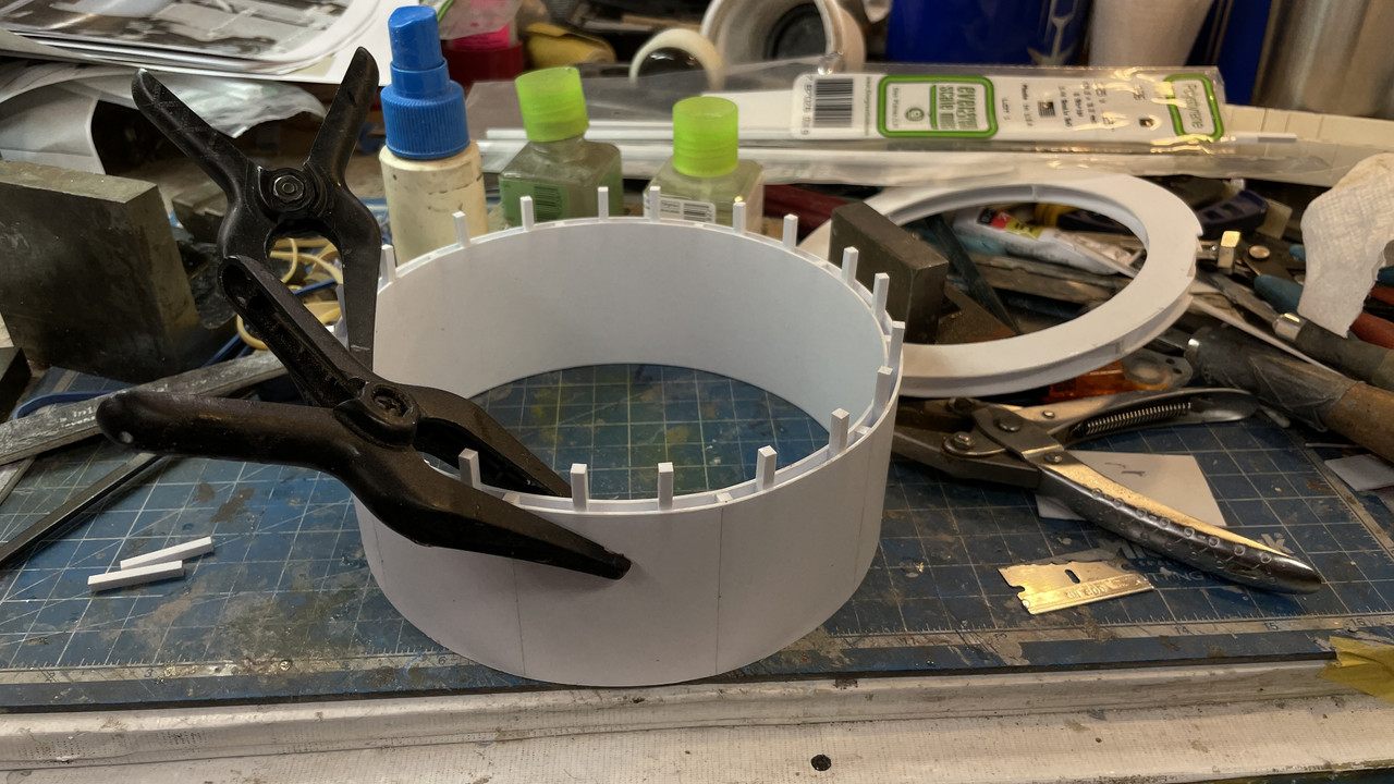 I used 1/8" square Evergreen bar stock to provide the spacers that will give the armored barbette its scale thickness. I spaced them every two inches and doubled up where the inner shell’s joint was going to fall.