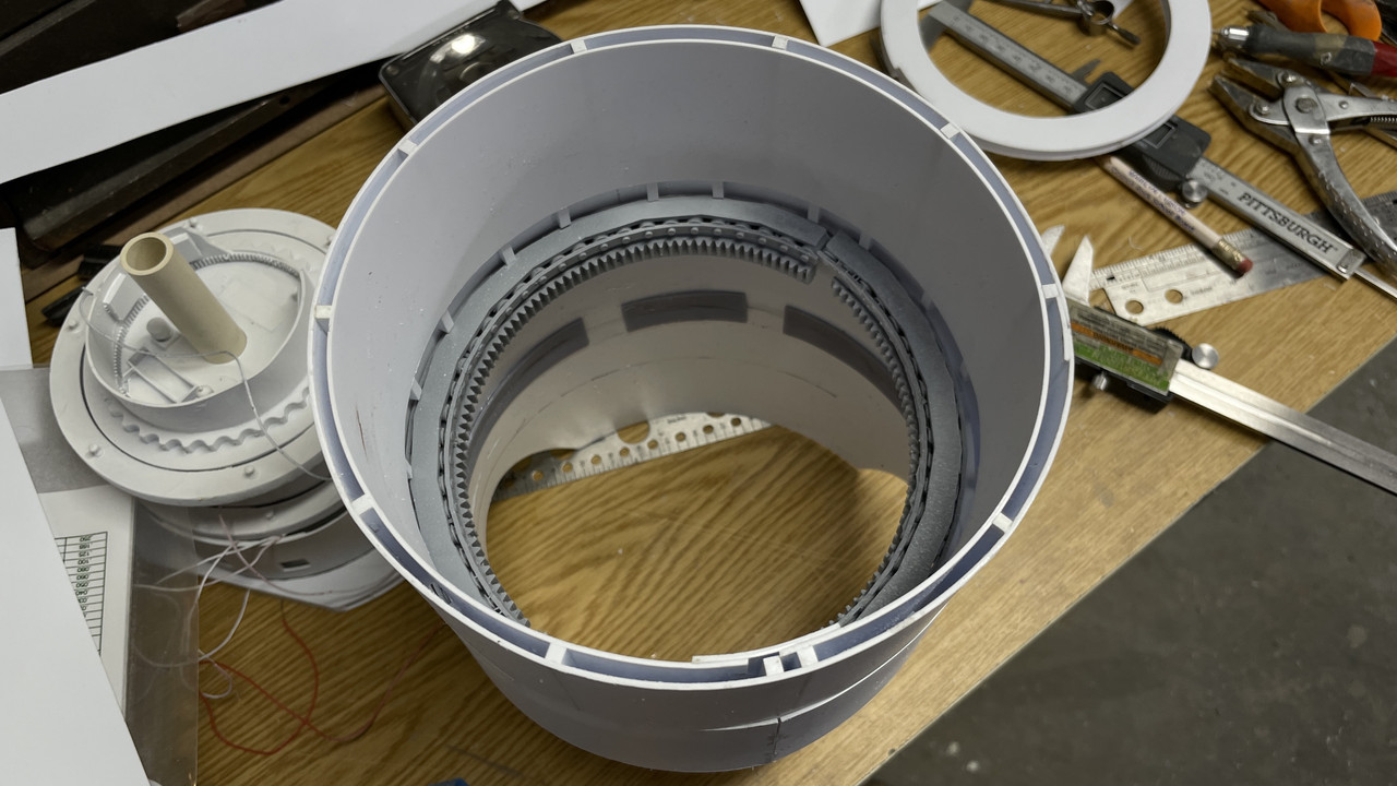 Again, I held off gluing all this together. I need to access the lower cyliinder a lot and will install the upper barbette later on. I also happily found out that the connection pieces I added yesterday DO NOT run afoul of the ring gear. They sit well above where the ring gear goes. It sits right on top of the lower tapered bulkhead’s top edge. And that’s a happy thing.