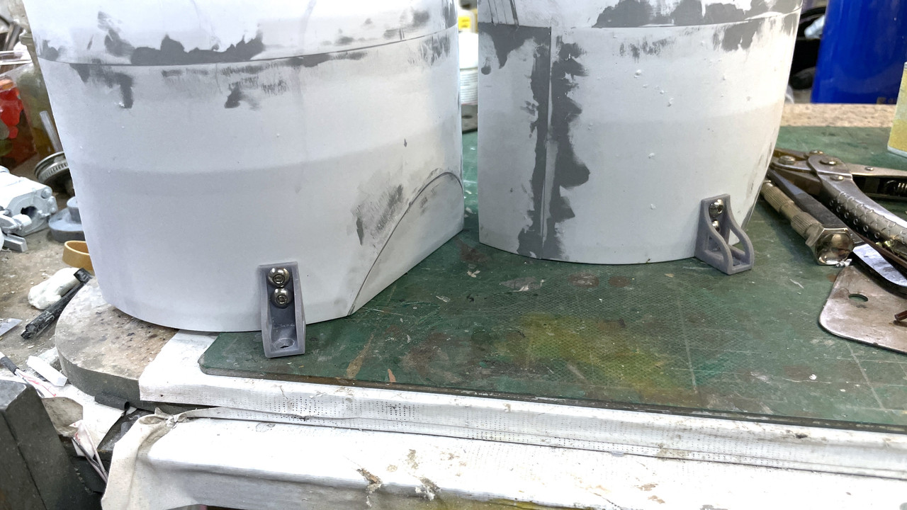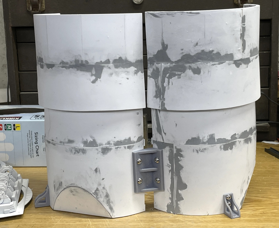 Furhtermore, since these shells are not moving, a hinge is overkill. I’m going to permanently screw the shells down to the baseplate. BTW: the brackets came out well and I will also be mounting them before painting. I’m just going to draw and 3D print an angle bracket that will hold the shells in the correct relationship, and that will be that.