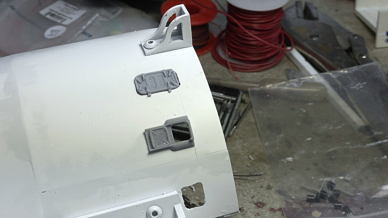 I used the actual 3D printed parts to shape the final openings and did so with the power micro-sander and some jewelers files. Could use a smidgeon of filler…Notice how the junction bracket inpinges on the place where the scuttle door.