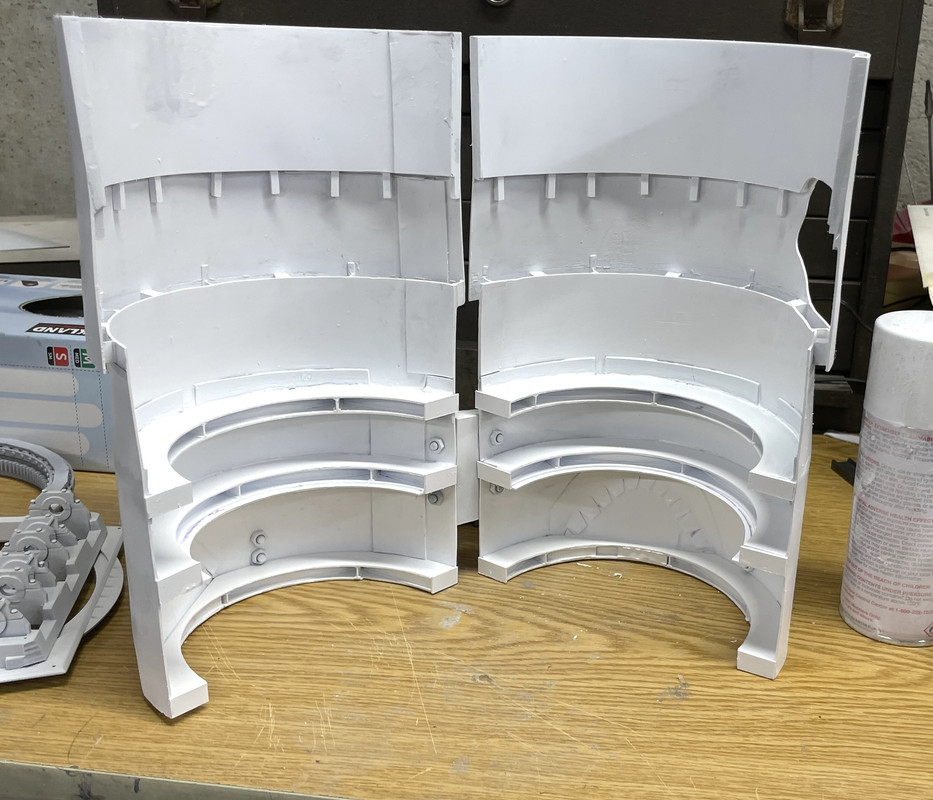 Here’s the outside of the just primed shells. I couldn’t really see the piant laying on. I was wearing my chemical respirator AND safety googles besides my normal glasses, and couldn’t see much of what was going on. Ergo, I got some runs. White is a tough color to spray for that reason. I smeared the paint with my nitrile-gloved finger to reduce its height and will do some post-priming finishing to restore the surface before finish coats.