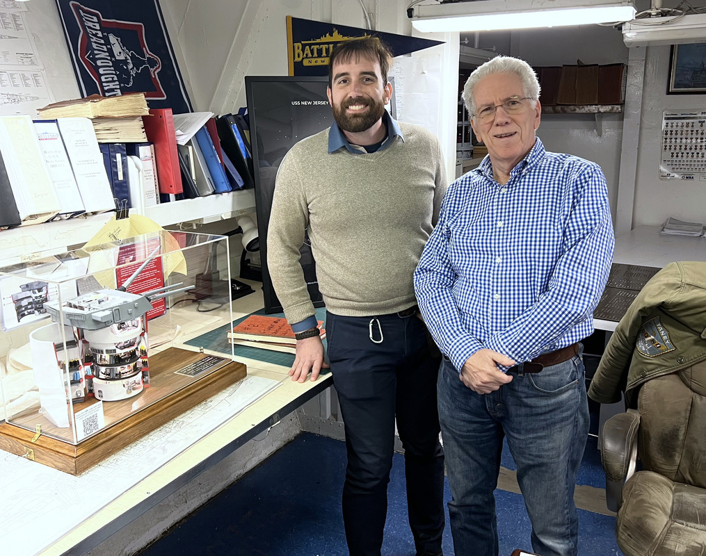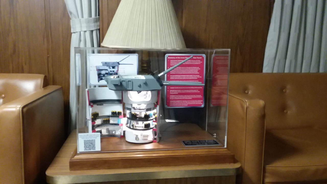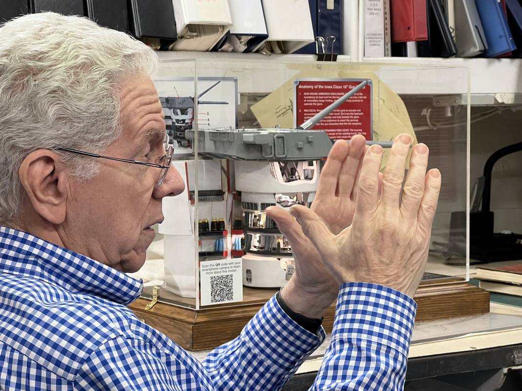 These pictures were taken by my younger and stronger nephew who did the honors of carrying the model to the ship and down the companion way ladder to Ryan’s office. We discussed where it should be displayed and decided the ward room probably would work. It’s the place where Anyone with a disabilities can go to the wardroom and get educated about the ship. I also asked if he communicates with curators in the other three Iowa museum ships? Yes! And they might be interested to have a model of their own. These would not be donated and shipping would become a challenge. I could drive a model to the Winsconsin in Norfolk, but Iowa in San Pedro and Missouri in Pearl is another story.