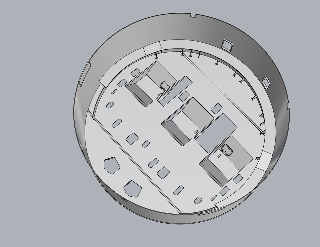 The Electric Deck is fully partitioned and you can’t get from one partition to the other. You must go either up or down and then across. It’s like the Super Mario Brothers game. Luckily, I have done nothing on this deck except the outer walls so I didn’t waste any effort. And then there’s “how to show this interior?” There are four work stations in these partitions: one person manning the manual training (traverse) station, and one each manning the manual pointing (elevation) stations. It must have been pretty longer in those claustrophbic work stations in the bowels of the turret. All of this deck and the pan deck rotations with the gun house and the guns. When you get to the projectile decks, the outer portion is fixed. The next ring with the projectile hoists rotates with the turret sicne the hoist chases are fixed in their position to the gun compartments, and the inner ring is rotated independently with it’s own power system and circlar rack and pinions… sort of miniaturized version that rotates the turret itself.