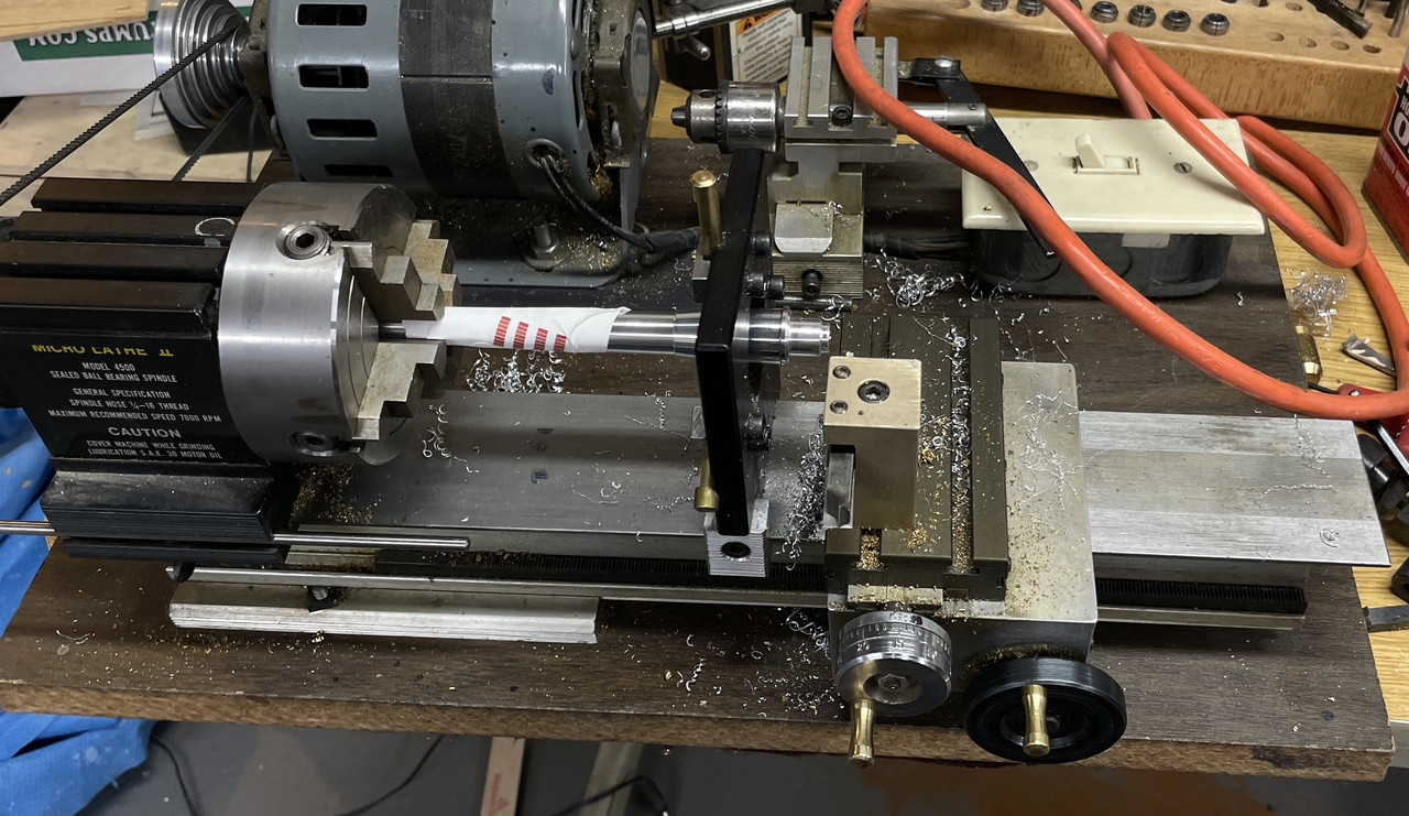 I wasn’t sure I could chuck the tapered barrel into my little Taig micro-lathe. The spindle through-hole is not large enough to accept the hole barrel up to the parallel part at the slide area, but i was able to center it with the four-jaw independent chuck and use a steady rest to support the long overhanging part. I got the concentricity within a couple thou. I wrapped the chuck area with some adhesive label paper to protect the finished surface. I was able to successfully change the diameter. If my lathe was a little bit longer I could further drill out the bore, but it ain’t, so I won’t.