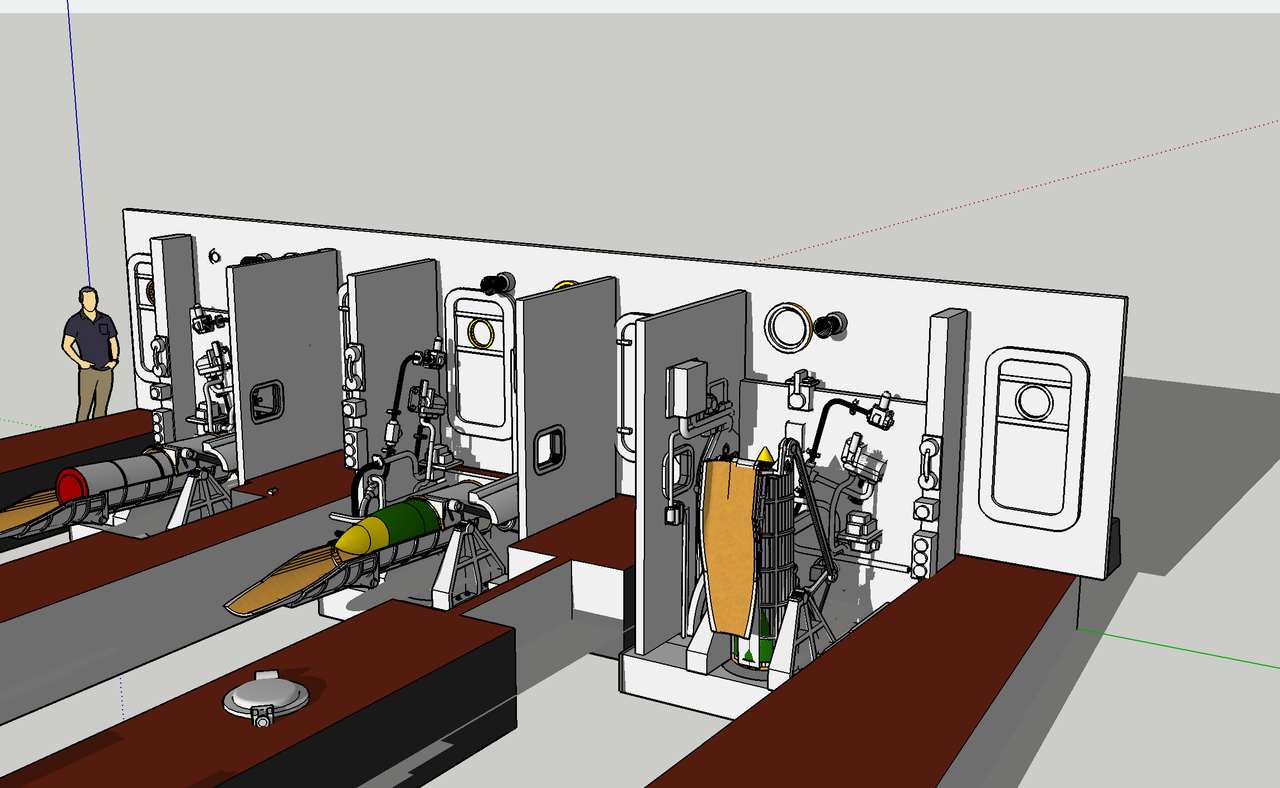 Jim Palmer, one of my faithful followers, has provided me some exceptional drawings (not SketchUp) based on actual engineering drawings of some of the critical structural areas that are very ambiguous on the illustrations that I have. He’s going to get me some dimensions to make these more usable to me. One of the big “AHA’s” was the edges of the gun girders form the partition plates in the pan deck. I can make this modification. I just need some measurements to firm up the final shapes.