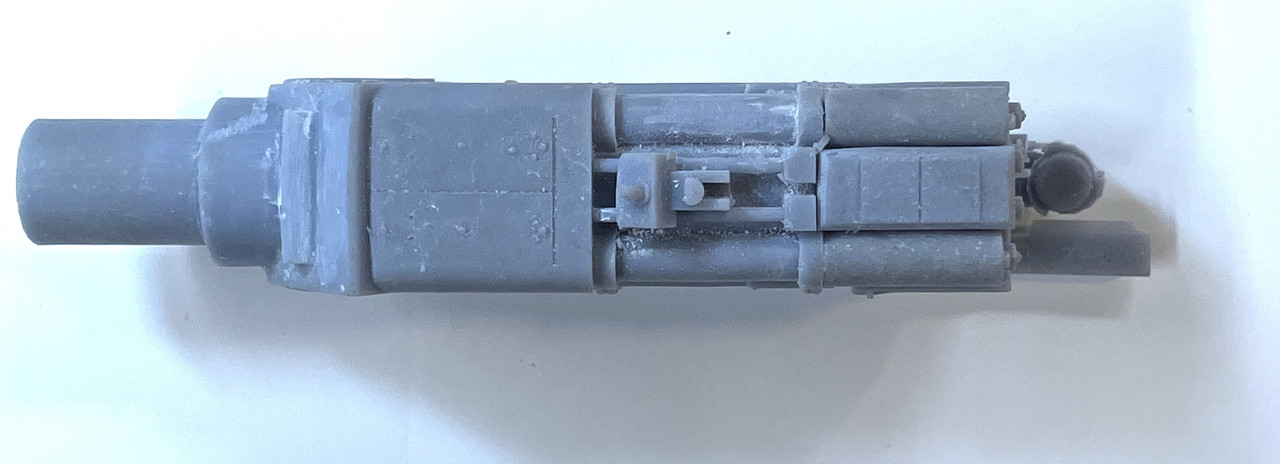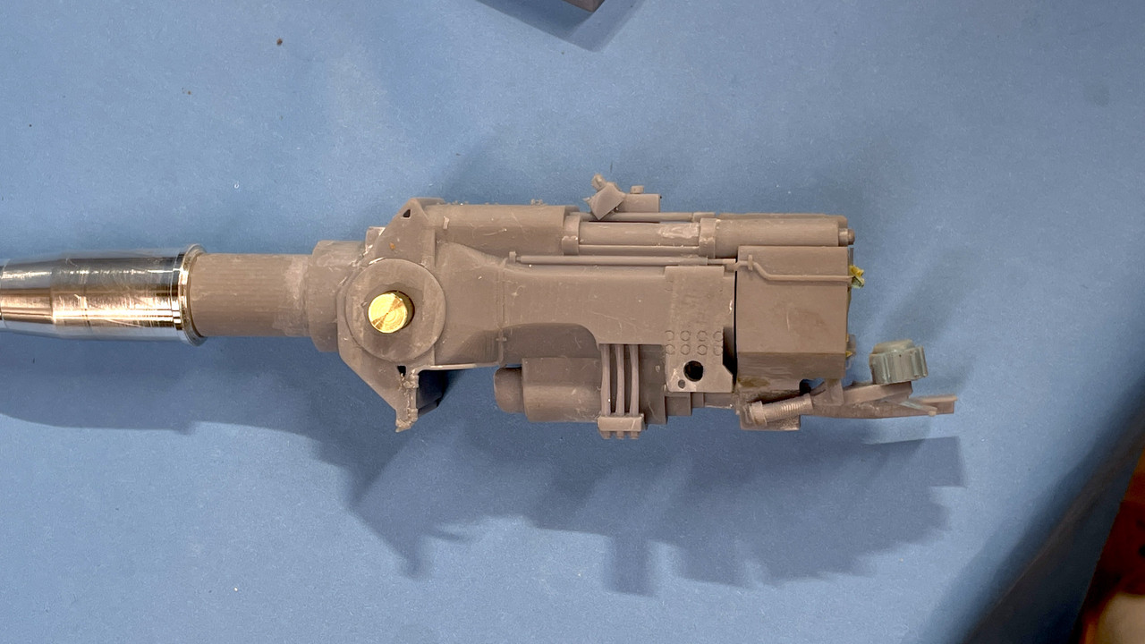 The gun slide was another thing entirely. While the print was successful (sort of) it still warped a lot. Both halves warped away from the jointing surface at each end. I thinned the slide sleeve that was to accept the gun to much. I did this so it would slip into the slots on the glacis plate on the gun house. So it kind of fell apart when I post-cured it. I screwed it together tightly using the two screws by design and another 1/4-20 bolt and nut through the trunnion hole.