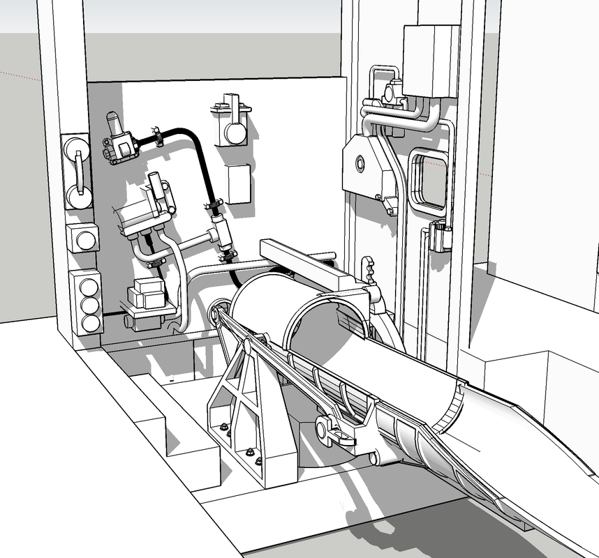 The moving rod is stroked up and dow by a hydraulic cylinder (for those so inclined, the first part of this sentence did not talk about what you might have thought it was talking about). When the projectile is pulled into the hosit base via the par-buckling rope it passes through two spring loaded doors preventing the projectile from re-entering the projectile handling area. The hoist rod starts moving up with the spring-loaded pawl extended and it hooks under the projectile lifting it up the length of the piston stroke. As it reaches the top of the stroke the projectile has been passing by the pawl on the oppositie wall which pops out beneath the other side of the projectile’s bottom preventing it from falling back. The moving rod retracts downwards bringing the next pawl (retracte) along side the projectile where it pops out at the bottom grabbing the projectile and lifiting it the next stroke. This continues until the projectile enters the cradle which also has a pawl that snaps out grabbing the projectile and preventing it from falling back. The projectile is stable in this position and ready for loading the gun.