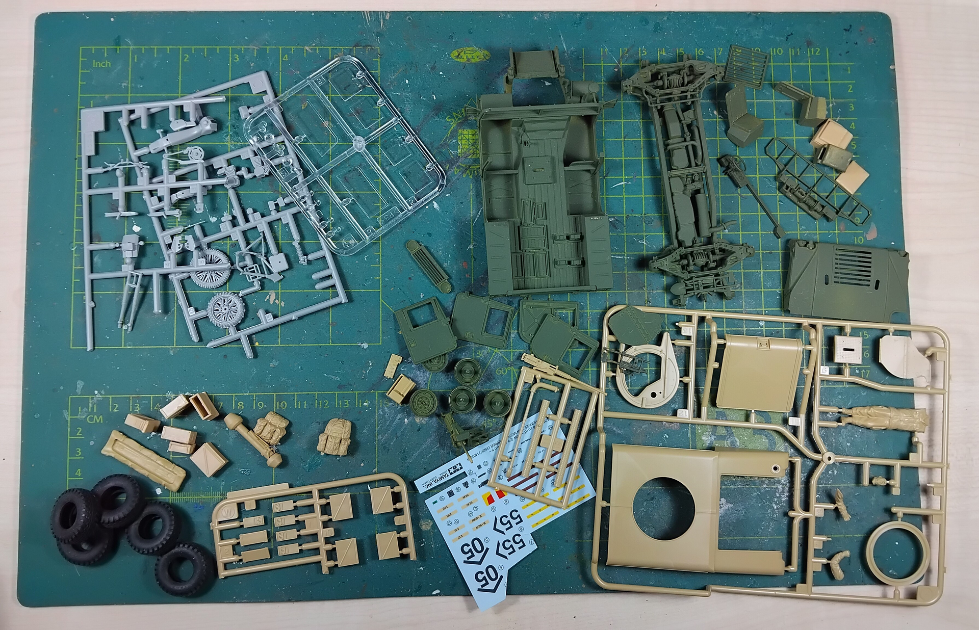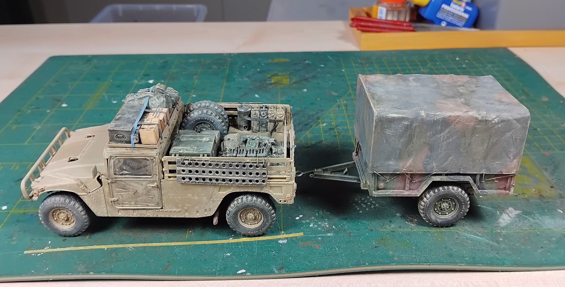 the kits are all pretty much OOTB, except for the M101. I made a cover on the trailer by combining the covers from two 1097’s into one that fits over the M101. I needed that second one for replacement wheels for the trailer too. I also made a roofrack for the 1097, based on this: