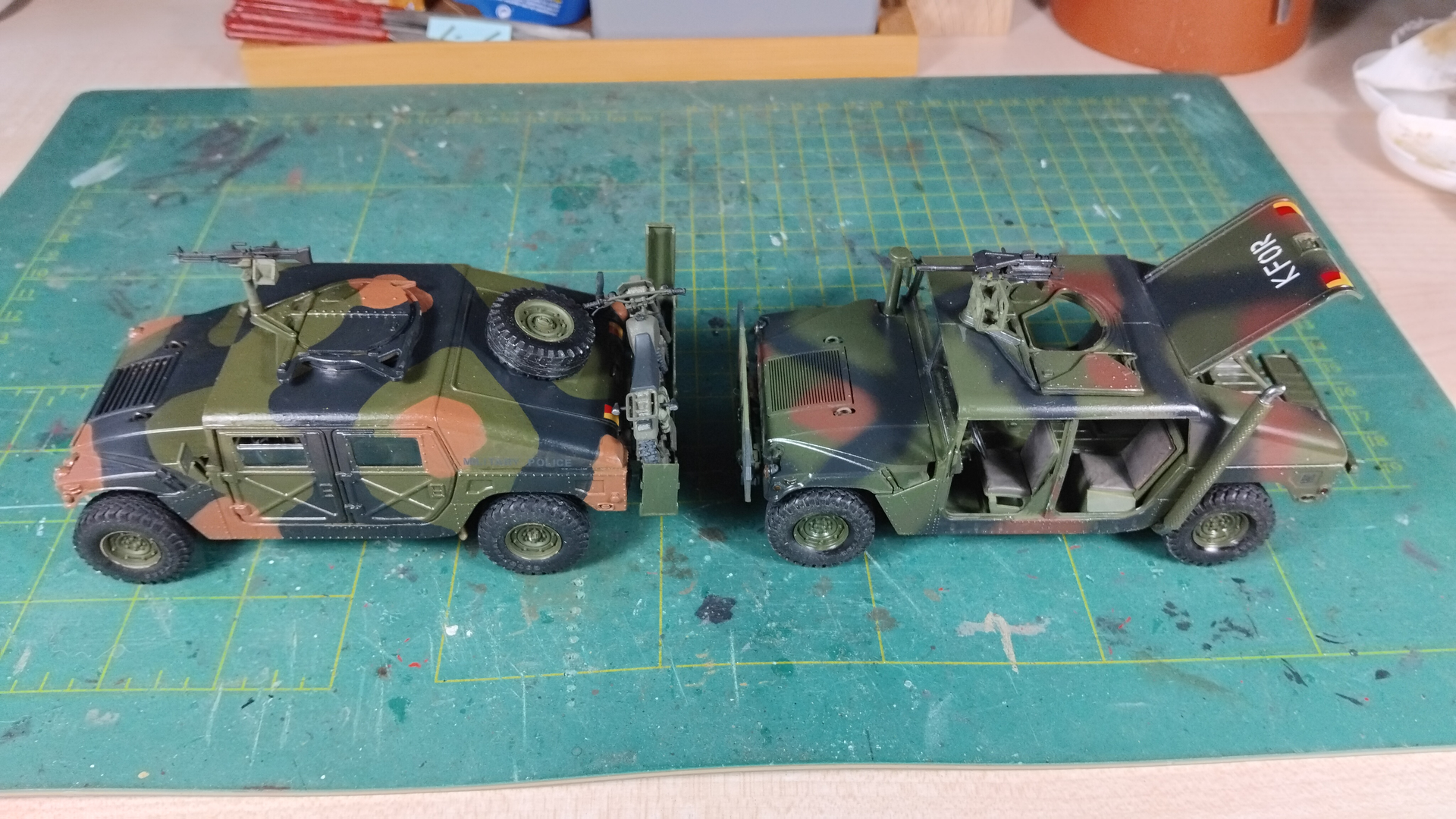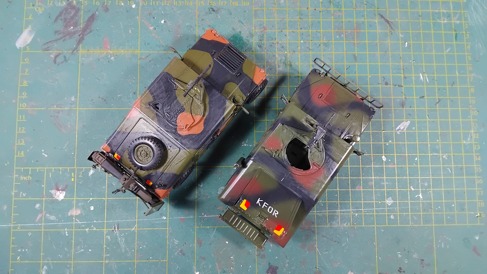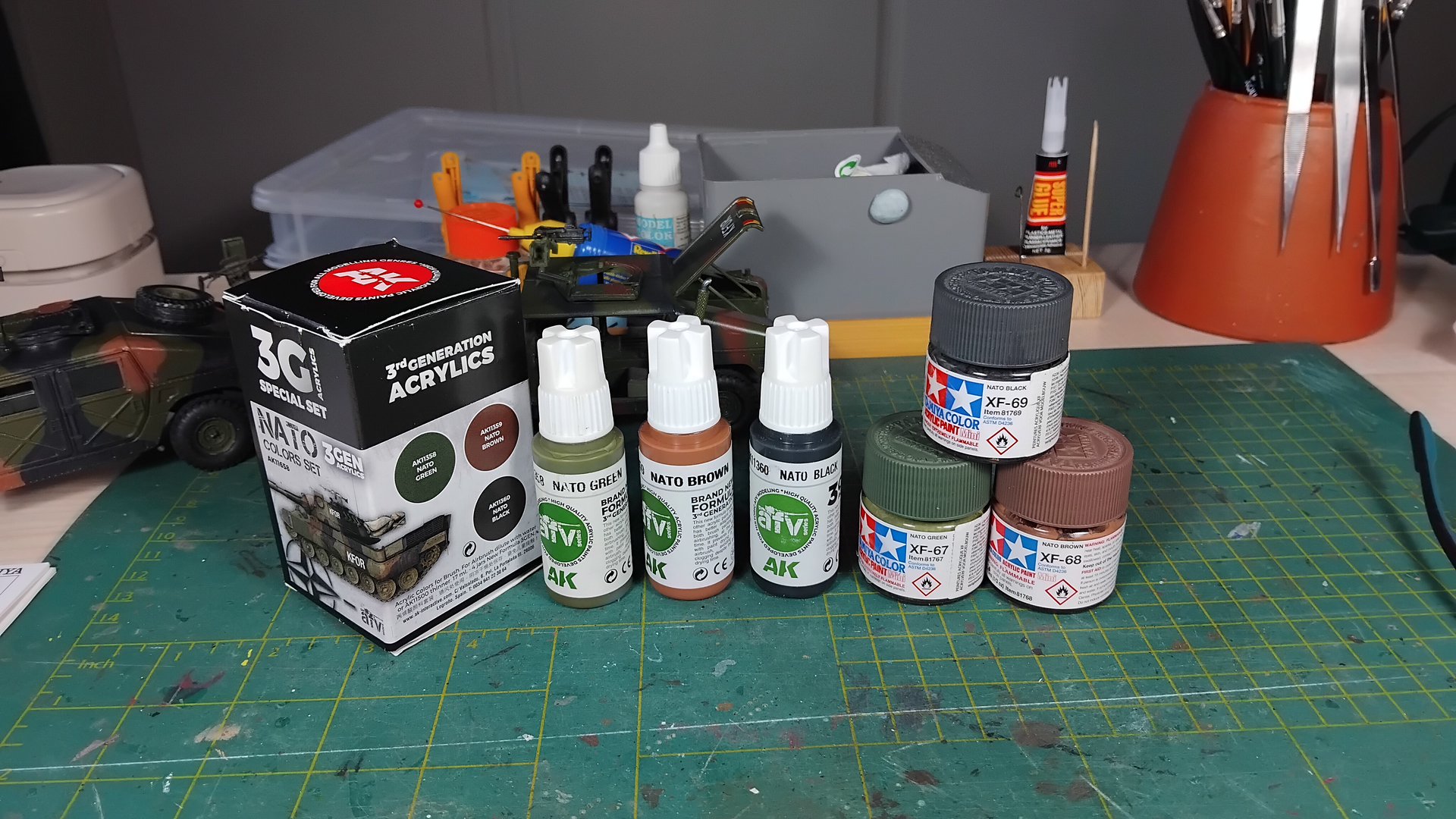I did one (KFOR) in Tamiya NATO and the other in AK NATO. The latter colours do not resemble NATO tones in my opinion. The green is way to yellow and the brown looks a lot more like MERDC-brown than NATO.