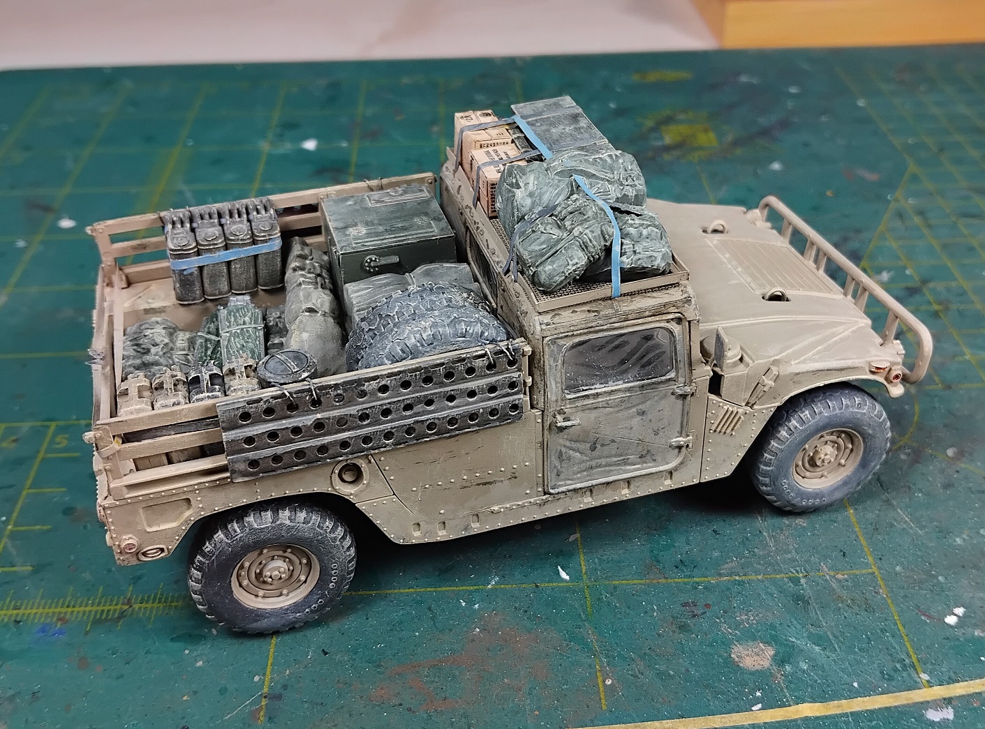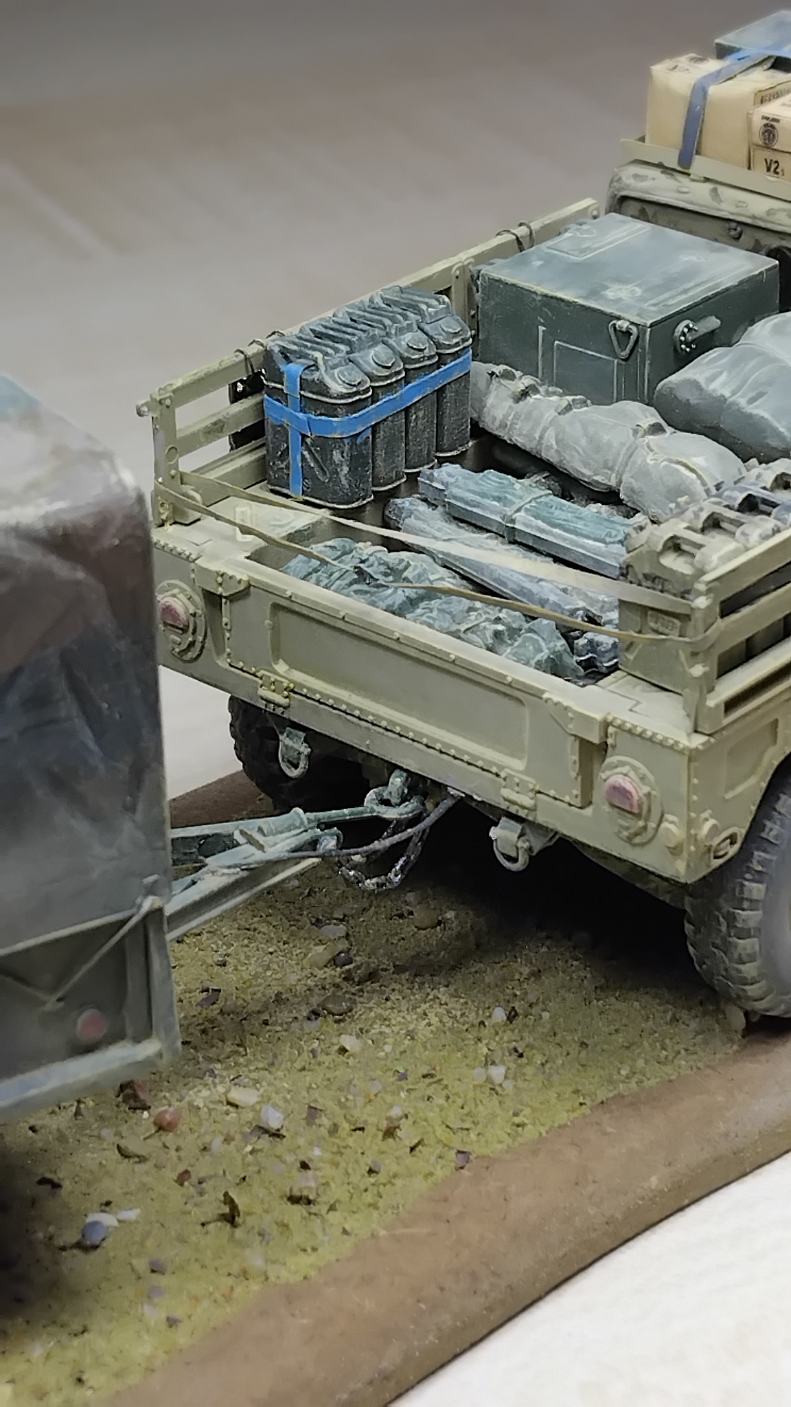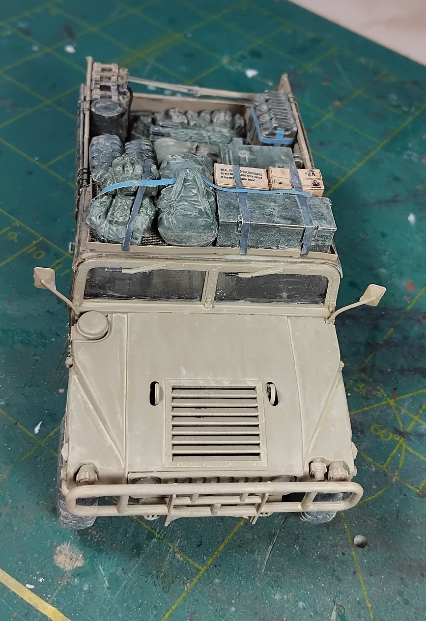 Very nicely done. Good to see stowage actually tied down and not just being held in place with magnets. Nice idea running the cargo strap underneath the duffel bag straps. The only thing I might suggest is scraping off the mold seams on the water cans. The dry brushing really brings them out. Five minute fix?