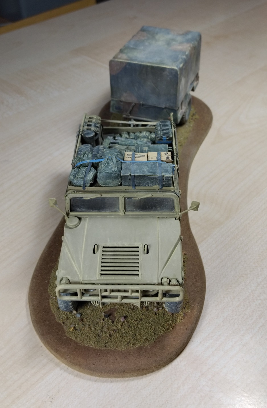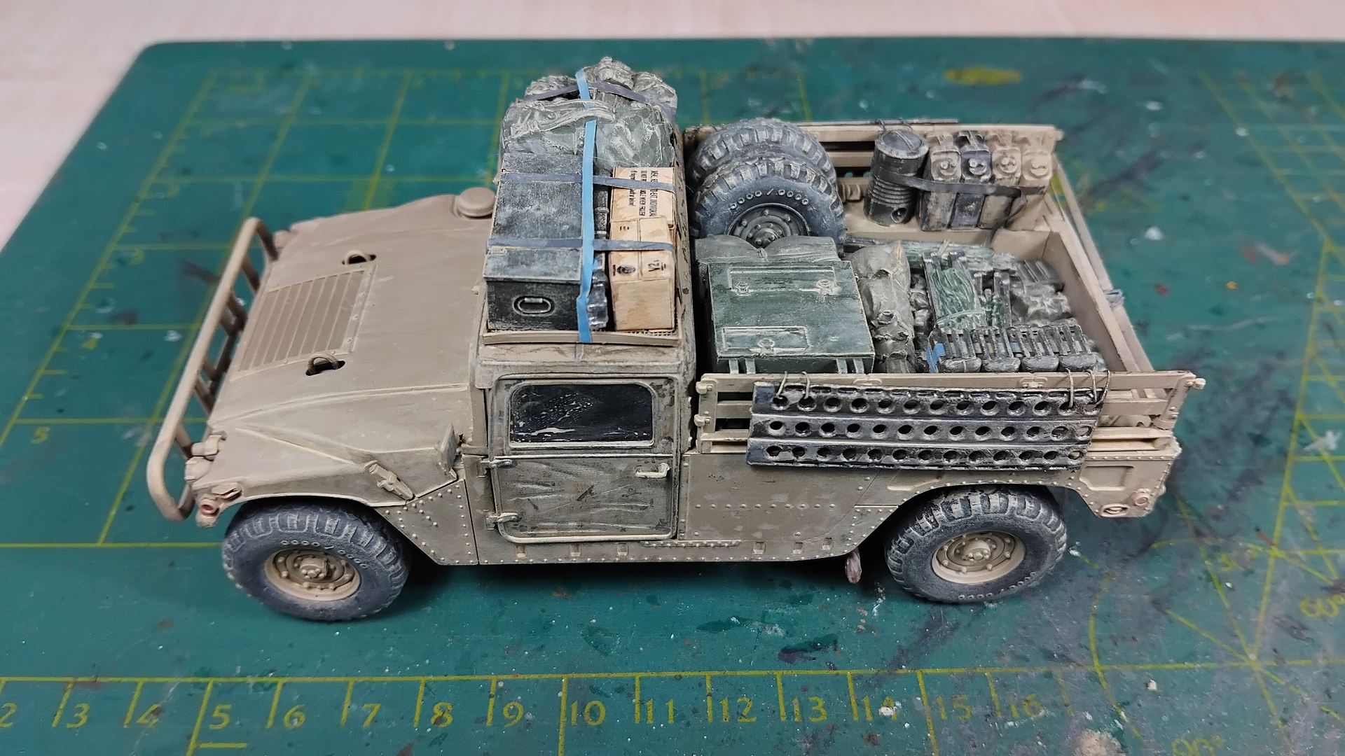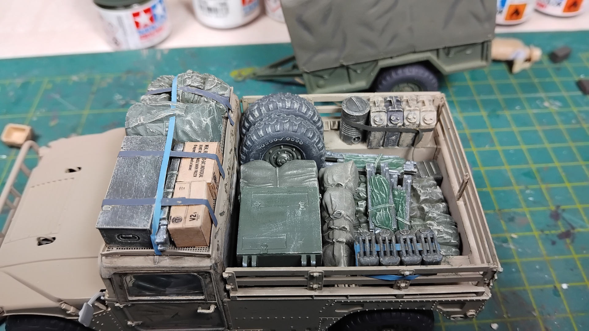 Very nicely done. Good to see stowage actually tied down and not just being held in place with magnets. Nice idea running the cargo strap underneath the duffel bag straps. The only thing I might suggest is scraping off the mold seams on the water cans. The dry brushing really brings them out. Five minute fix?