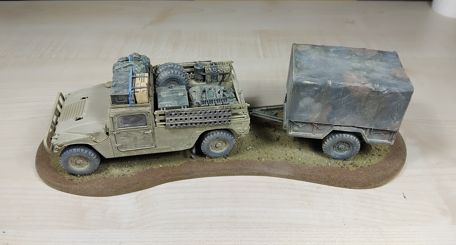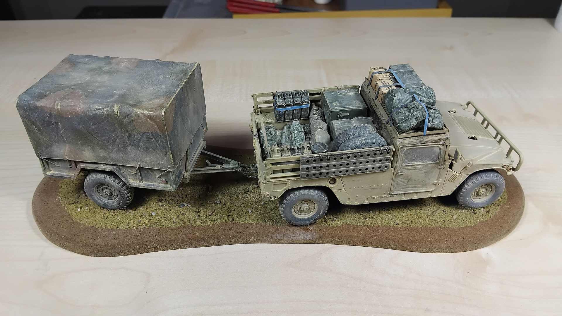 For the “Tough MUV-er”-campaign I am doing 3 Hummers in various configurations; an Italeri M1097 with M101 trailer, Iraq 2003, a Tamiya M1025 weapons carrier in Bosnia/Kosovo and a Academy M998 with motorcross bike on the rear, during a NATO exercise late ‘80’s, early ‘90’s.