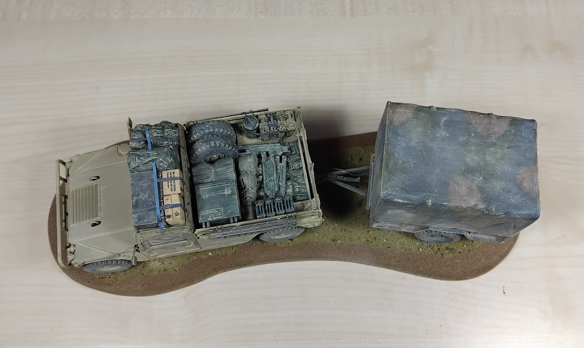I had to make a quick base in order to be able to handle the combo. The coupling of towing hook, 2 chains and a cable was very fragile. With that being done I could add the final dusting.