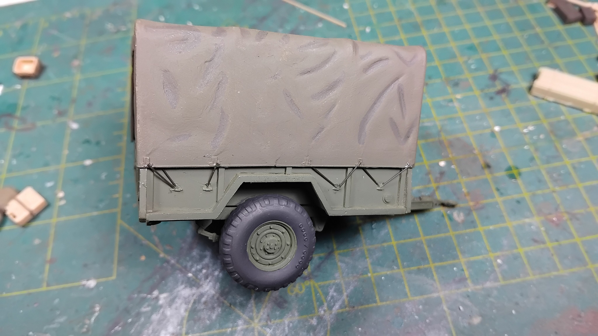 The cover for the trailer is made up out of two covers from the same Italeri M1097. I needed a second too for the extra wheels under the trailer. Te rubber toedowns are pieces of stretched sprue.