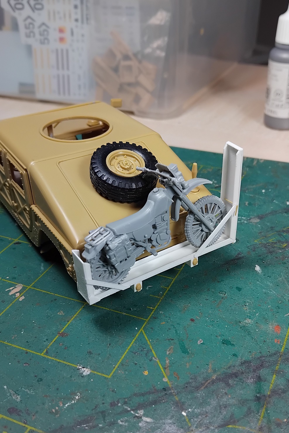 I added a sparewheel on the rear, so I can drape a camouflagenet around it, whic incidentally will hide the incomplete right side of the bike.