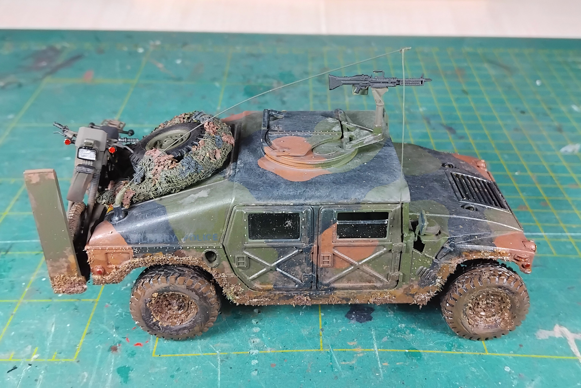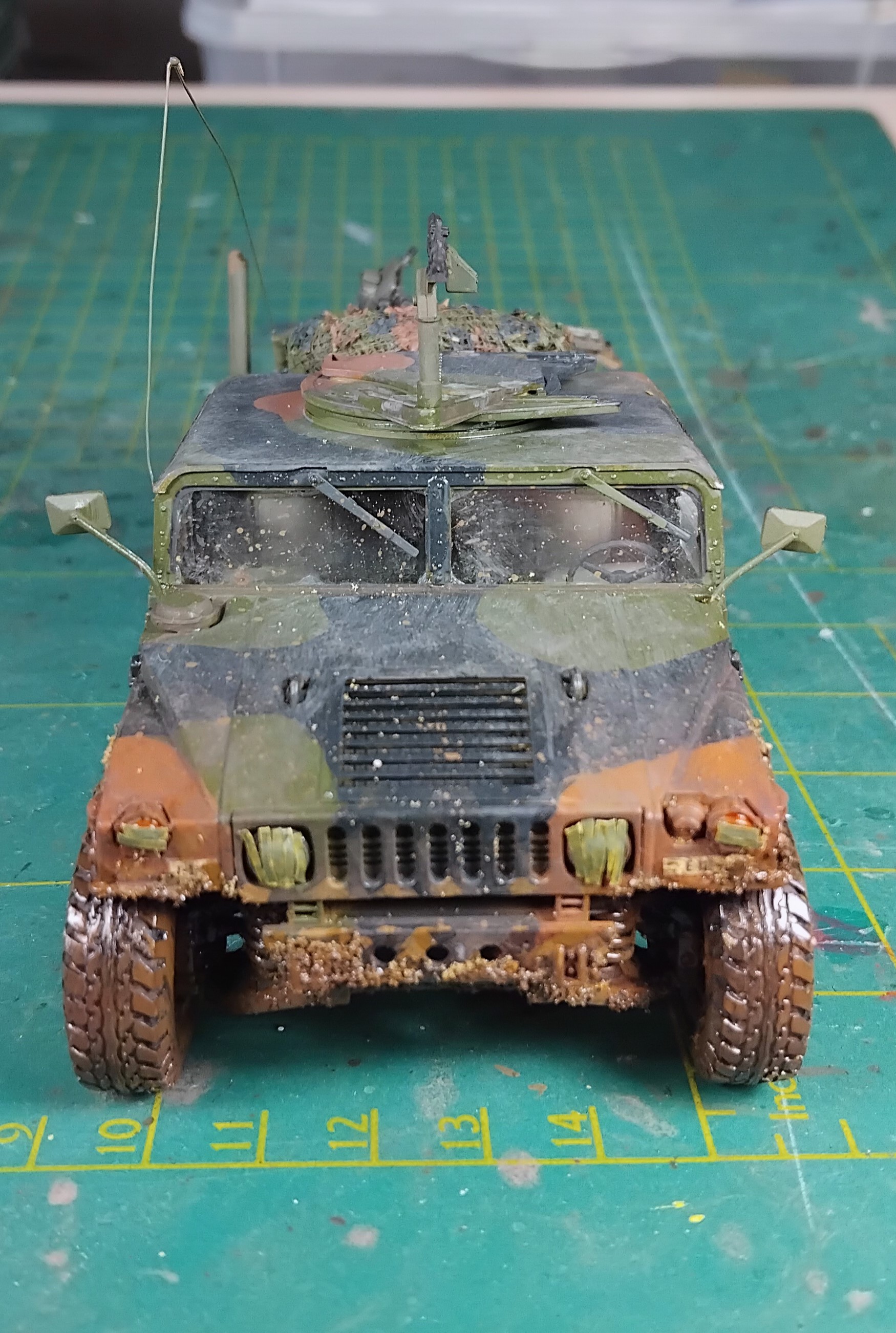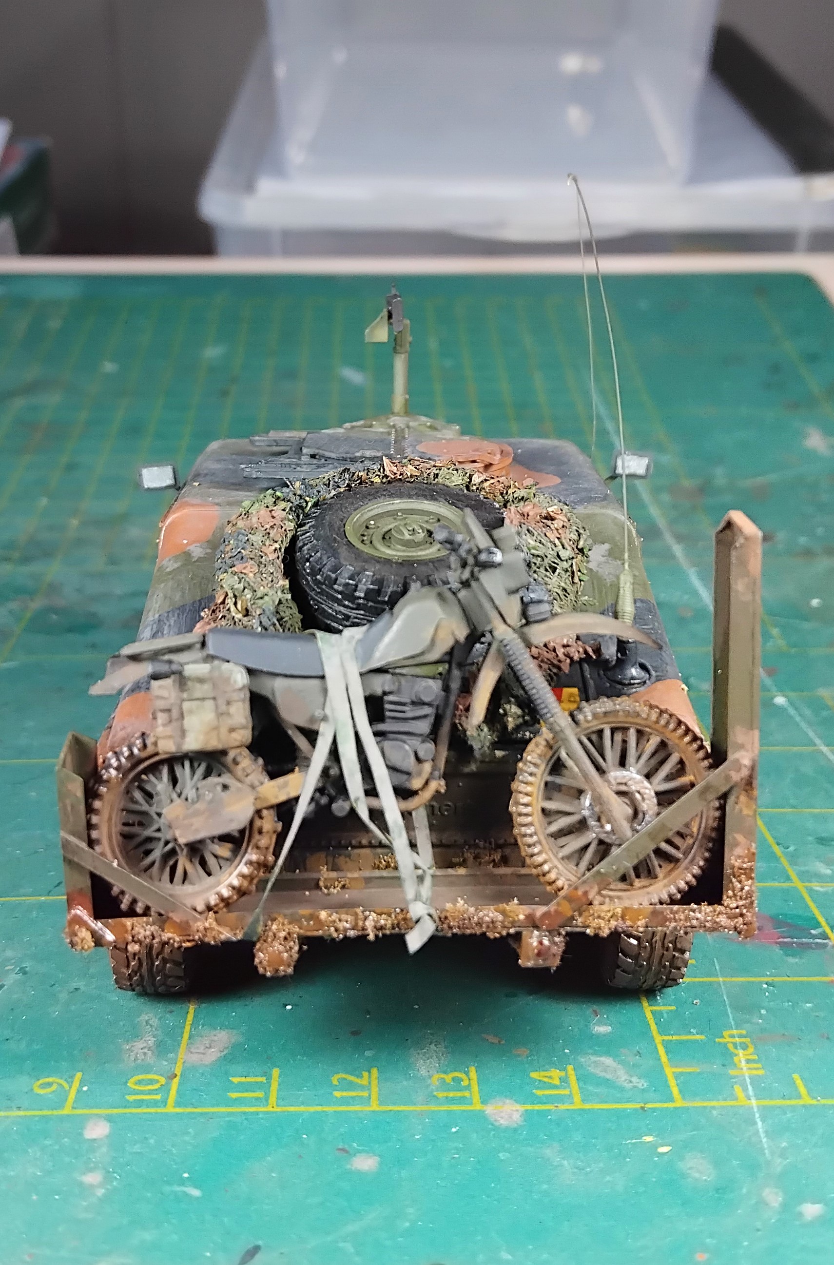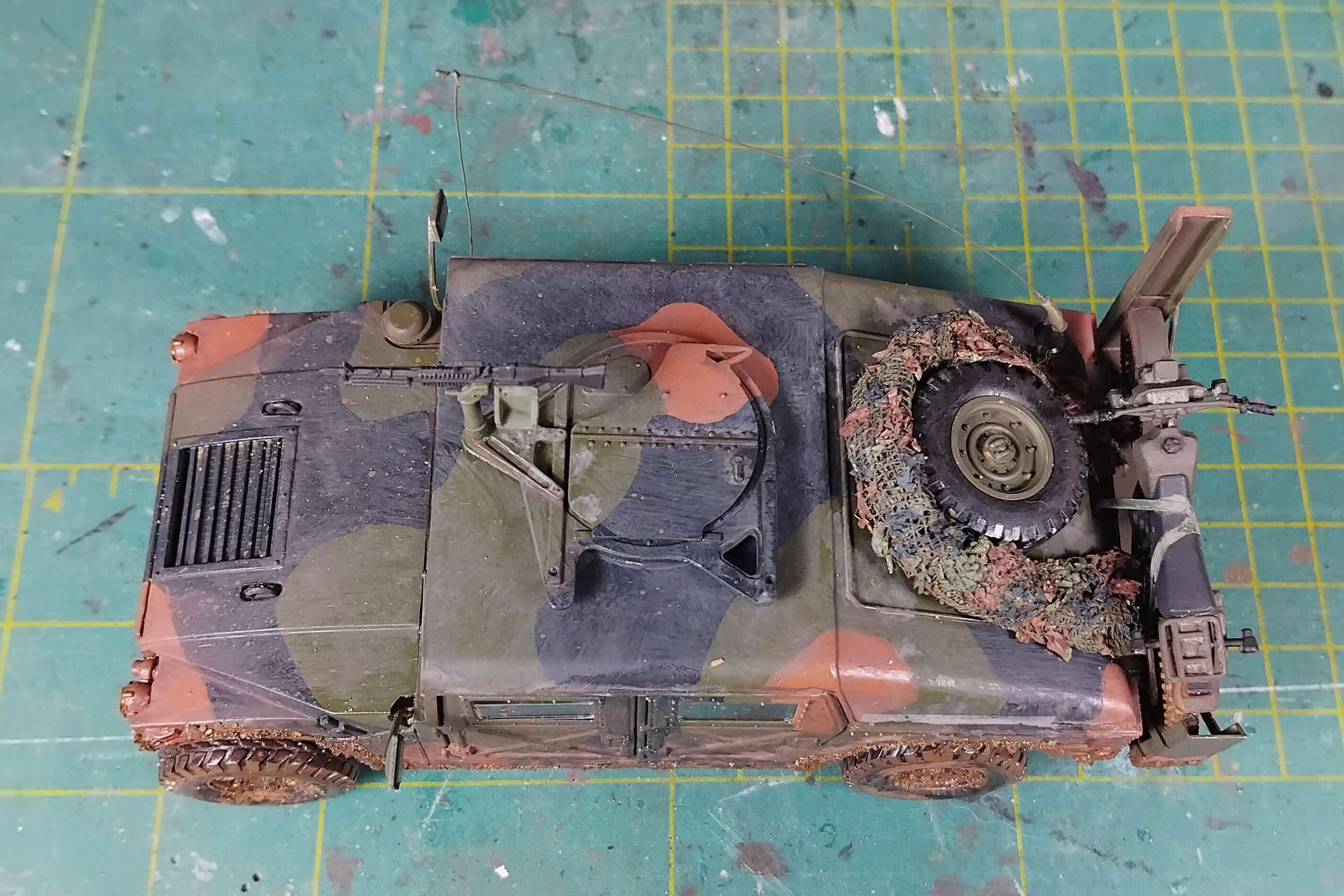 I added: tactical tape to the front light, a homemade camouflage net, made out of medical gauze, oregano and railwayscenery granulate. The tiedown strap is maskingtape (paper becomes soft, when painted!) and the mud is a mix of paint, varnish, grass and railway dirt.