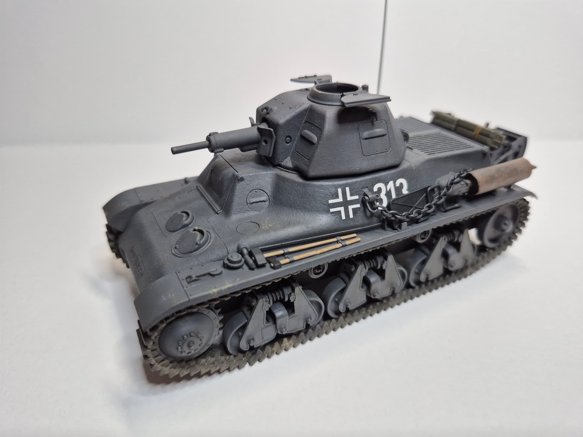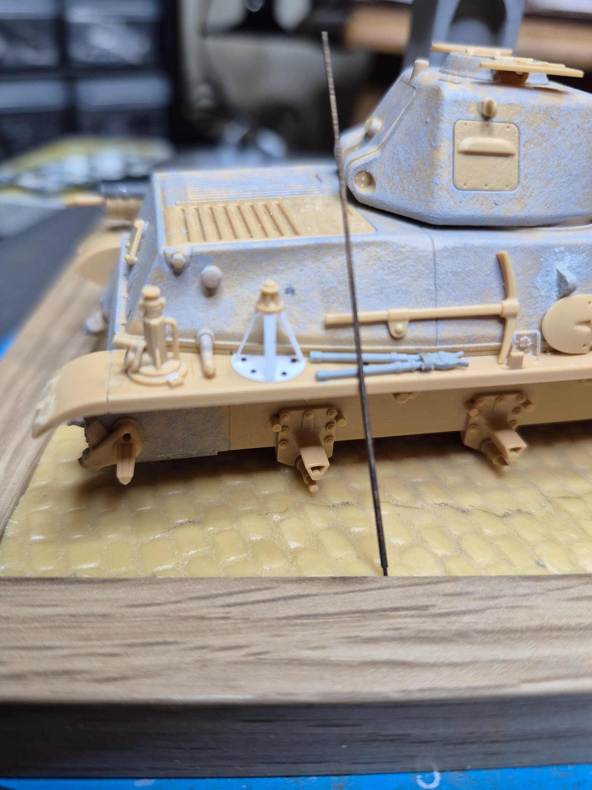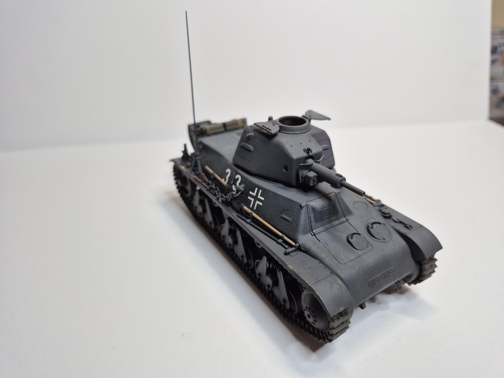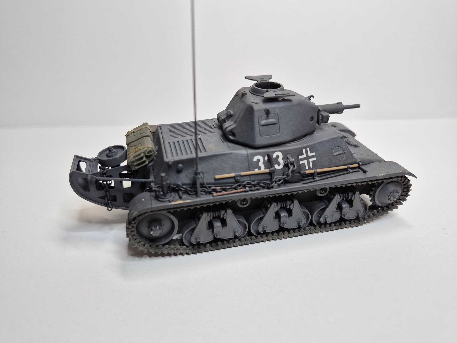 Added the raised German antenna base. Tamiya has the base mounted on the left fender with no elevated base.