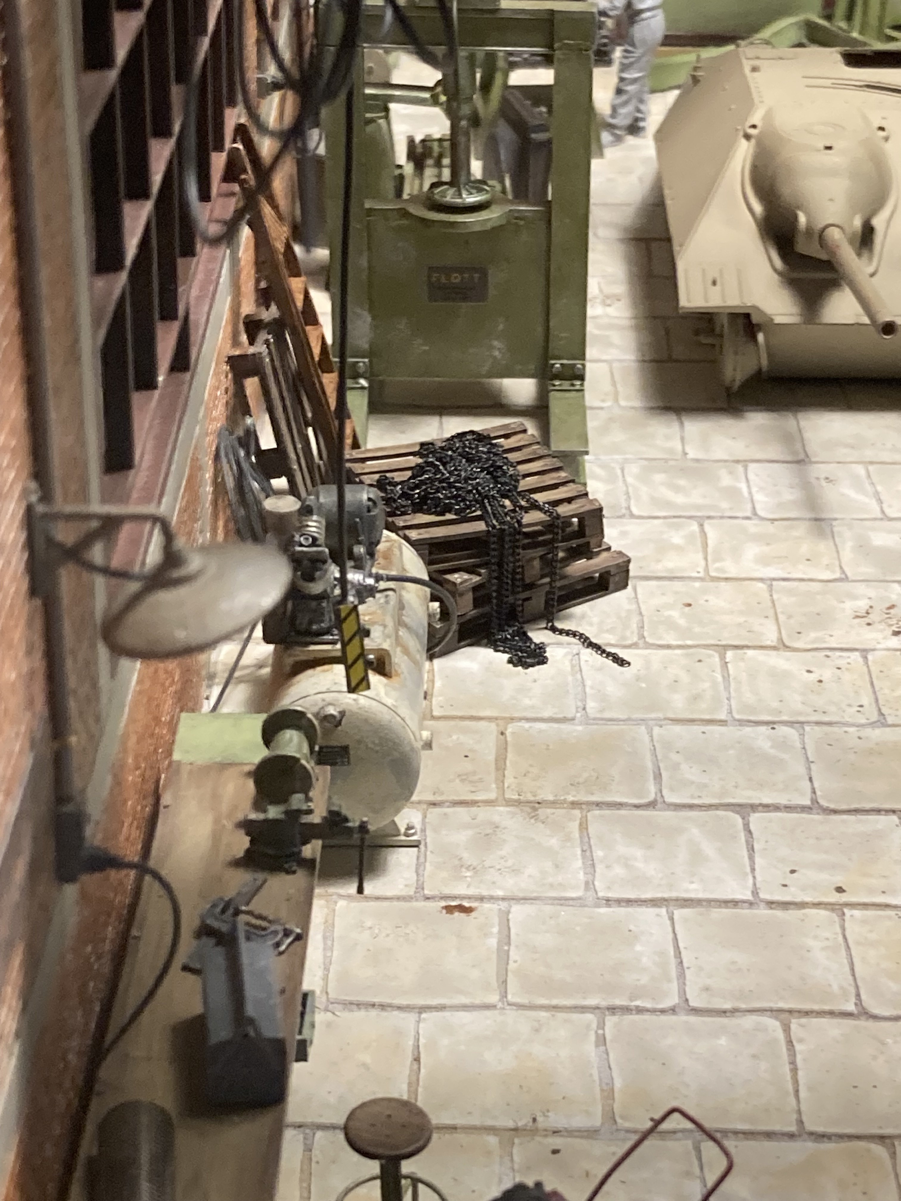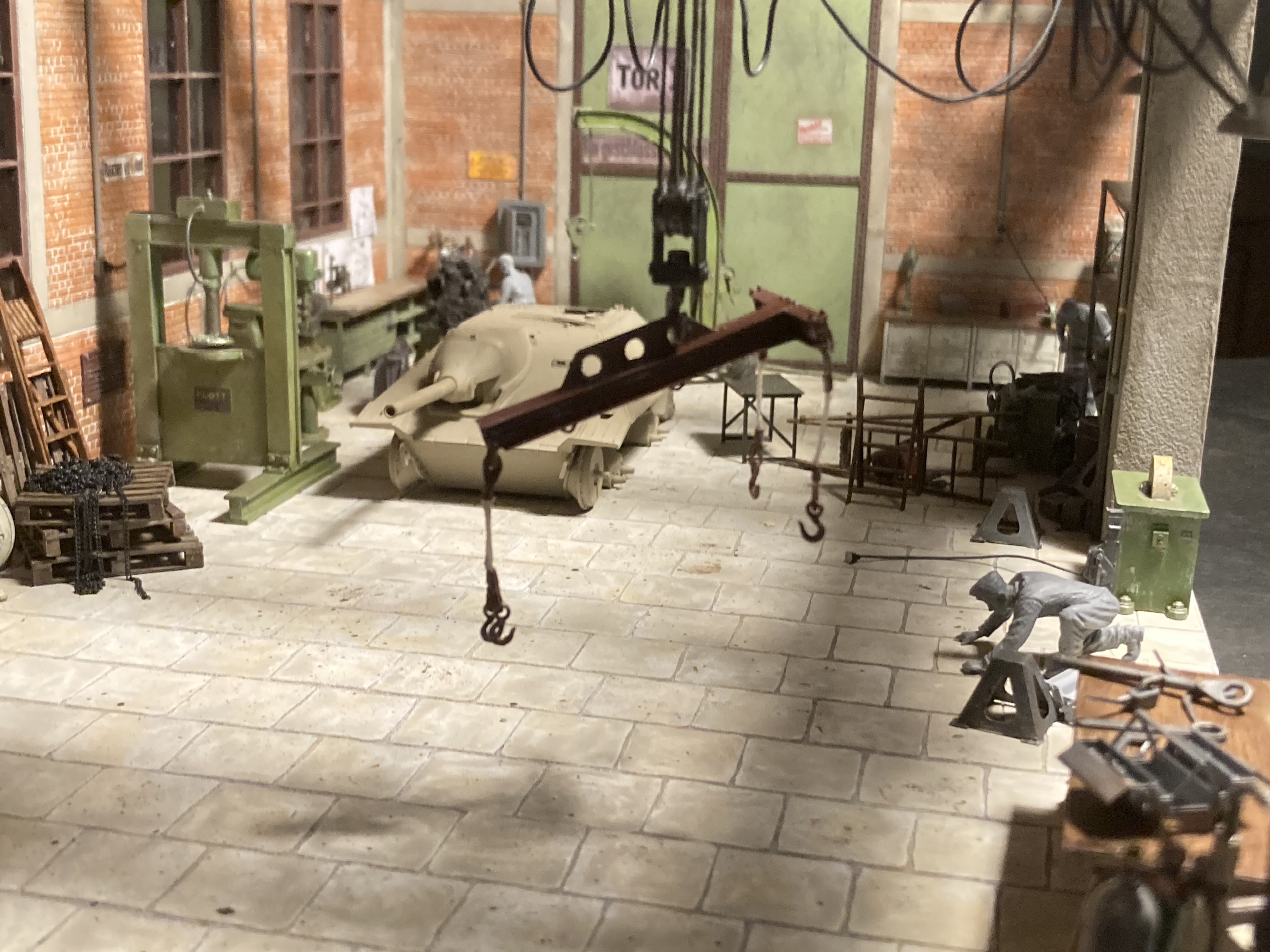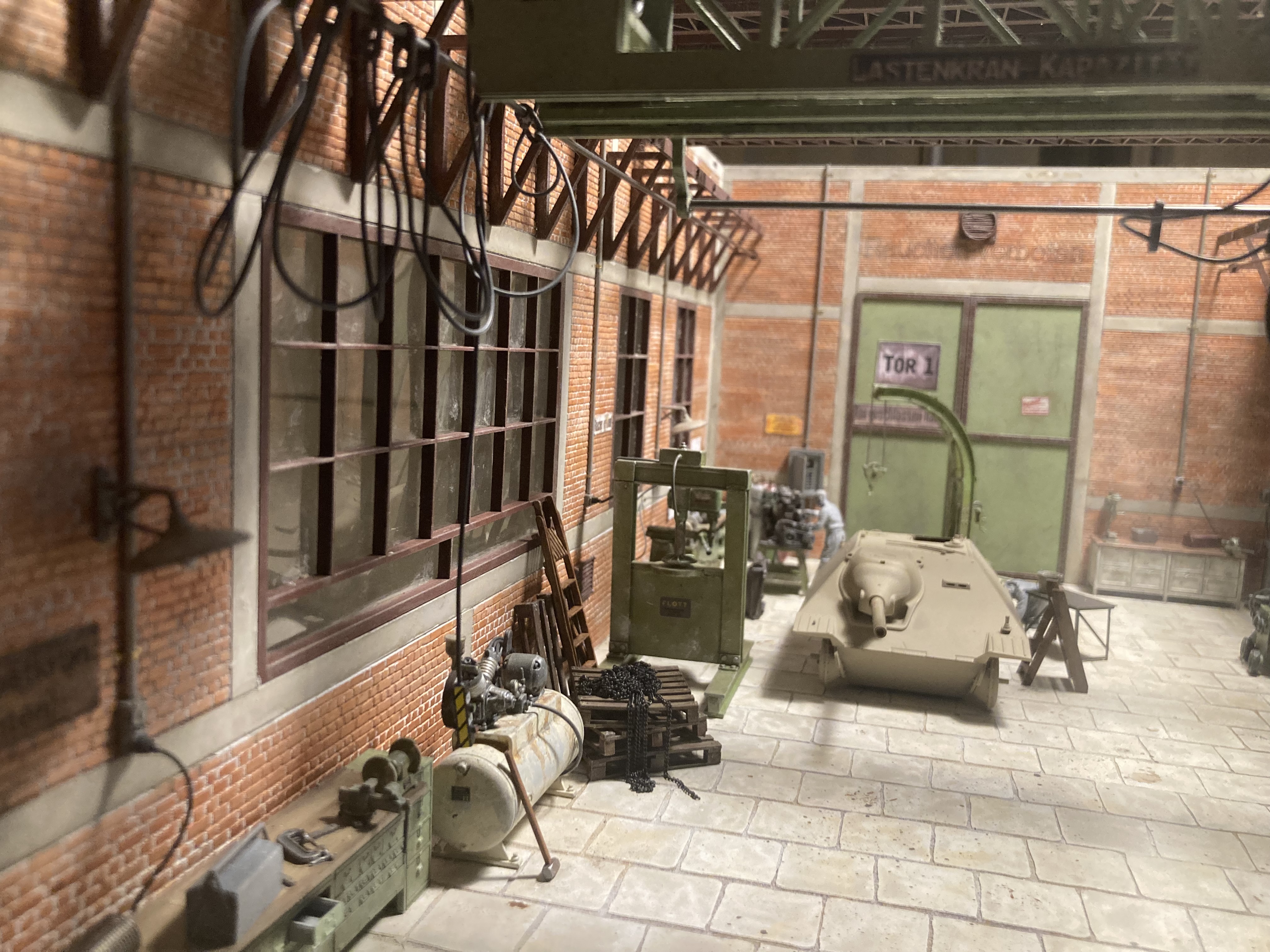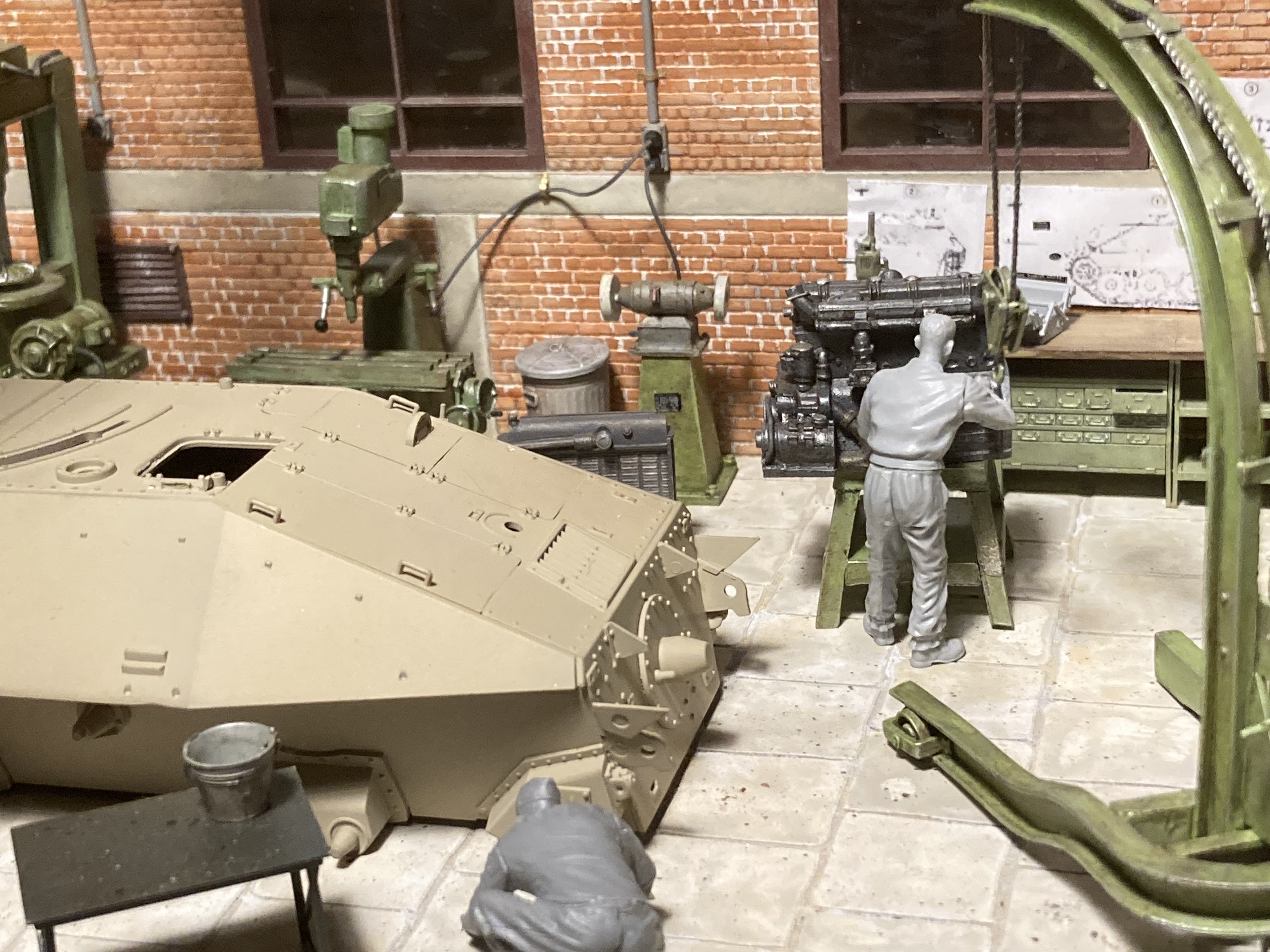 I can see the tank isn’t necessarily in its final state, but as a result I’m unclear how it got to its current position without wheels? I’m no expert, but would have thought the wheels/hull would have been finalised before the gun & upper plates were lowered into place? Unless perhaps it’s under repair rather than construction, but even so wouldn’t it be resting on a solid platform to receive the wheels again? Maybe the answer is the overhead crane’s good to lift 16 tonnes, it’s all-up weight?