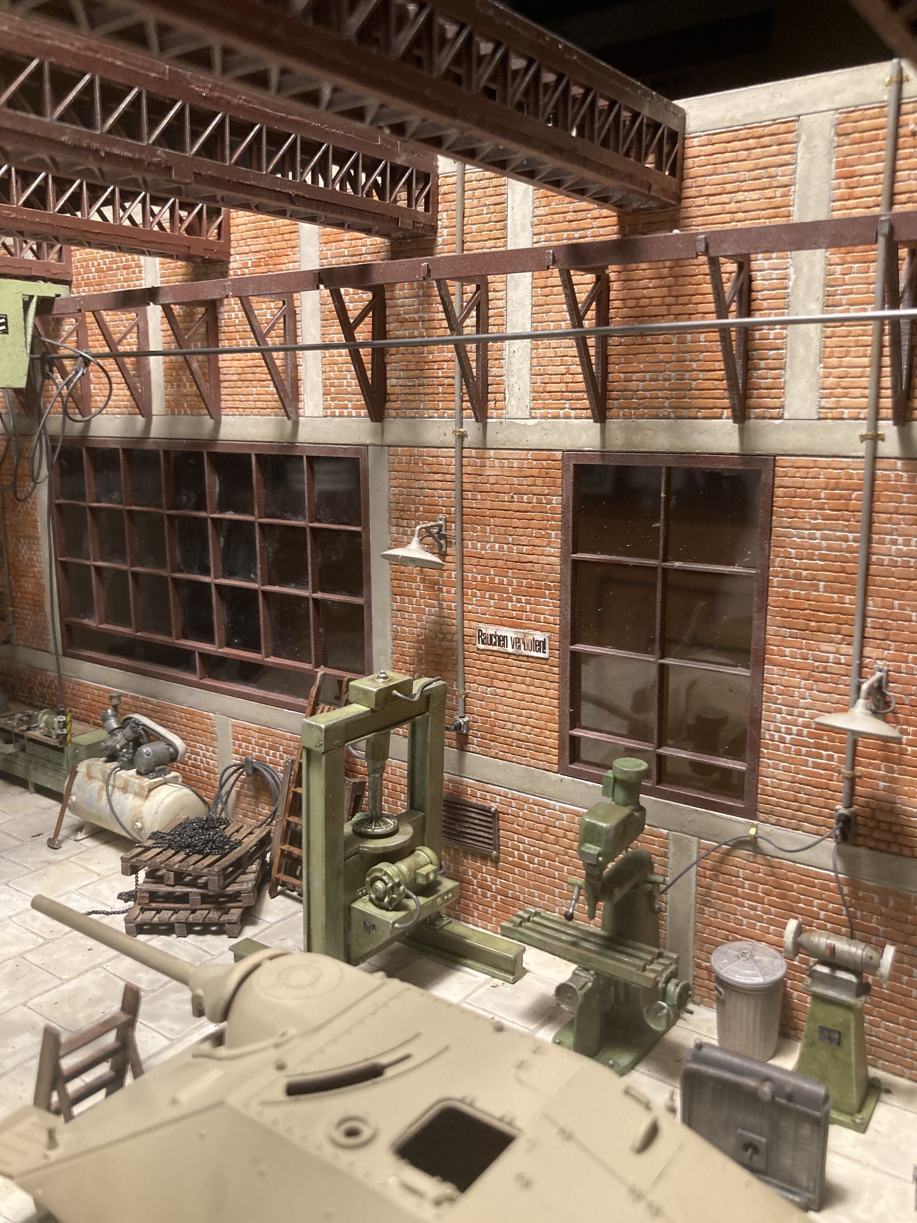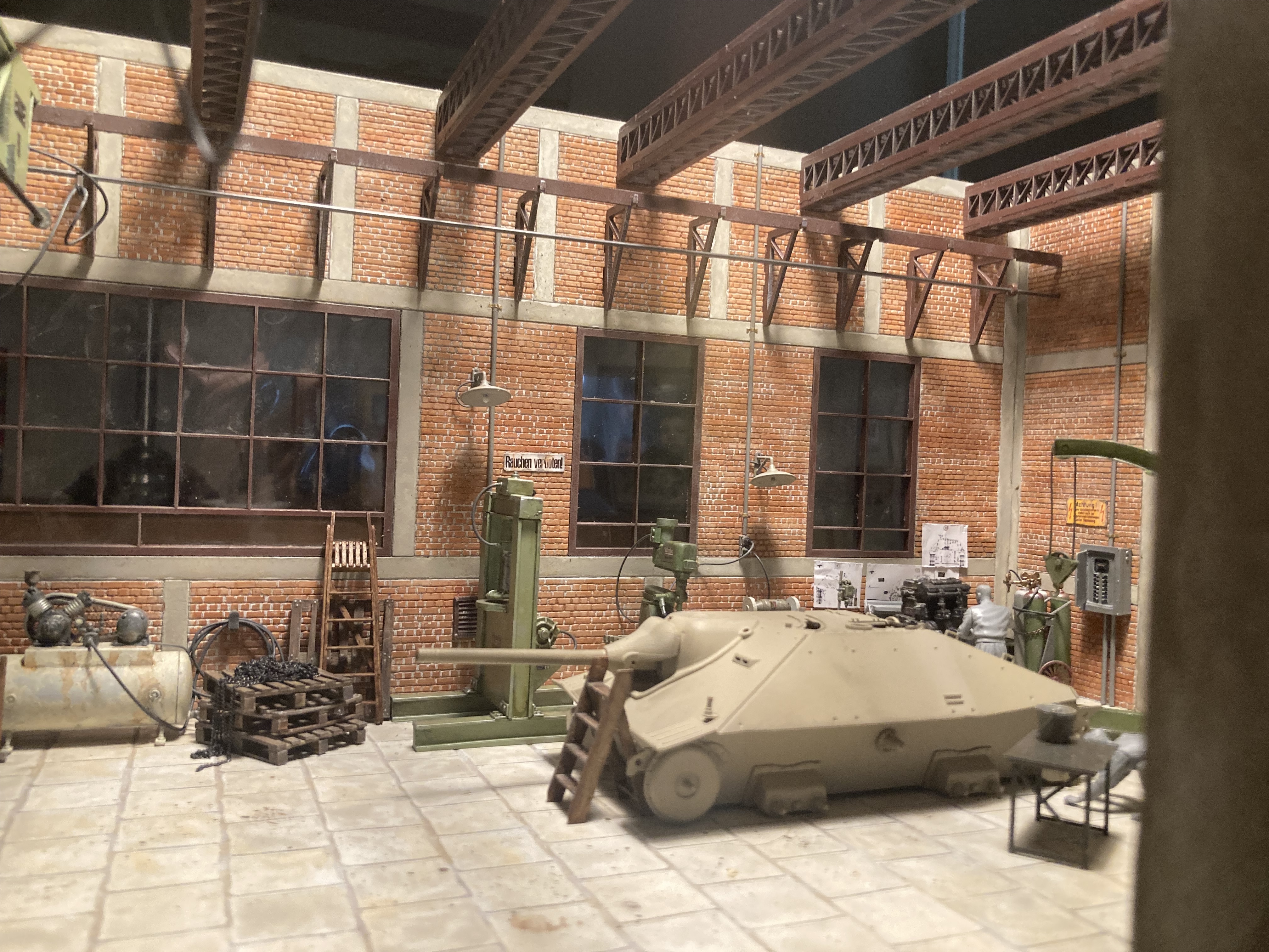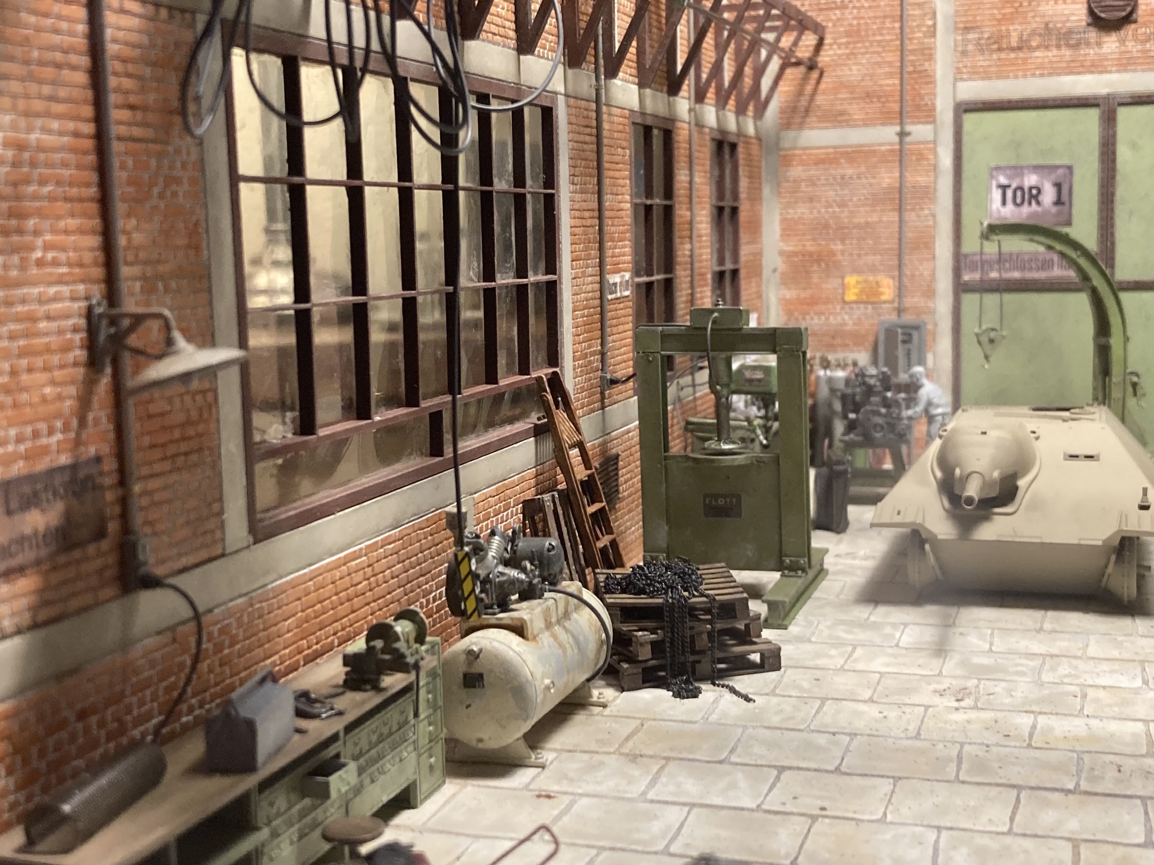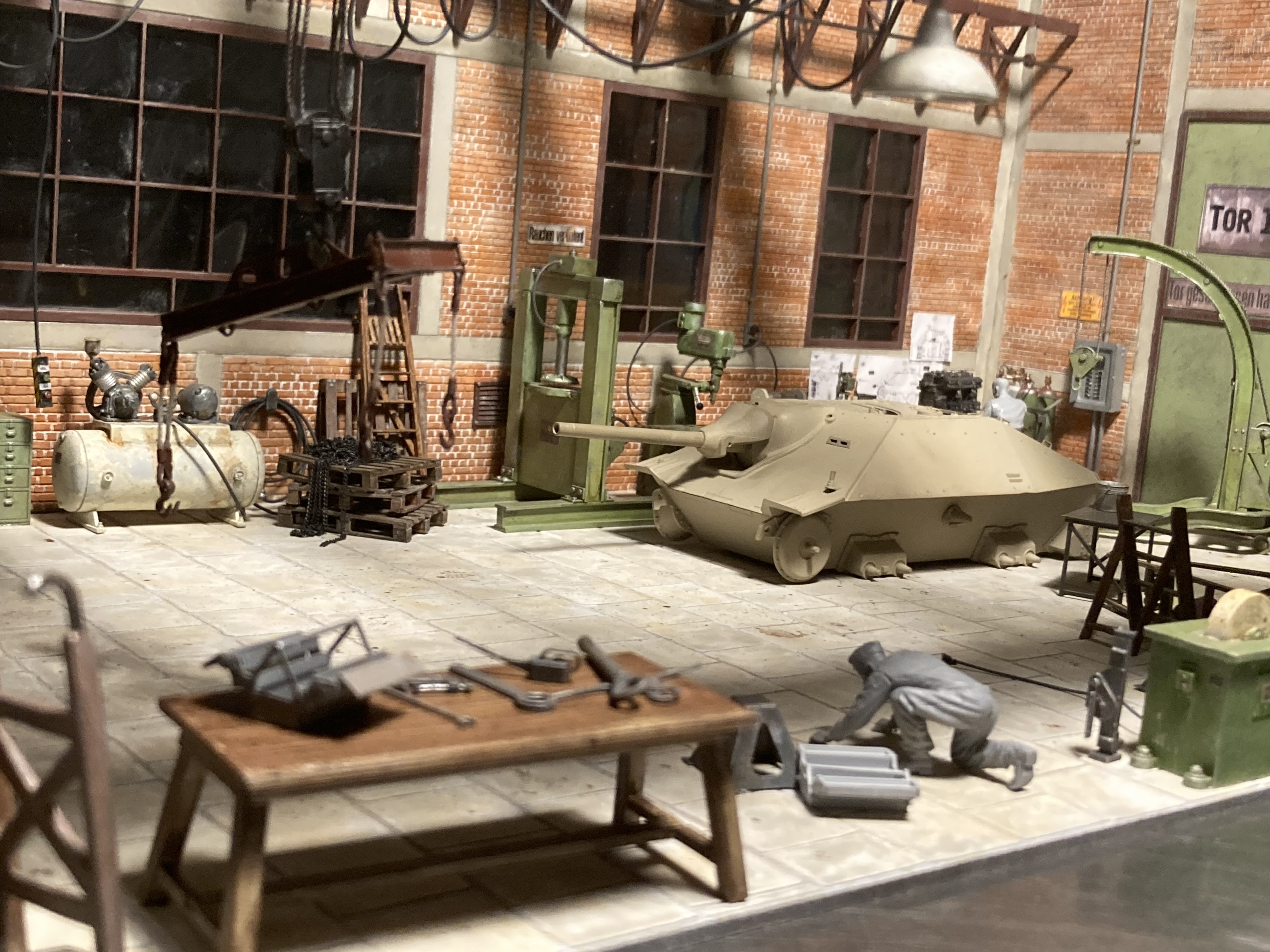 I can see the tank isn’t necessarily in its final state, but as a result I’m unclear how it got to its current position without wheels? I’m no expert, but would have thought the wheels/hull would have been finalised before the gun & upper plates were lowered into place? Unless perhaps it’s under repair rather than construction, but even so wouldn’t it be resting on a solid platform to receive the wheels again? Maybe the answer is the overhead crane’s good to lift 16 tonnes, it’s all-up weight?