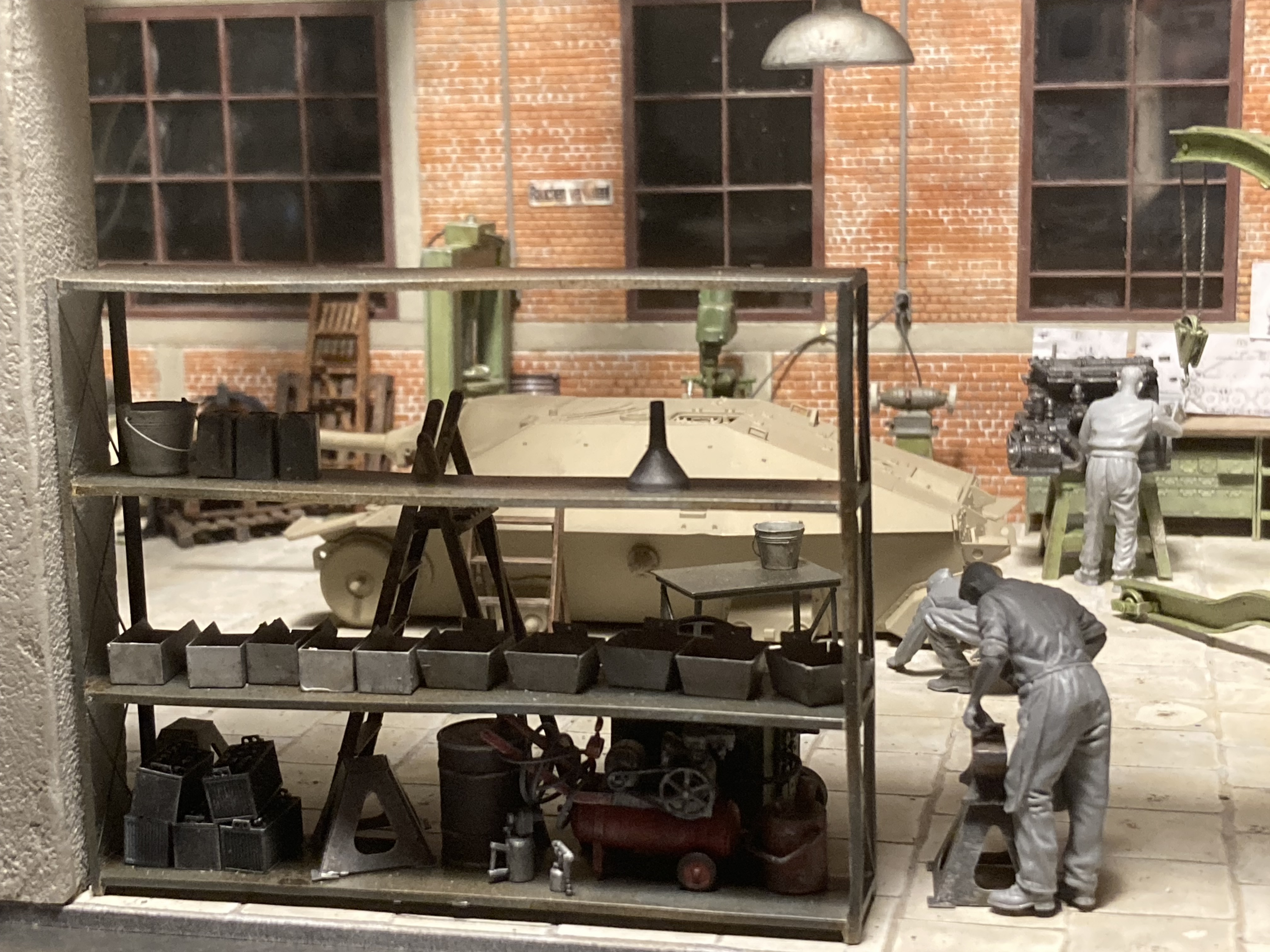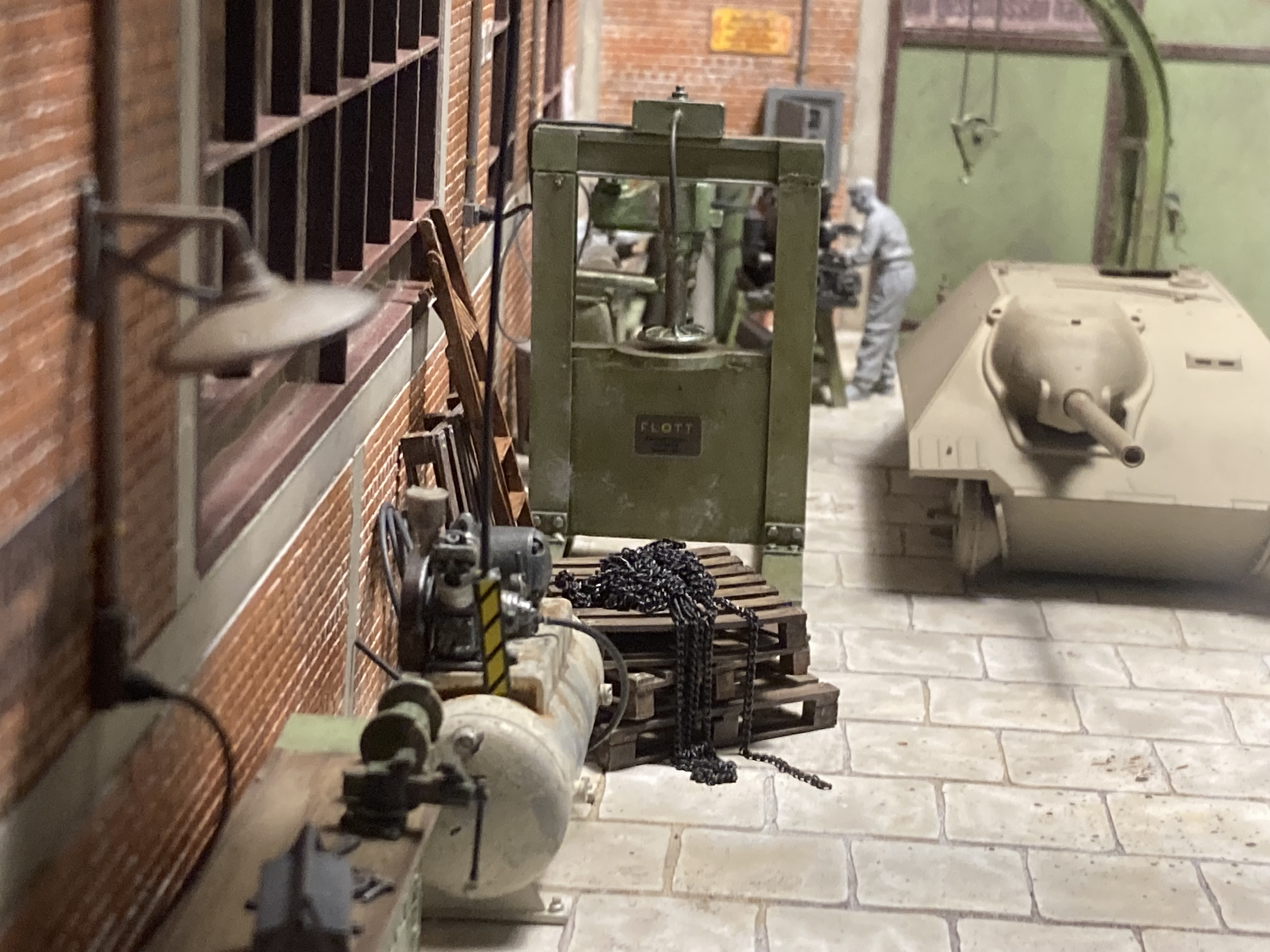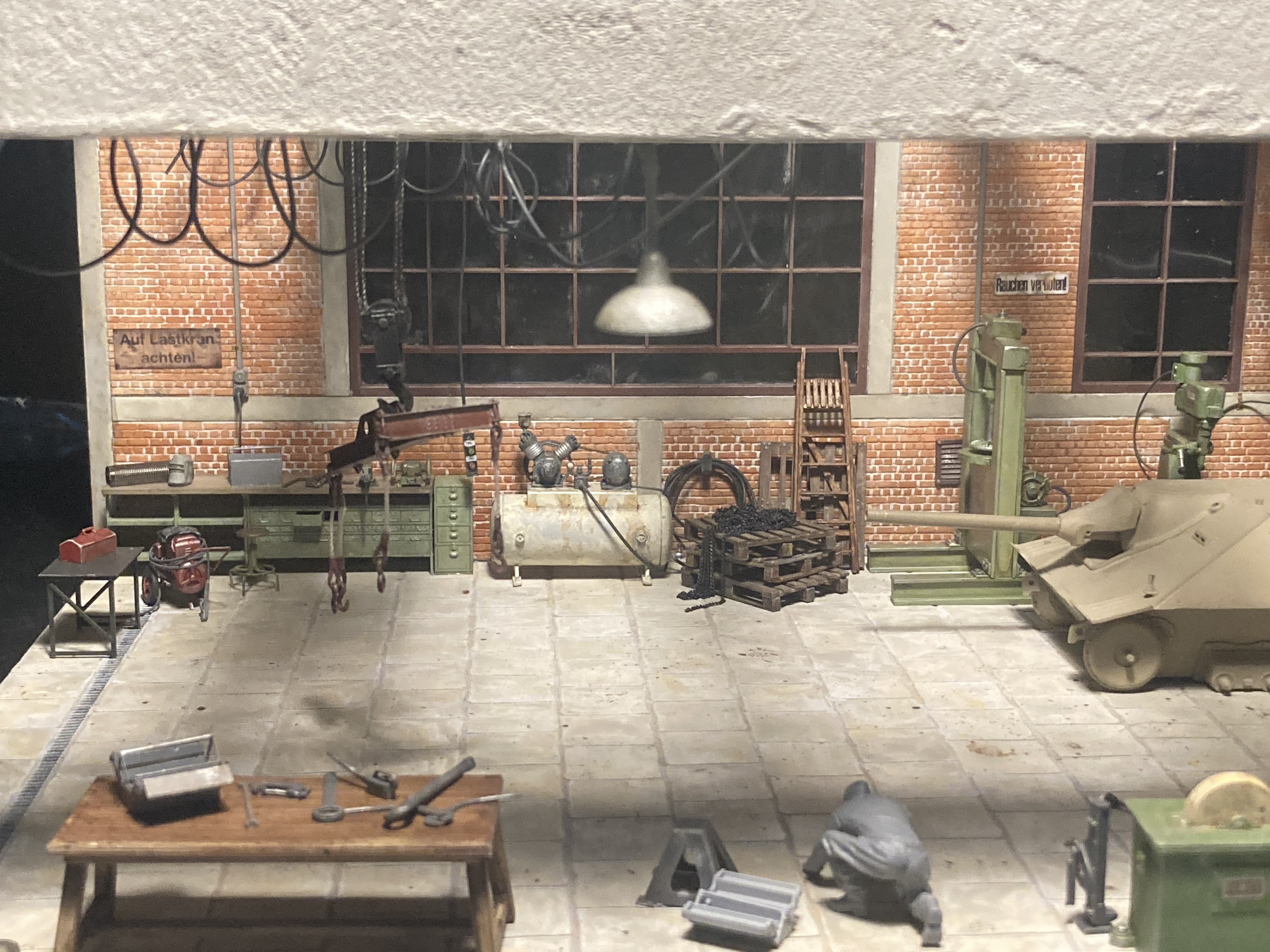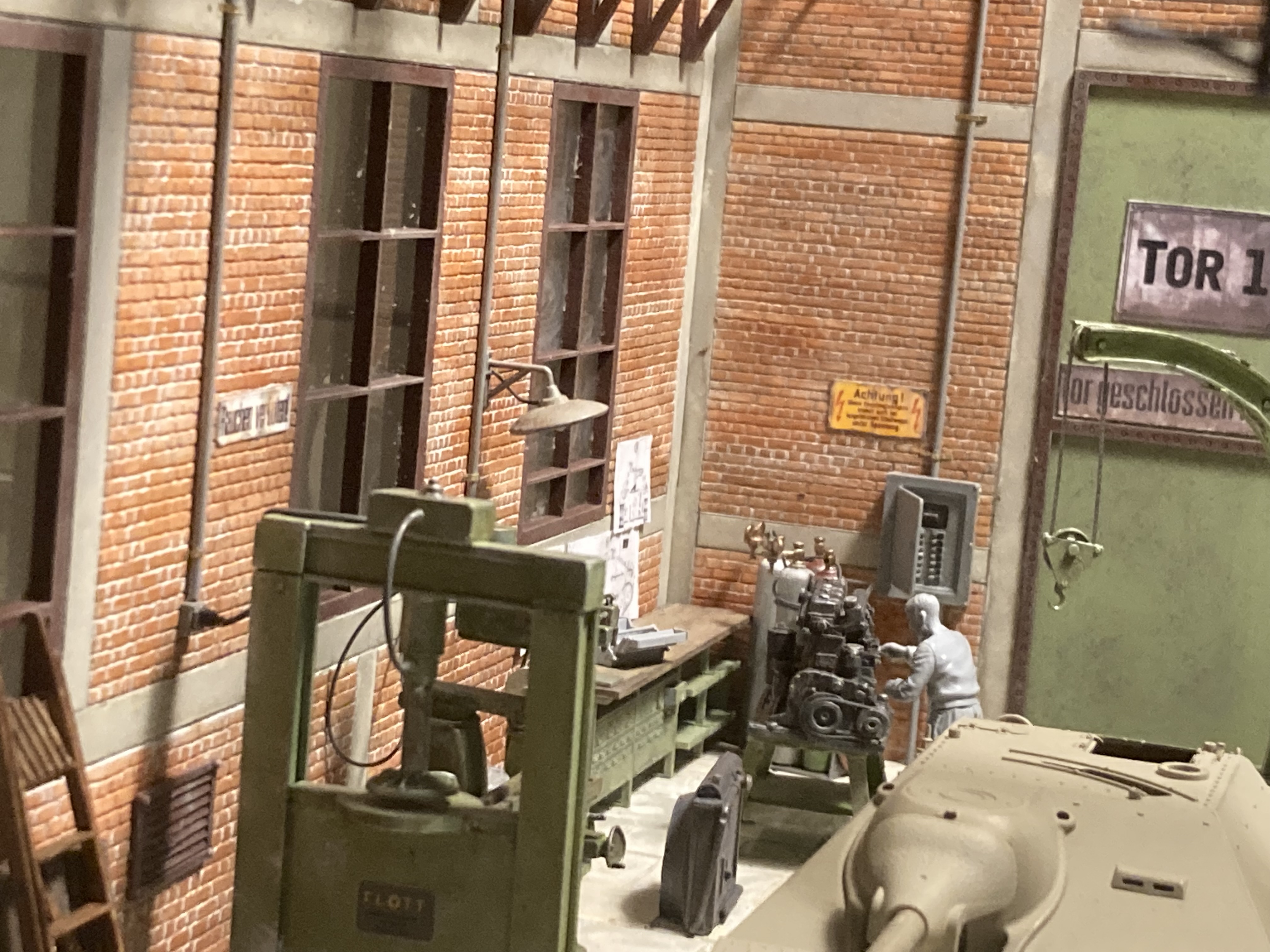I can see the tank isn’t necessarily in its final state, but as a result I’m unclear how it got to its current position without wheels? I’m no expert, but would have thought the wheels/hull would have been finalised before the gun & upper plates were lowered into place? Unless perhaps it’s under repair rather than construction, but even so wouldn’t it be resting on a solid platform to receive the wheels again? Maybe the answer is the overhead crane’s good to lift 16 tonnes, it’s all-up weight?
