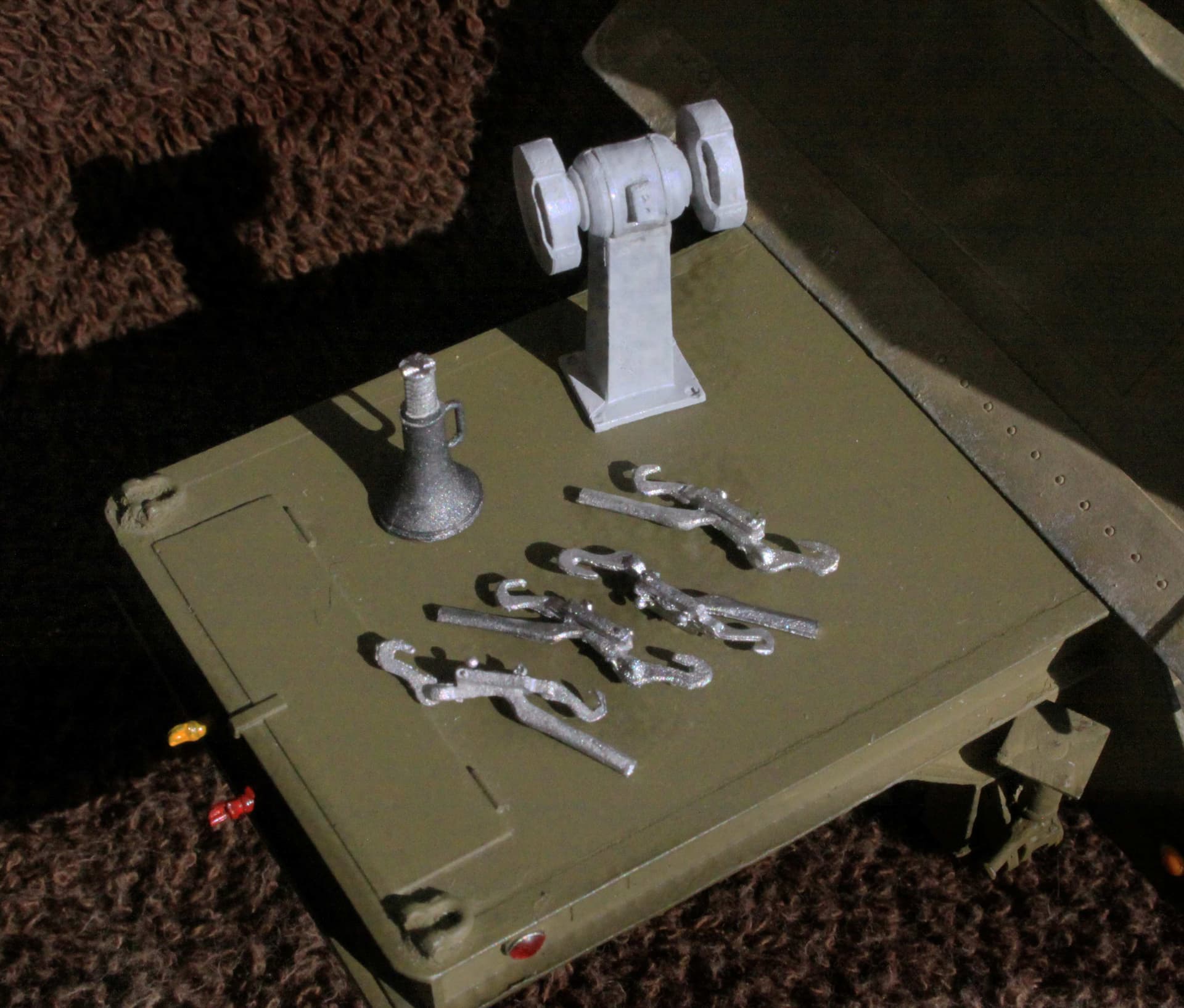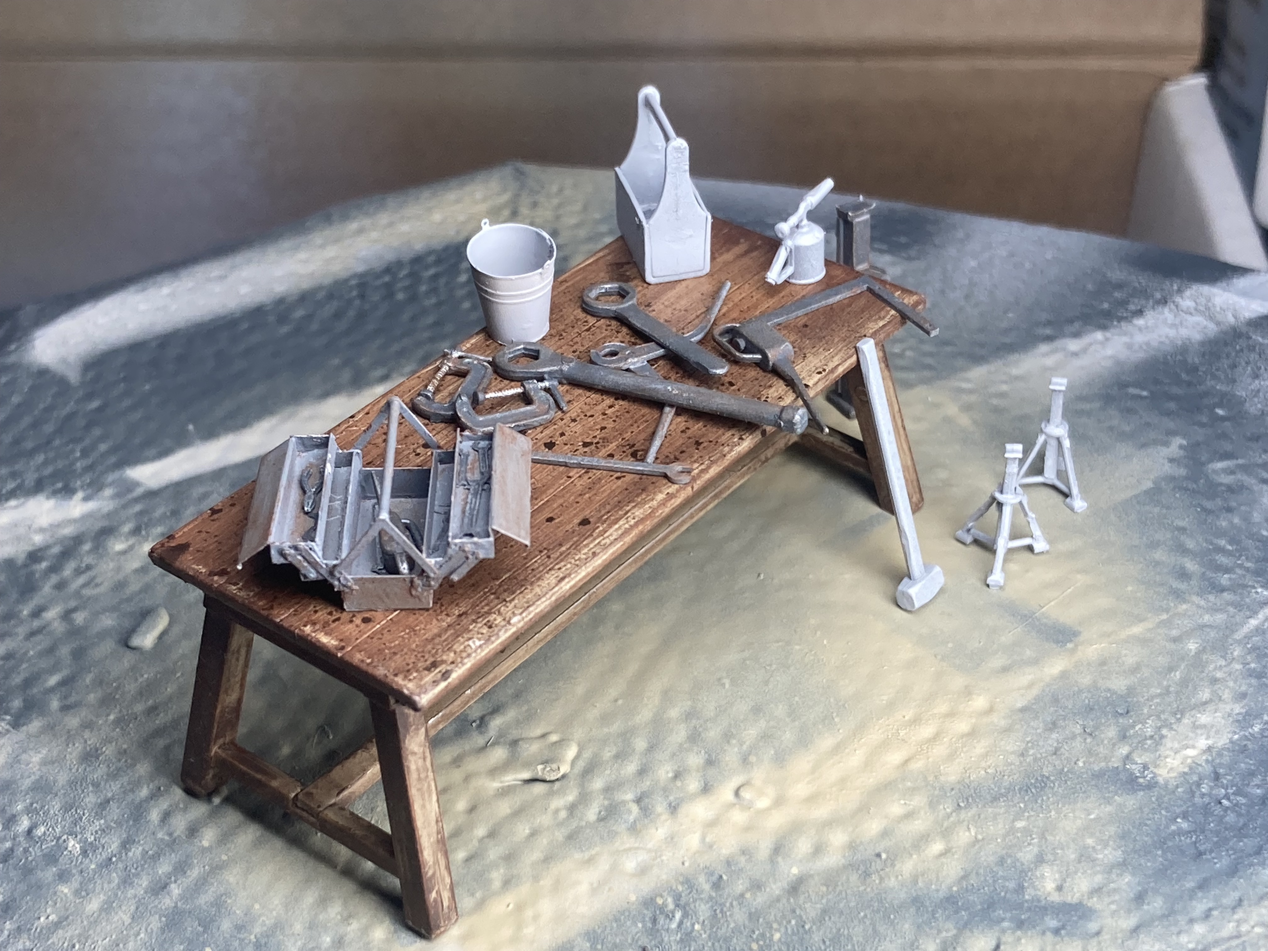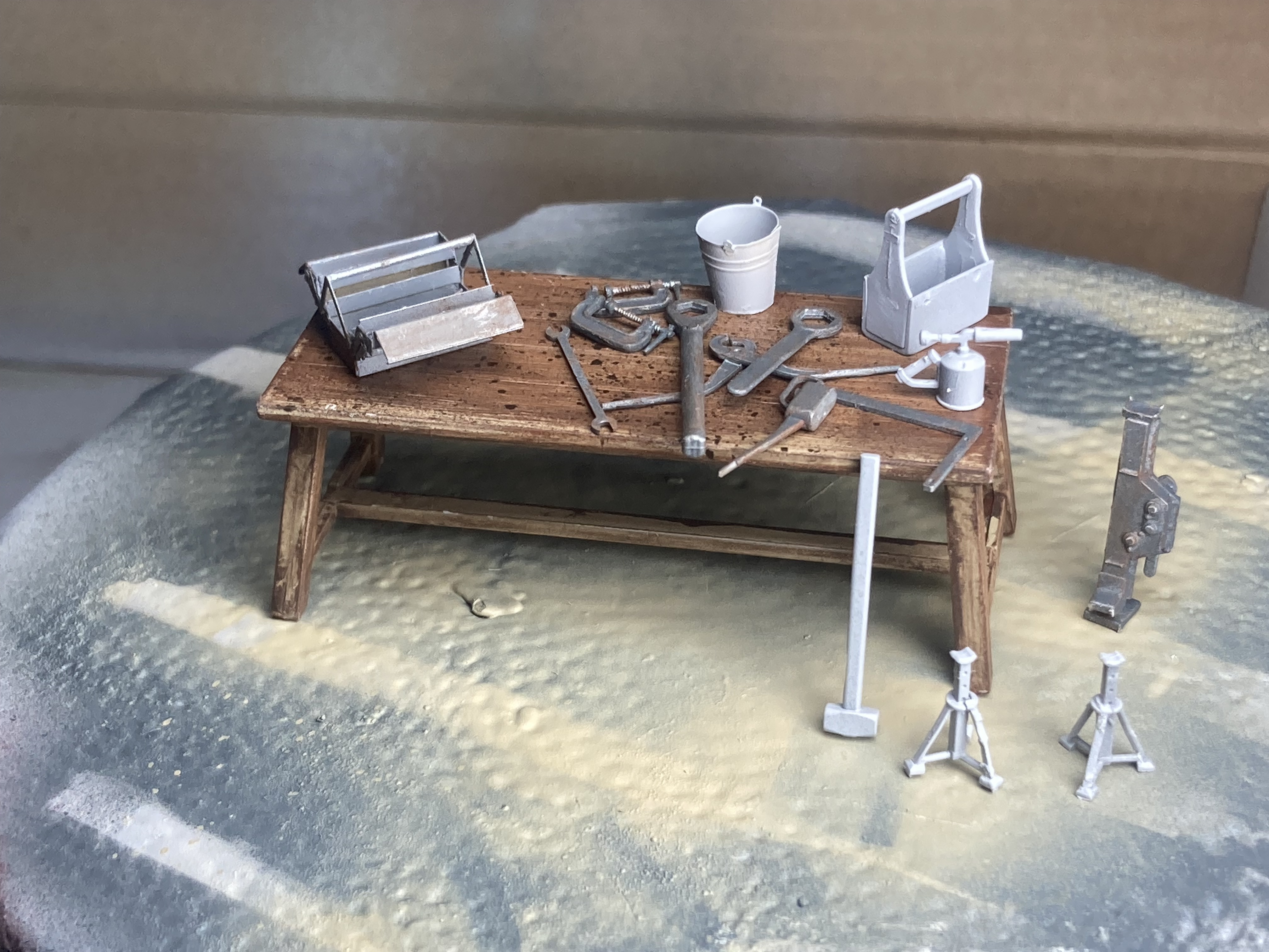 You might want to check out “Wiseman Model Products” in Paris, Kentucky for several assortments of very well done white metal machine shop tools and bottle jacks. Their large railroad car jack in 1/48th becomes a slightly smaller jack in 1/35th.