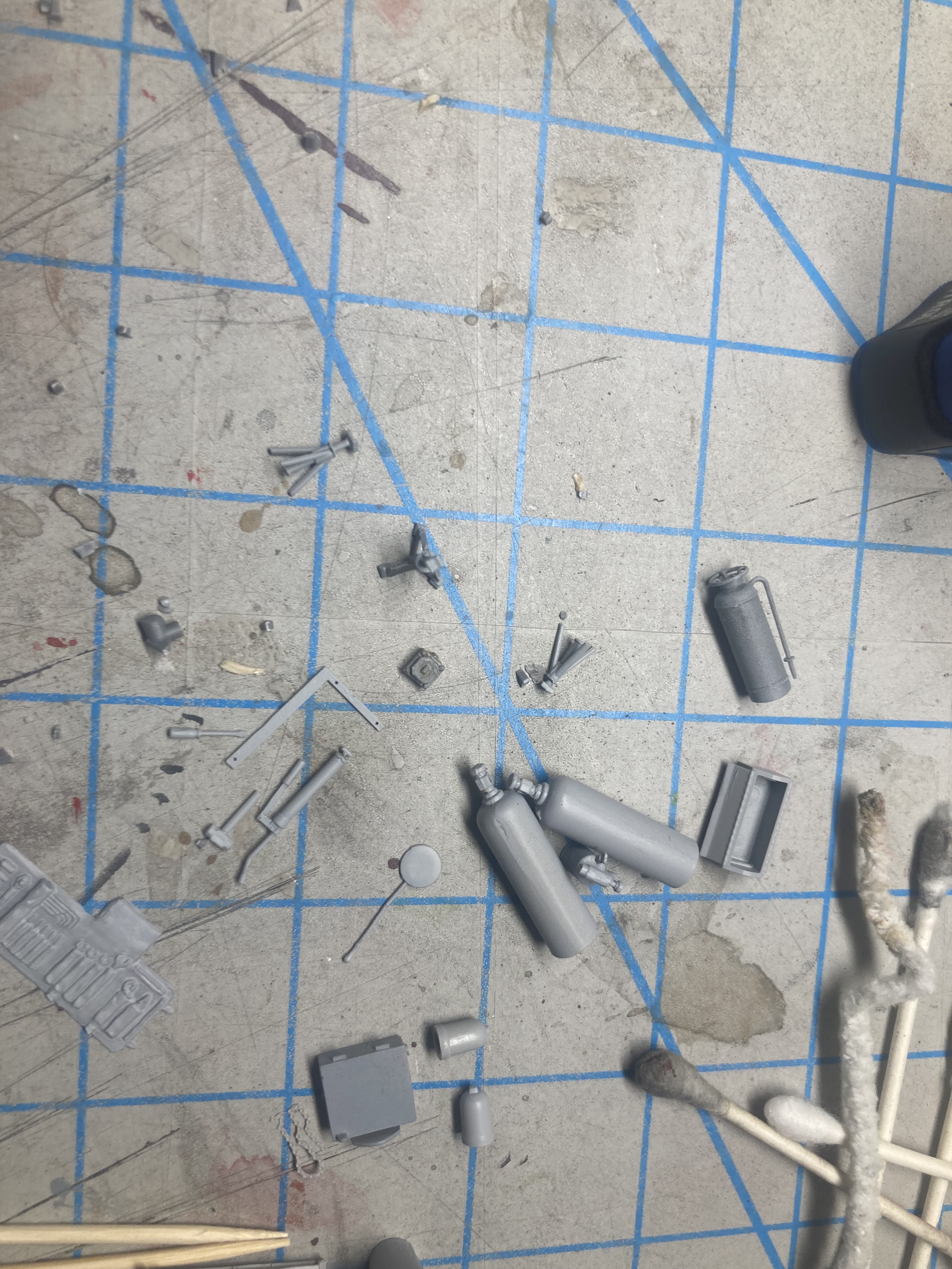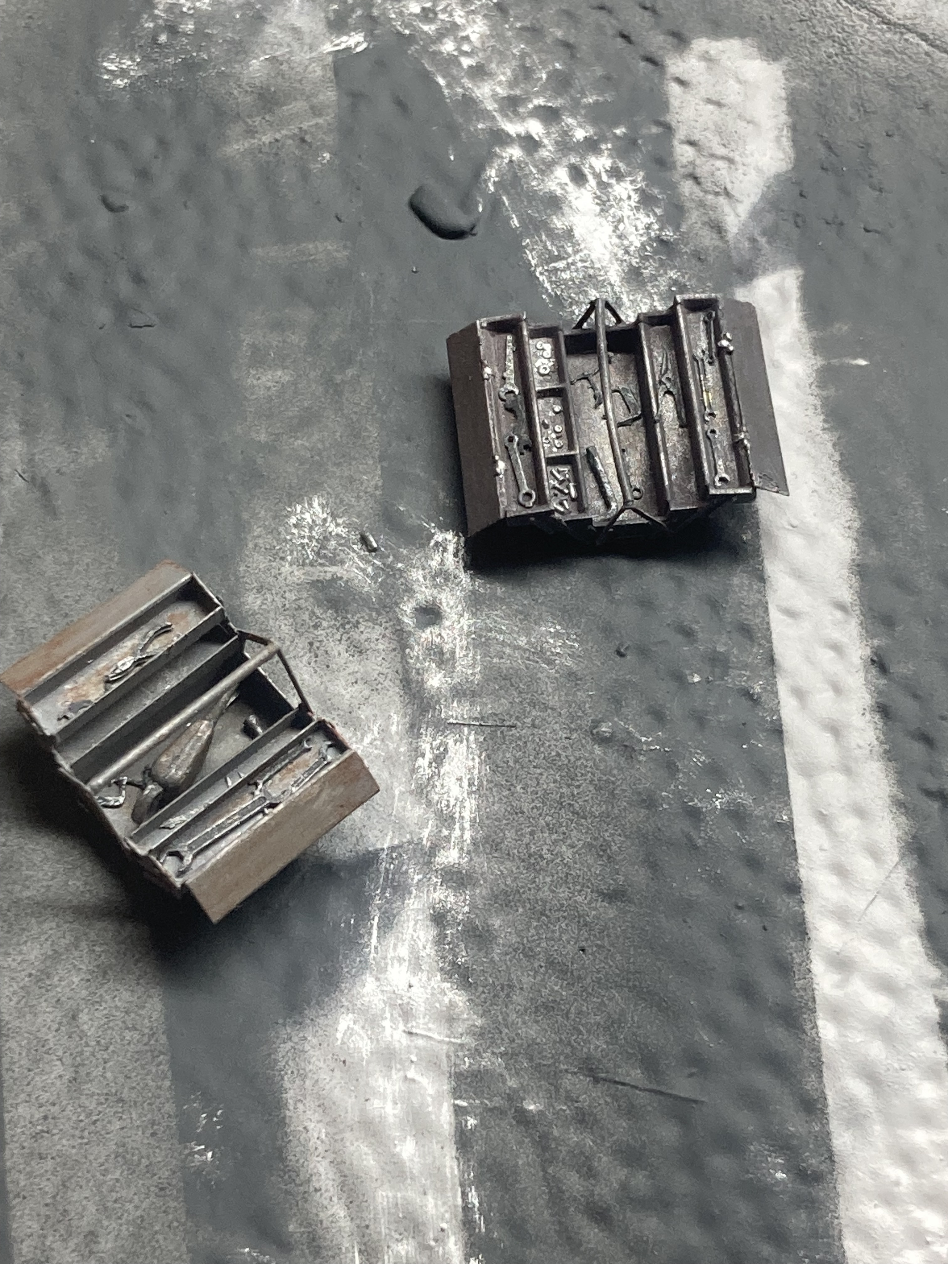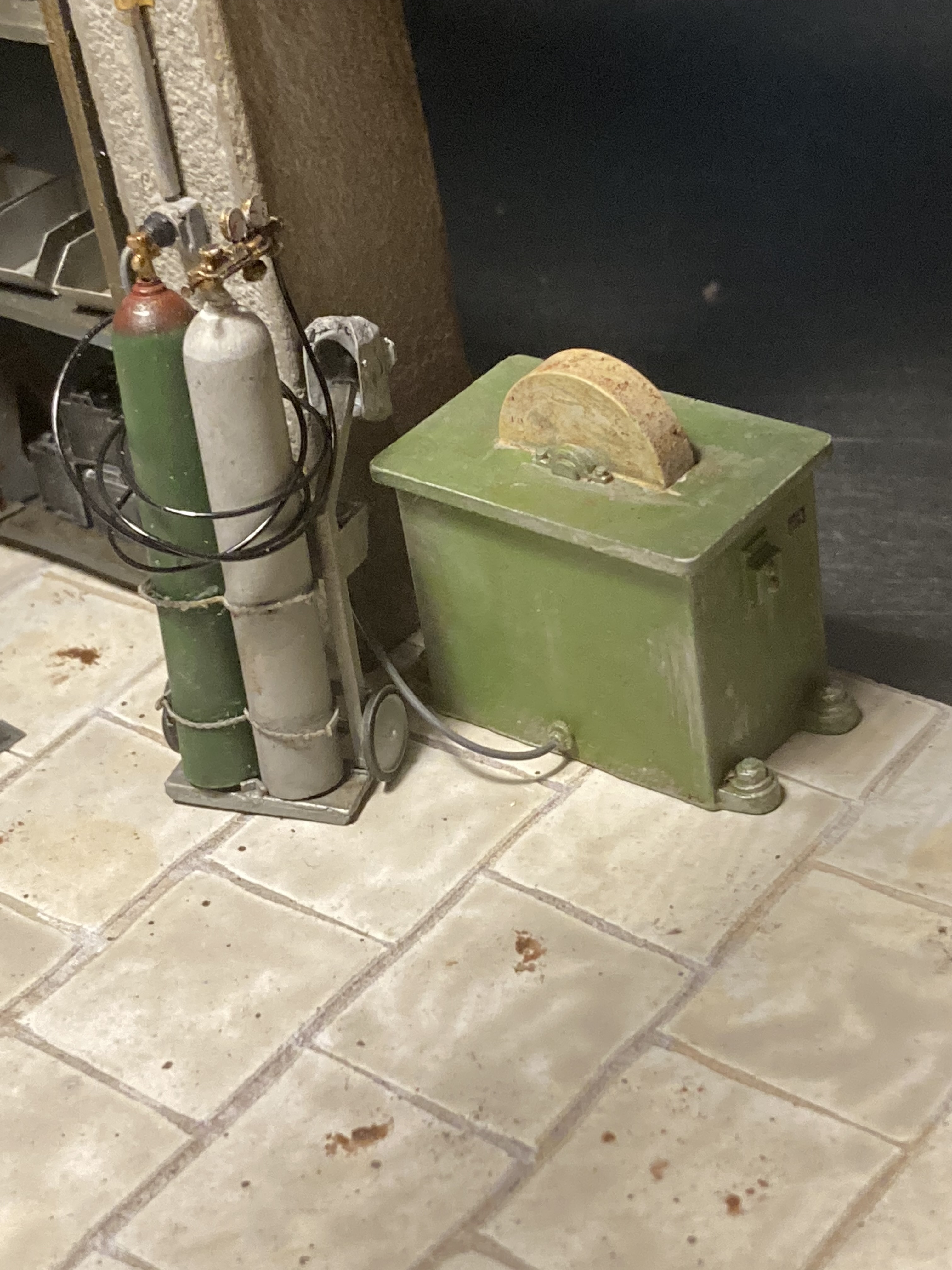 You might want to check out “Wiseman Model Products” in Paris, Kentucky for several assortments of very well done white metal machine shop tools and bottle jacks. Their large railroad car jack in 1/48th becomes a slightly smaller jack in 1/35th.