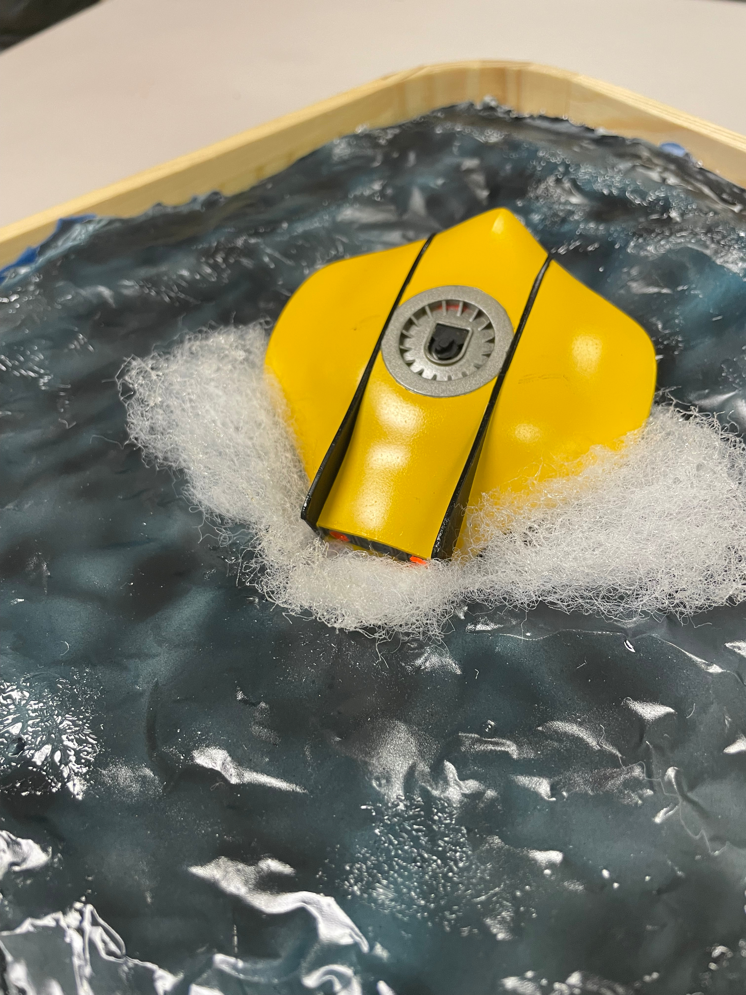 My local club had a group build … anything that flies except a plane or jet. My immediate thought was the flying sub from the old 60’s TV show “Voyage to the Bottom of the Sea”. I wanted to try adding lights to a model for the first time and setting the sub in water, which I have never done. I used two white lights in front, one red light in the cockpit and two orange lights for the engines. I followed a water technique I found on YouTube using aluminum foil. I set the whole scene in a box with small feet so I could have a place to put the battery and off/on switch. I learned a lot doing this build and received many positive comments.