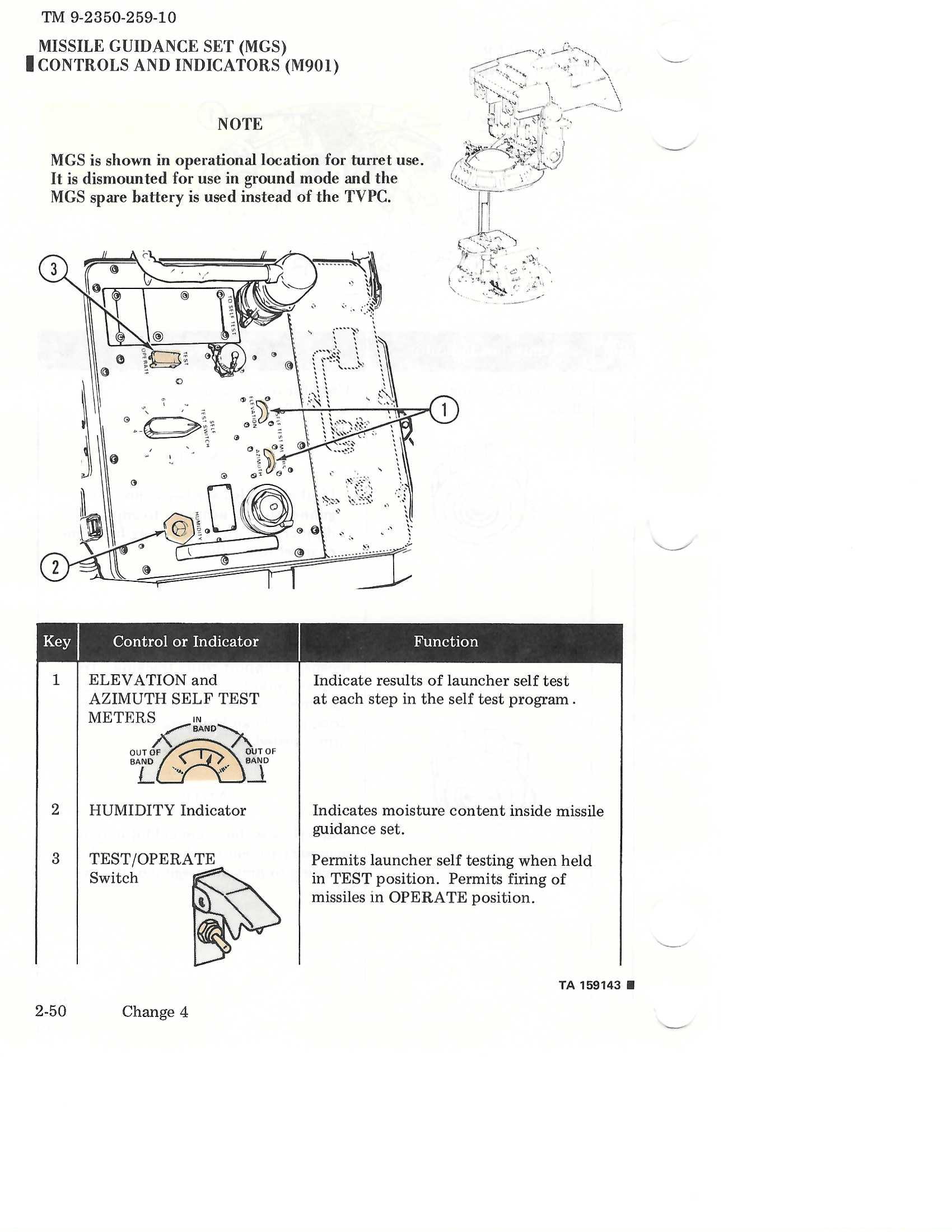 Right. Yellow band on the nose, red band on the rear for live, blue band for inert. The cable actually comes out of the bottom of the traversing unit, through the hole in the side of the pedestal, and plugs into the MGS with a 90° coupler. Hereās a diagram of the MGS: