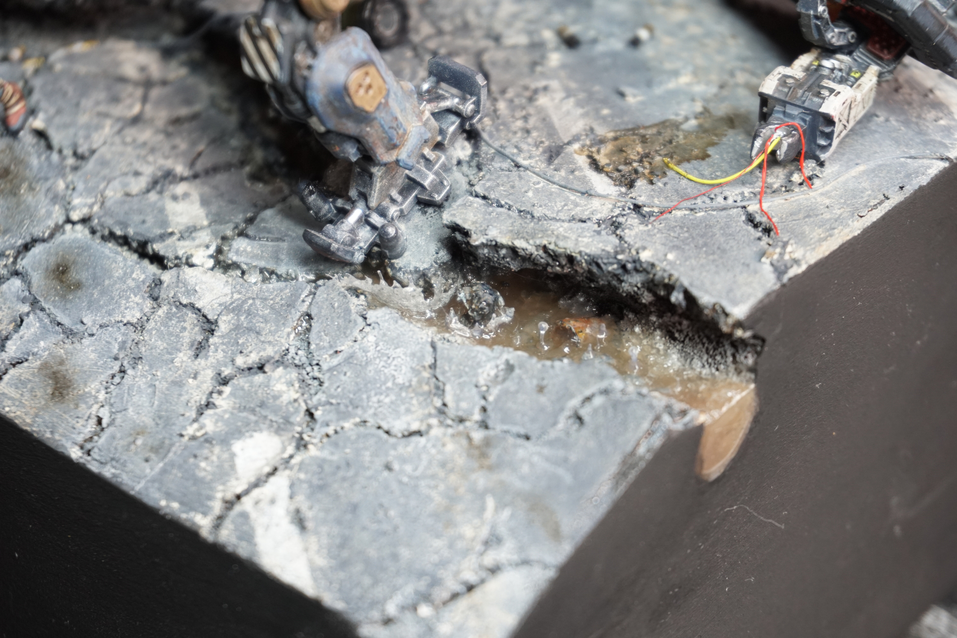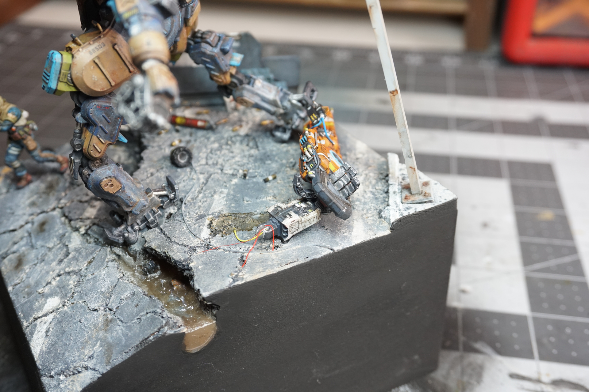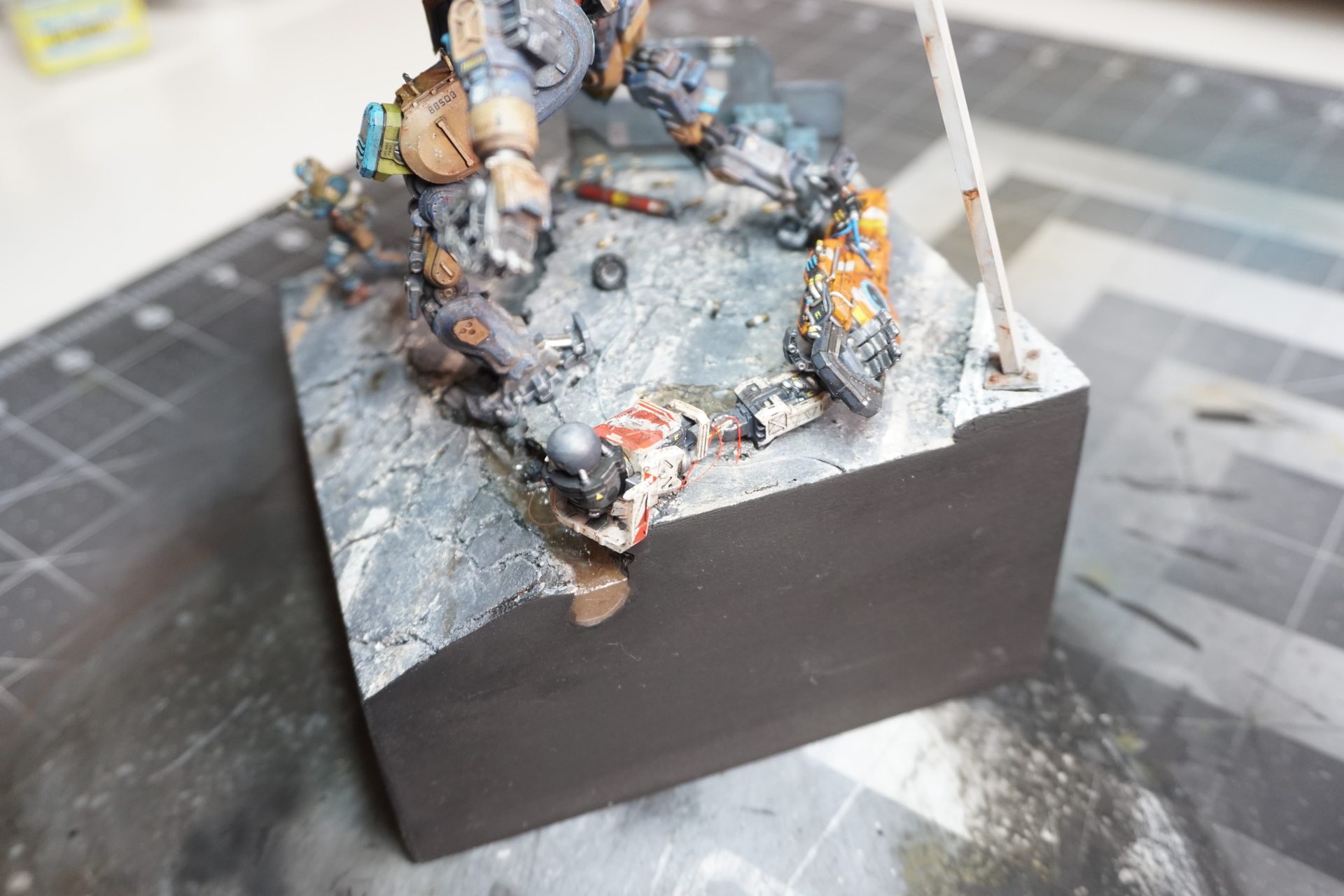 What I am looking for is some advice, as I feel that something is missing. The whole scene is not quite there. Also, I have no idea where to place the upper portion of the destroyed arm or if it should be included at all. Any advice from a fresh pair of eyes is appreciated!