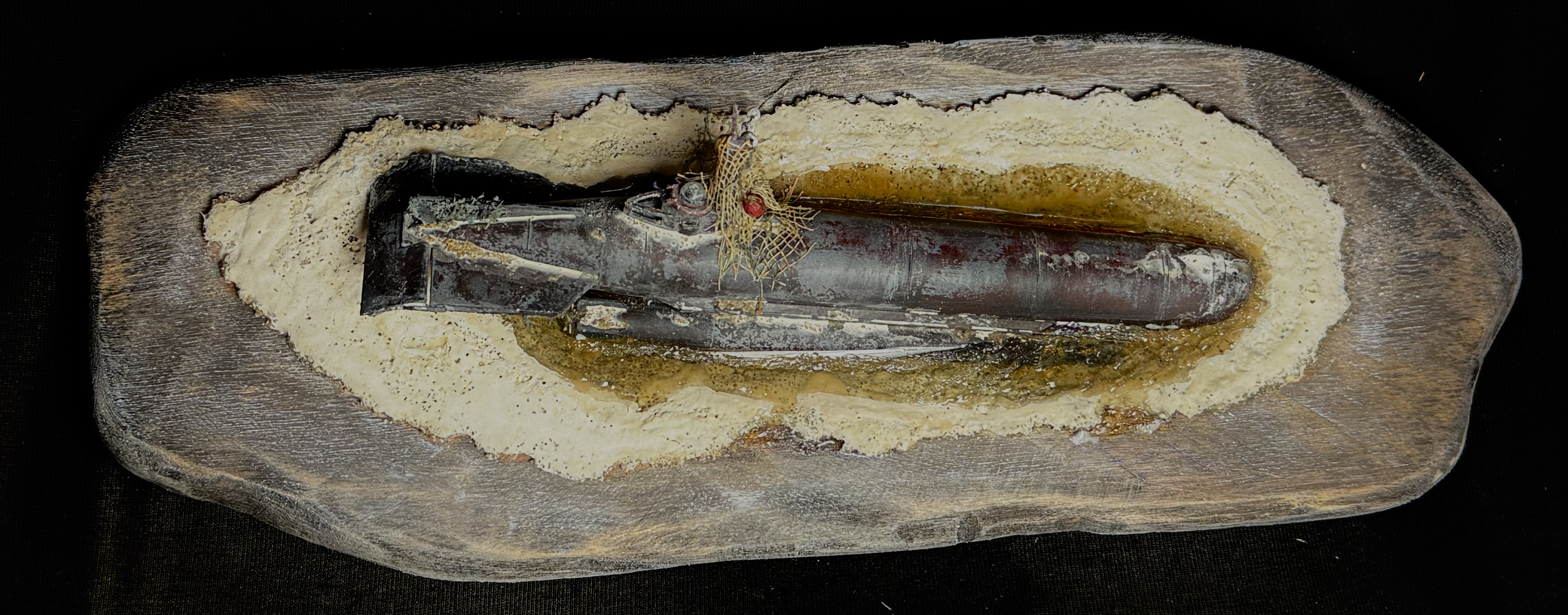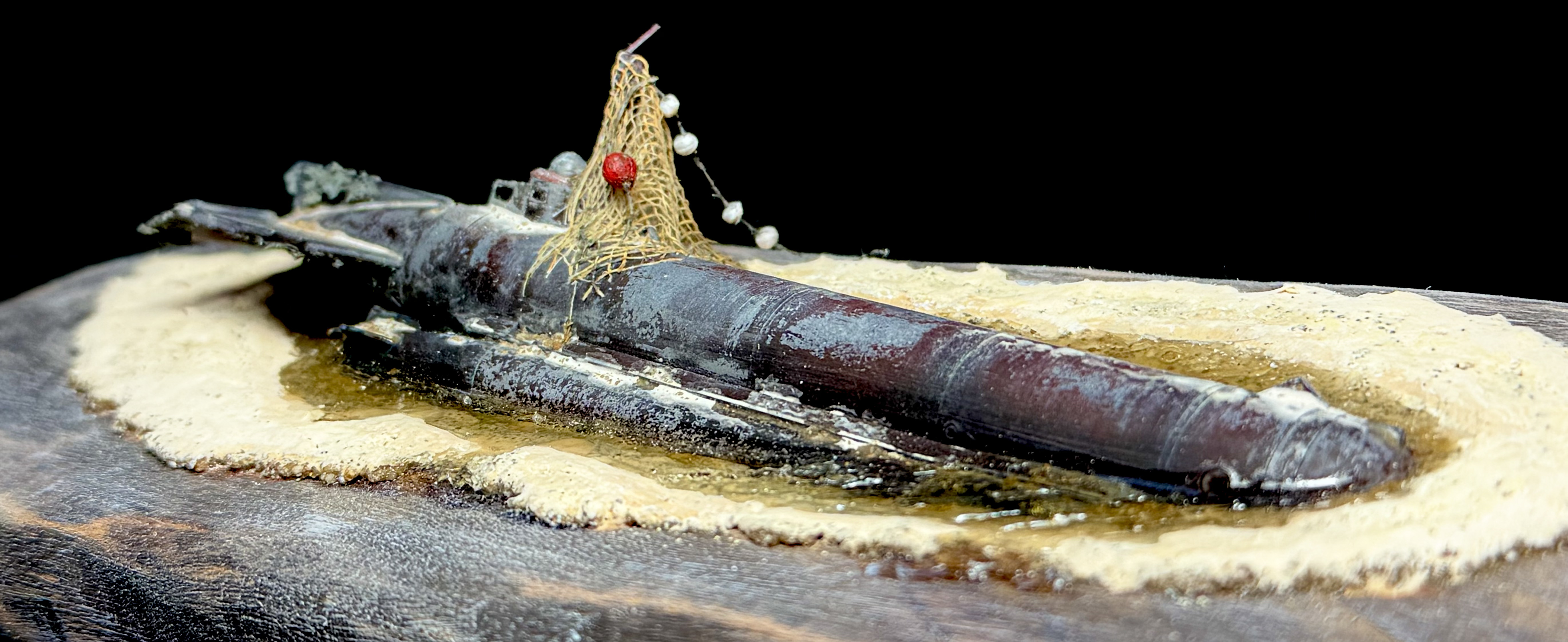 The scene is a 50’s North Sea Beach were local fishermen knew that something close to the shore was tearing up their fishing nets. It took a very low tide to reveal the reason and their luck as one of the G7e torpedo’s is still attached to the revealed Molch wreck.