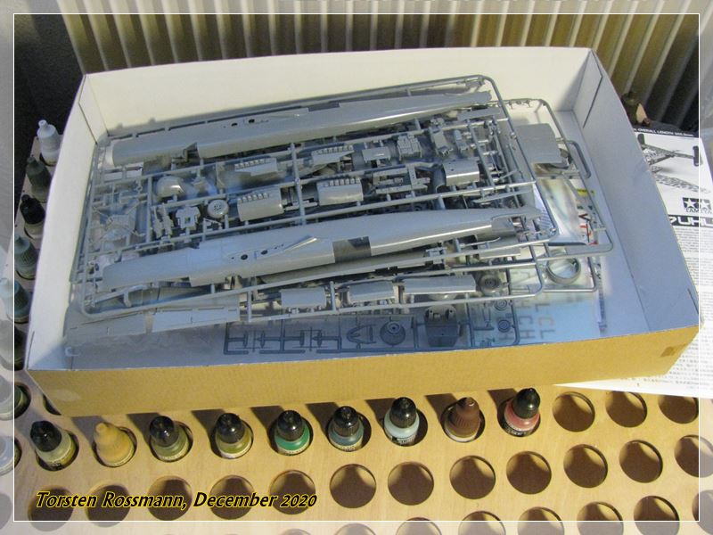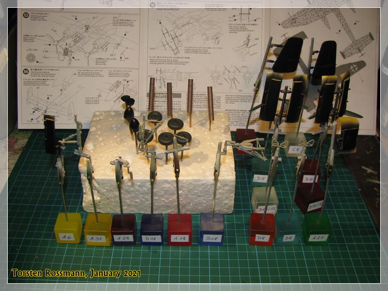 … paints are quite easy here, Black on the underside, RLM 76/75 on the upperside. I wonder how I manage the RLM 75 mottling . Well, I 'll see …