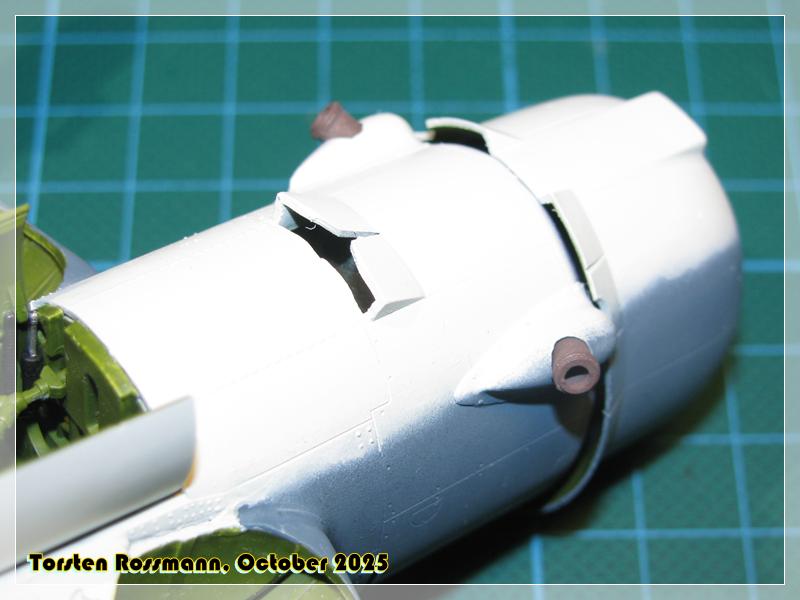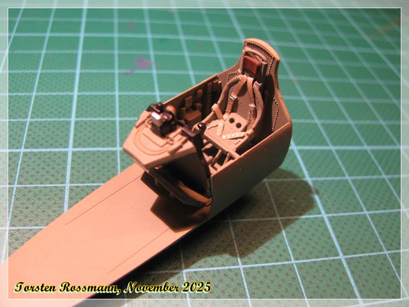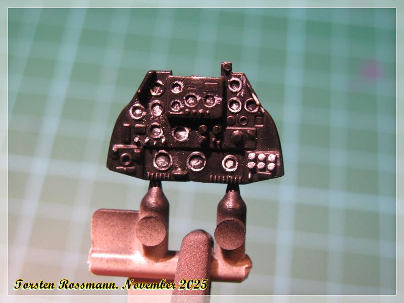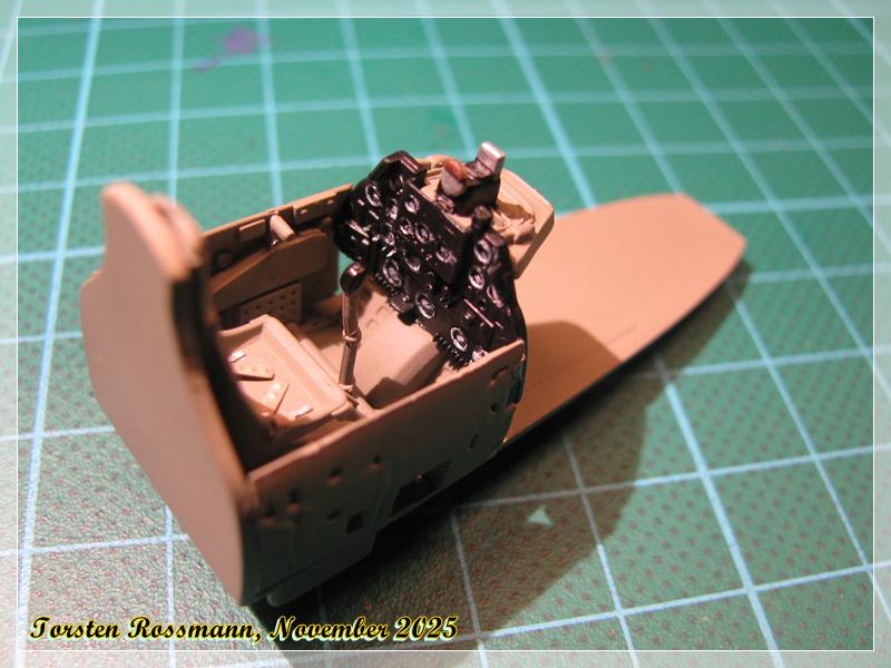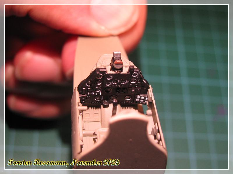 The instrument panel looks nice but it has neither PE parts nor decals for the gauges. So I dry brushed everything a bit. Not perfect but better than nothing …