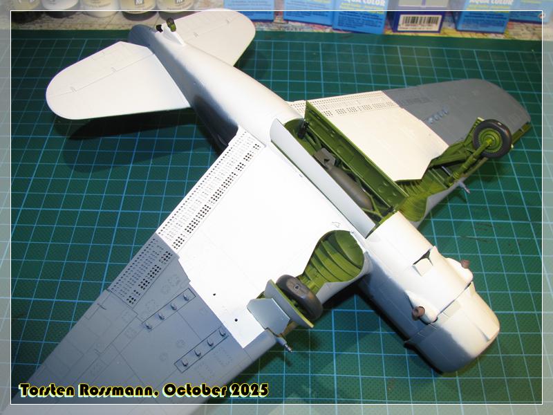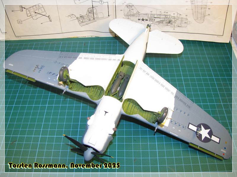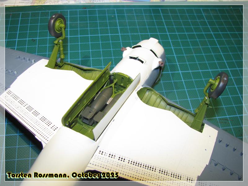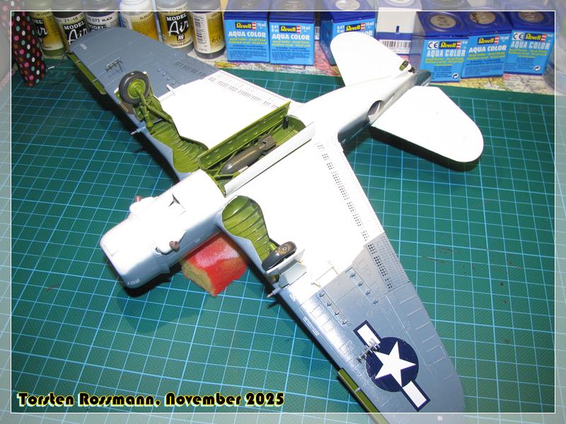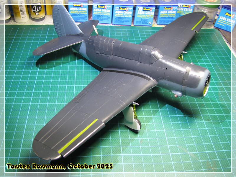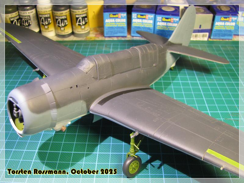Finally a big step towards the finish line this week! Done most of the paint correctios and detail painting and the Helldiver stands on her wheels. A bit tricky though because the landing gear is slightly outward but not as much as on a Bf 109. On the original aircraft it isn’t. And at first I made the mistake to paint the struts and wheel hub White. But it’s also Interior Green. You can guess, I needed a few layers to get the Green opague …