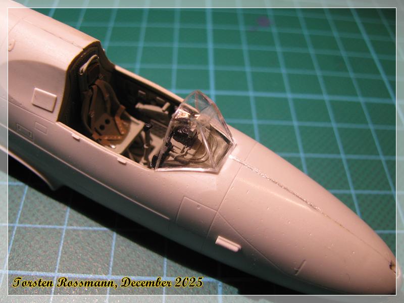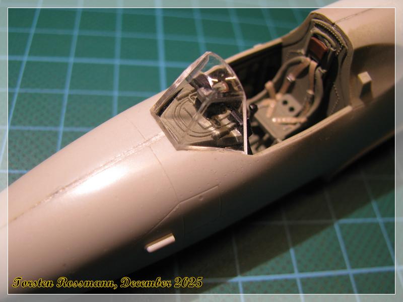 As I assumed, I had to use some filler in front of the cockpit but test fitting of the windshield still looks good. Maybe it needs a rubber band to stay in place later. Not sure yet if if open the cockpit or not …