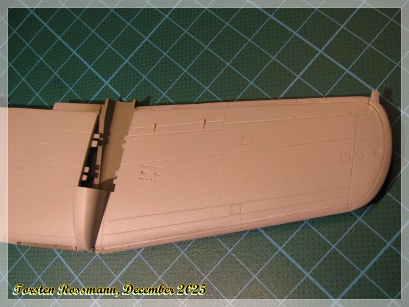 Final coating was again made with a 70/30 mix of Revell Aqua Clear Gloss and Clear Matt. I achieved good results with that paint with my last builds. The formation lights on the underside of the right wing are painted with Tamiya. Had to check my Marauder build to get them in the correct order. Demasking the canopies was easy, no problems here. Though I notice some overspray that came under the canopy. As mentioned earlier I opened the pilot’s canopy because of the bad fit as shown in Post 1047. The final parts added to the Helldiver were the air deflectors on the gunner’s compartement. I decided to keep that canopy close because the evil carpet monster had eaten the gun sight … The decals are both on the positive and negative side. Positive because they came off easily from the transfer paper after nearly 30 years in the box. Negative because they seem to be too large, at least some, especially on the side rudder and the Star and Bar on the fuselage.