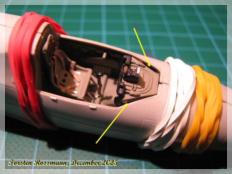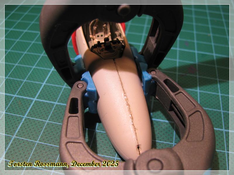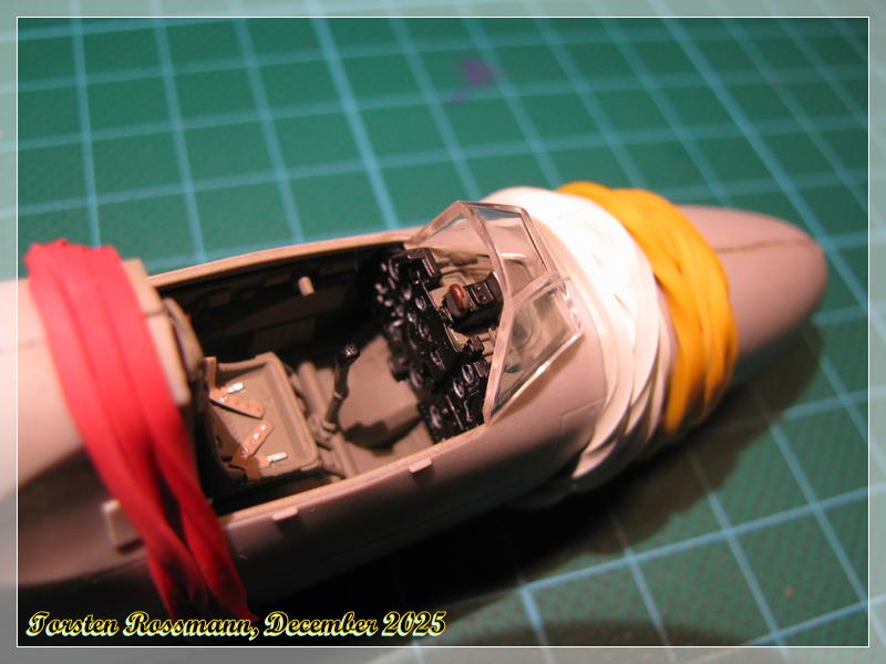 … later I noticed that the rubber bands are not sufficient enough to press the fuselage parts together. So I used 2 strong clamps and some Ethylacetate over night. I know, the seam looks ugly but I will sand it later. I even might still need some filler just in front of the cockpit. I’ll see …