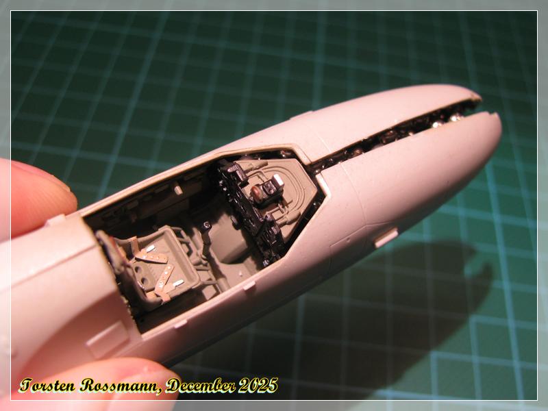 Cockpit is completed. Detailing is a bit disappointing to me. For 50 Euros I can expect a bit more I guess. There are even no clear parts for the gun sight … I have decided to keep the cockpit closed in the end because of the poor details.