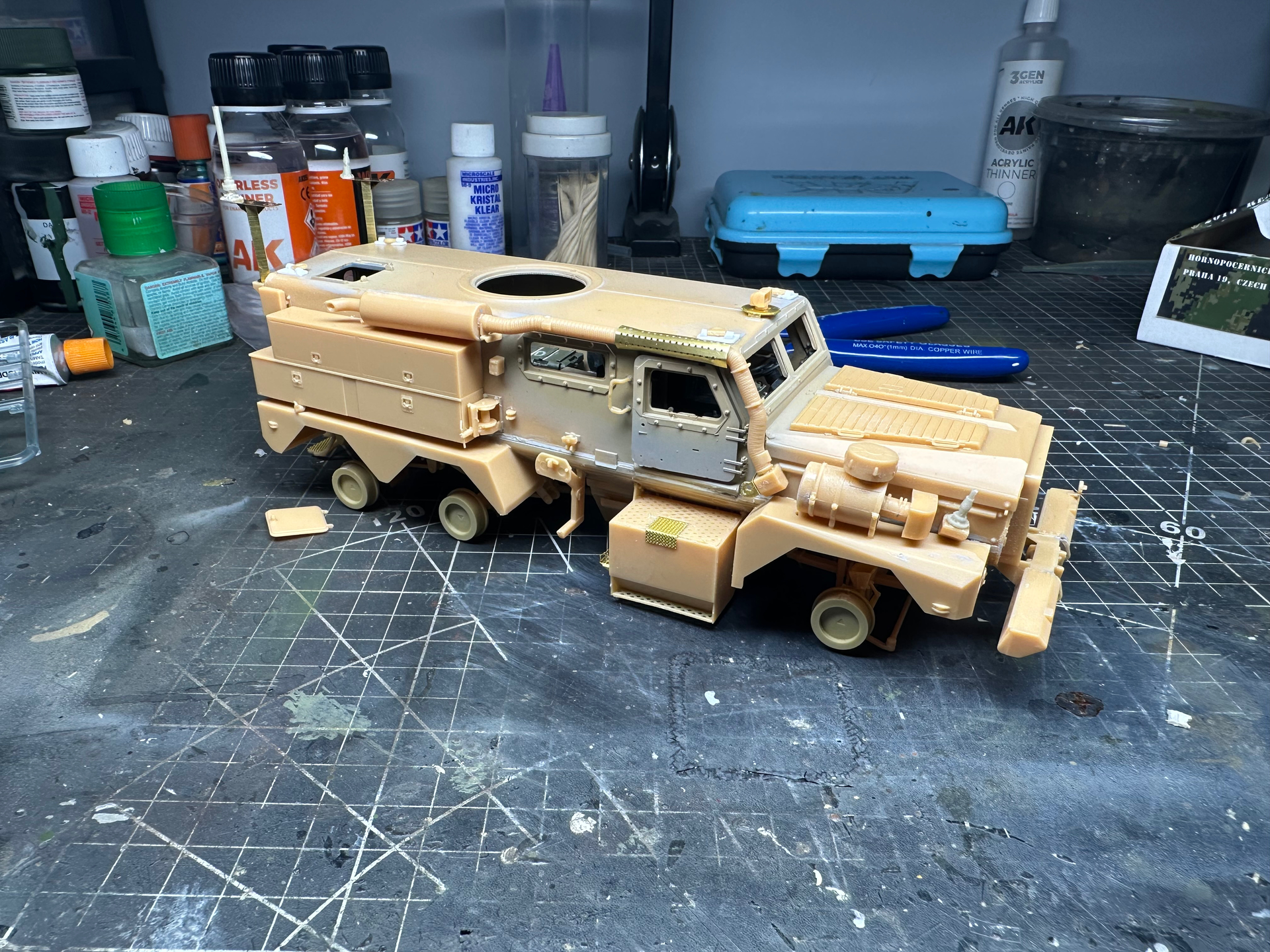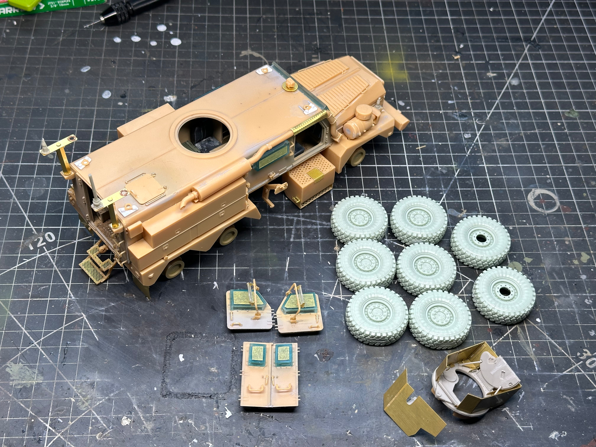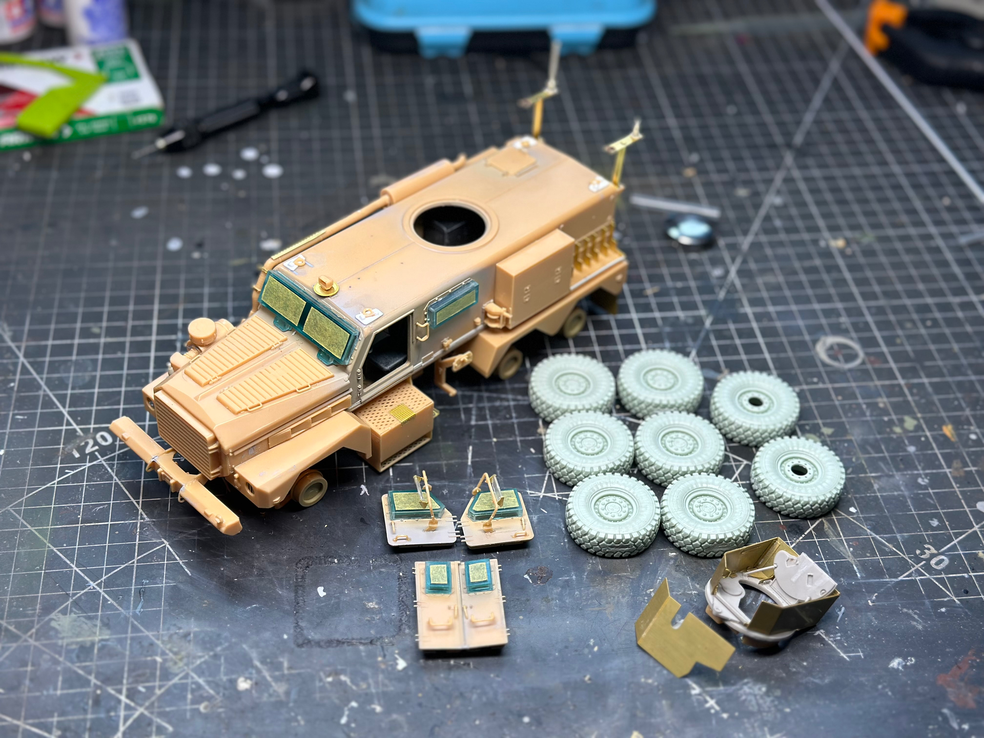 T-Antennas, bumper and exhaust added. Glass painted with Alclad armoured glass. Once it’s dry it’ll be masked and installed. Just need to build the legend GPK turret and we’re done. Happy new year fellow modellers!