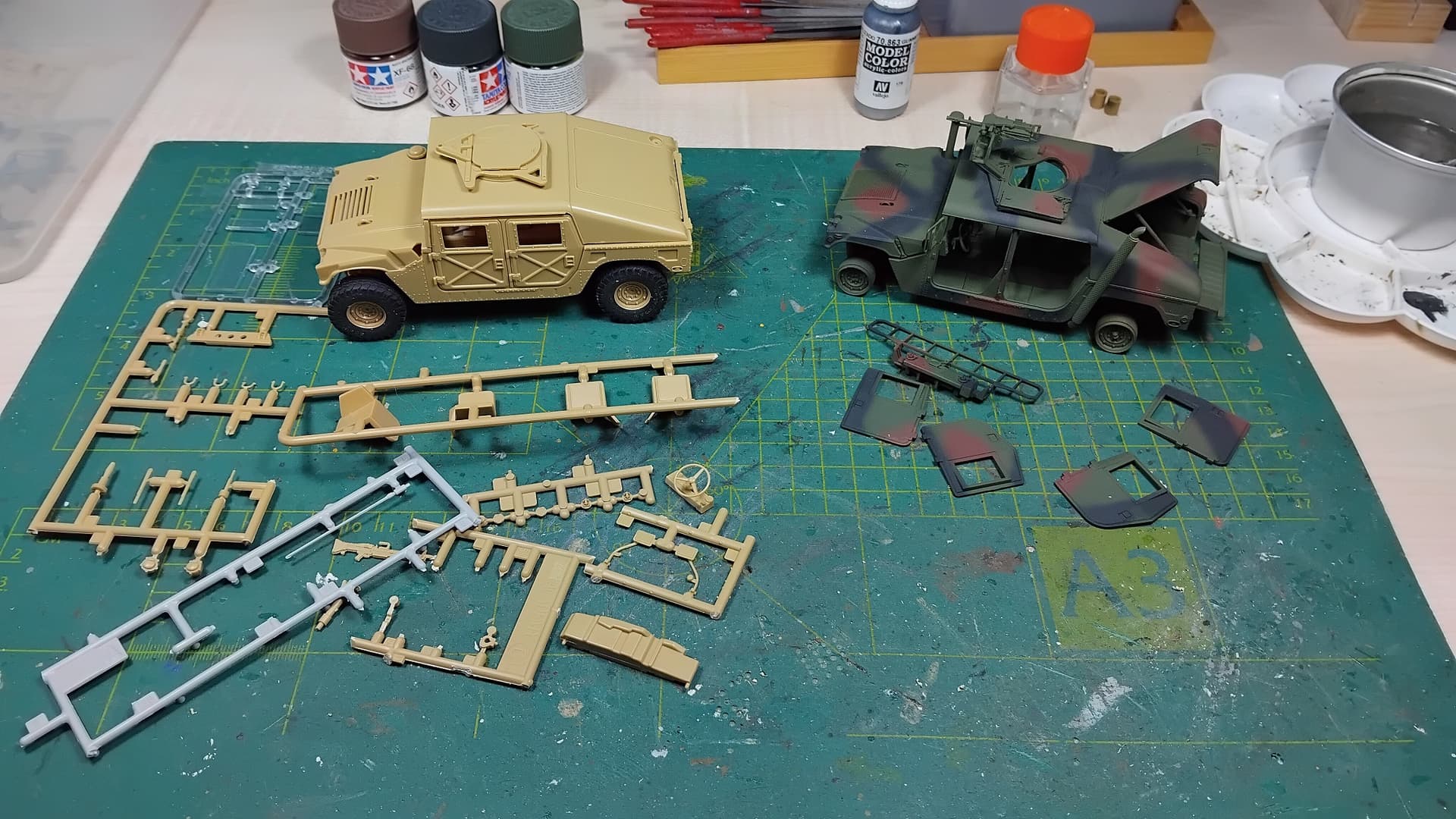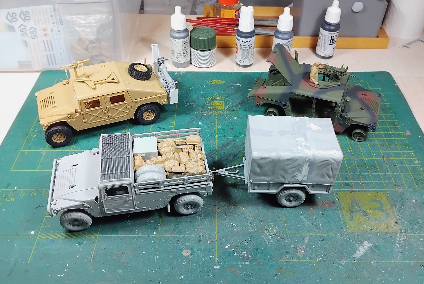 Looks like I managed to scrape together all needed parts for the M998 and the M1025 got its NATO-3-tone. The airbrush did not play along nicely. Started spitting at me after having done an Abrams and the green on the M1025. There was quite a bit of water in the moisturecollector.