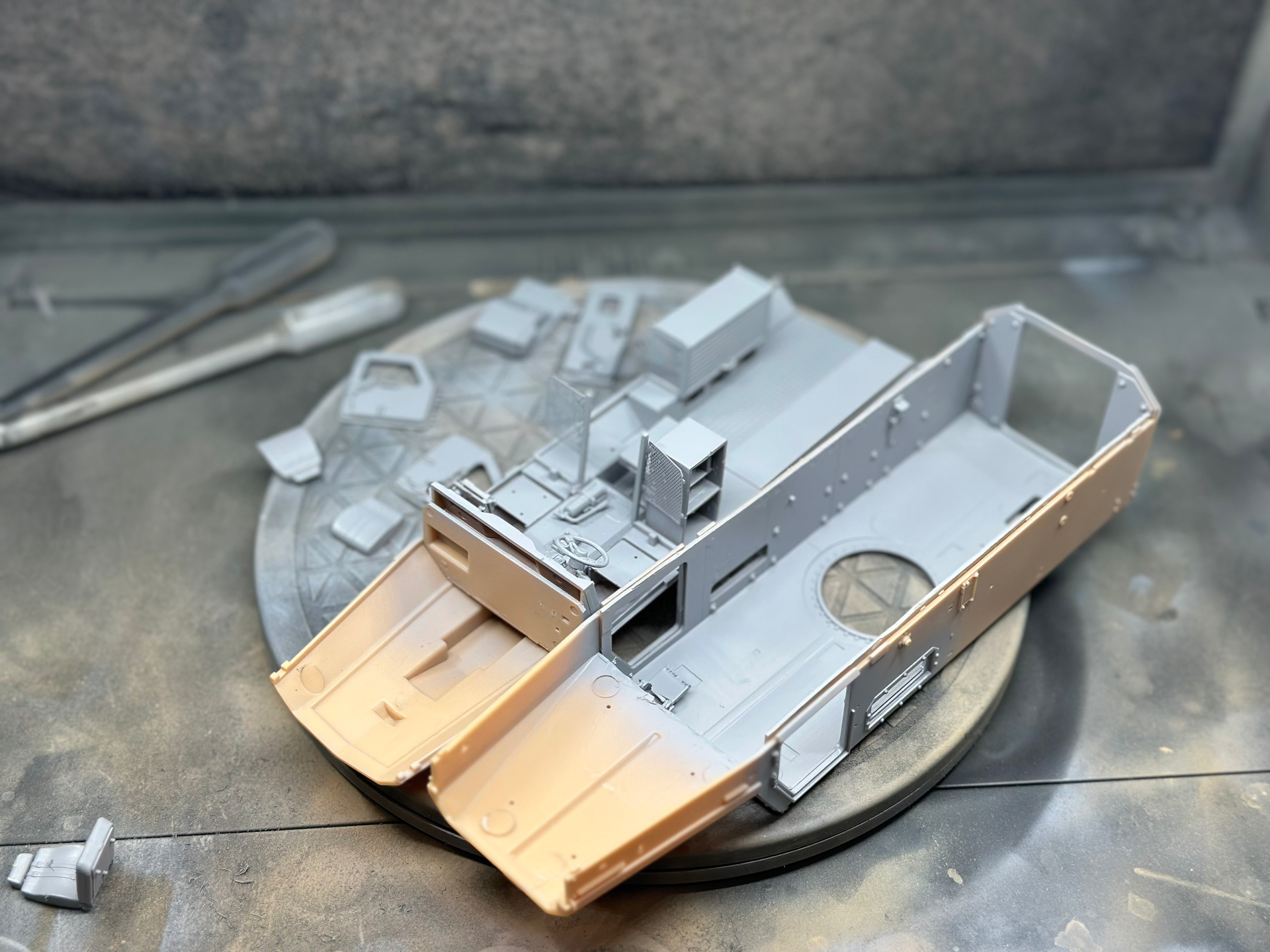 The M1097 is getting some colour! Don’t ask what colour, since it is a mix of remnants from previous projects, mixed until a sandy tone appeared. I also tried something new; masking tape for tiedown straps; easy to get tight and sticks in place. I did some commercially available ones in blue, just to add some colour.