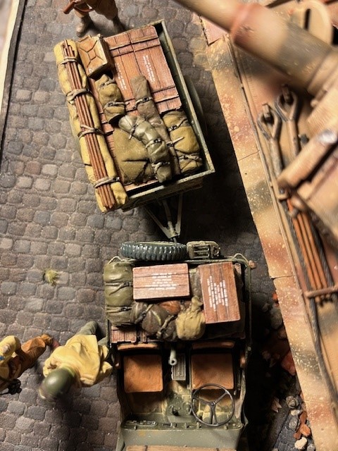 Let me point out one aspect that I do like – I’ve preached about this often. Note how cool the crates on the jeep & trailer look with their stenciling. It’s much more realistic, and it catches the eye, validates the scale and detailed work. Even though it can’t be read…