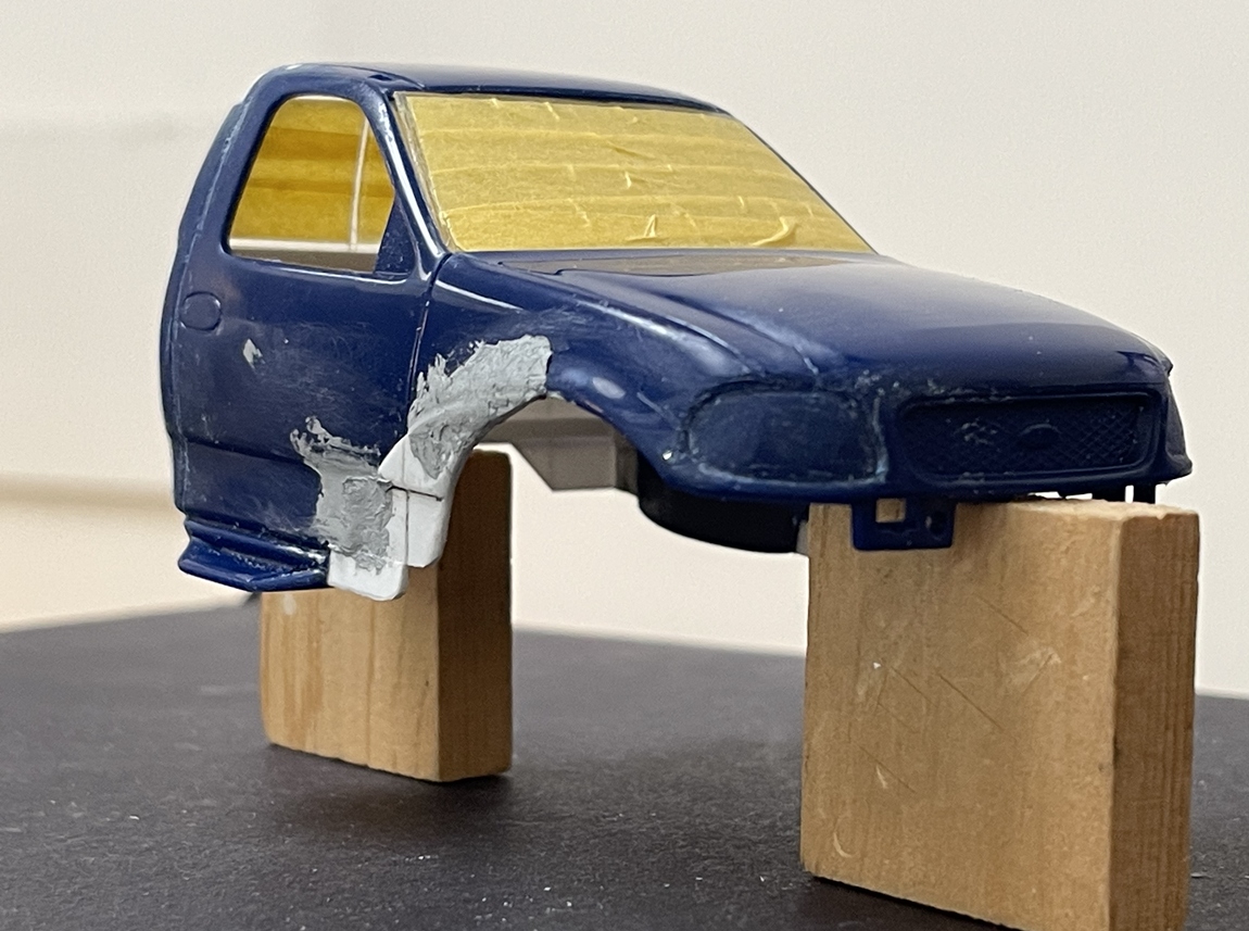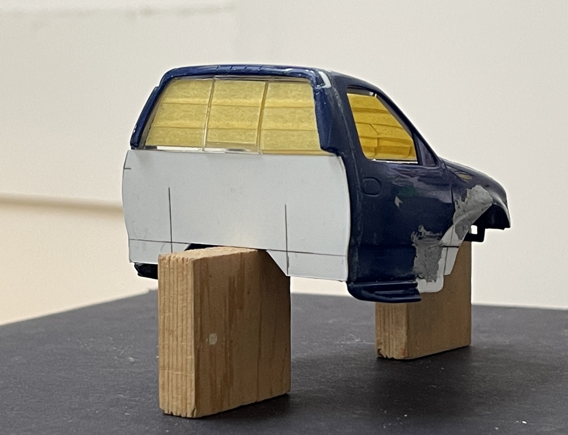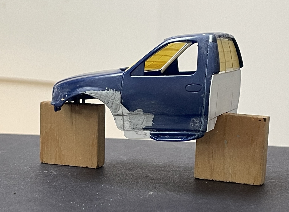 The kit comes with the cab and bed as one piece, so step 1 was to cut off the bed. Then adapt some 1/25 scale remnant window glass from who knows what kit, and on to body work