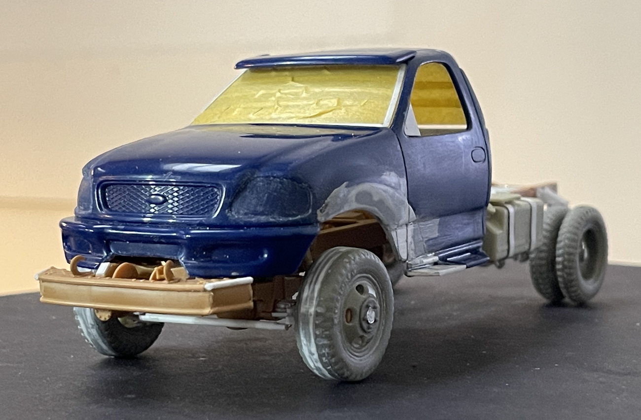 While still pretty ugly, it’s coming right along. The windows took a several gradual steps of cutting, filling and doing it again, until there was a decent fit. I’ve added backing strips inside the cab to keep them firmly (relatively) in place. Then on to filling in the giant fender openings. As I’ve built a few trucks this went relatively smoothly - clearly some sanding etc to go.