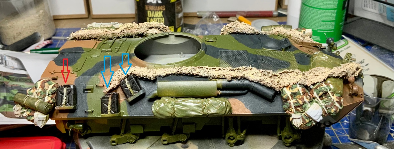 A pointer on the jerrycans. The one below with the red arrow looks like a plastic fuel can (three handle) and is usually a field drab / brownish color. If it has a single handle, it is a water jug and is fine black, or can be sand. The ones with blue arrows are metal fuel cans and were usually dark green / NATO green. They are not usually repainted.