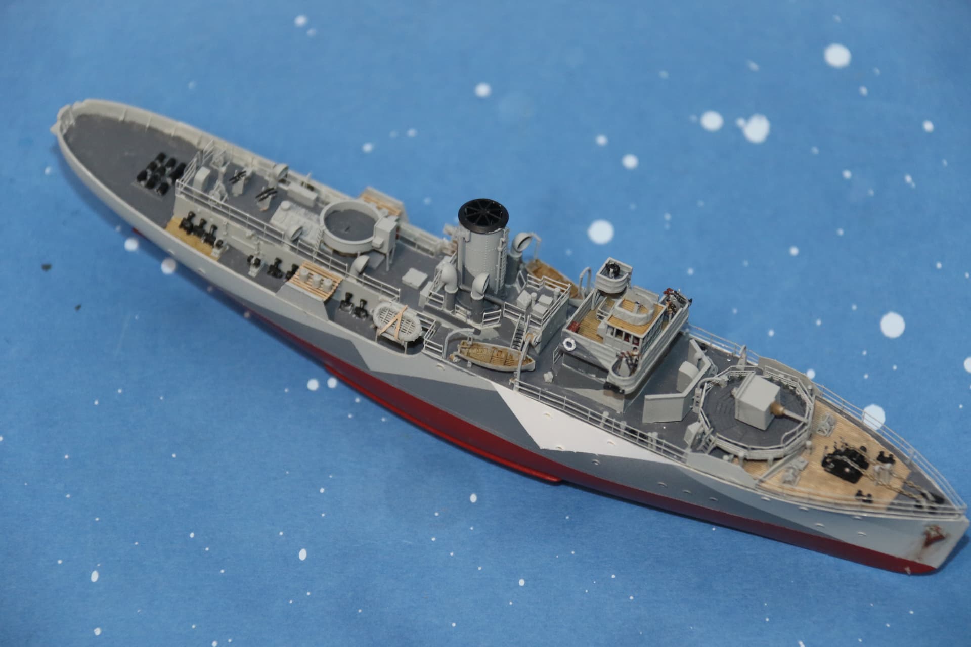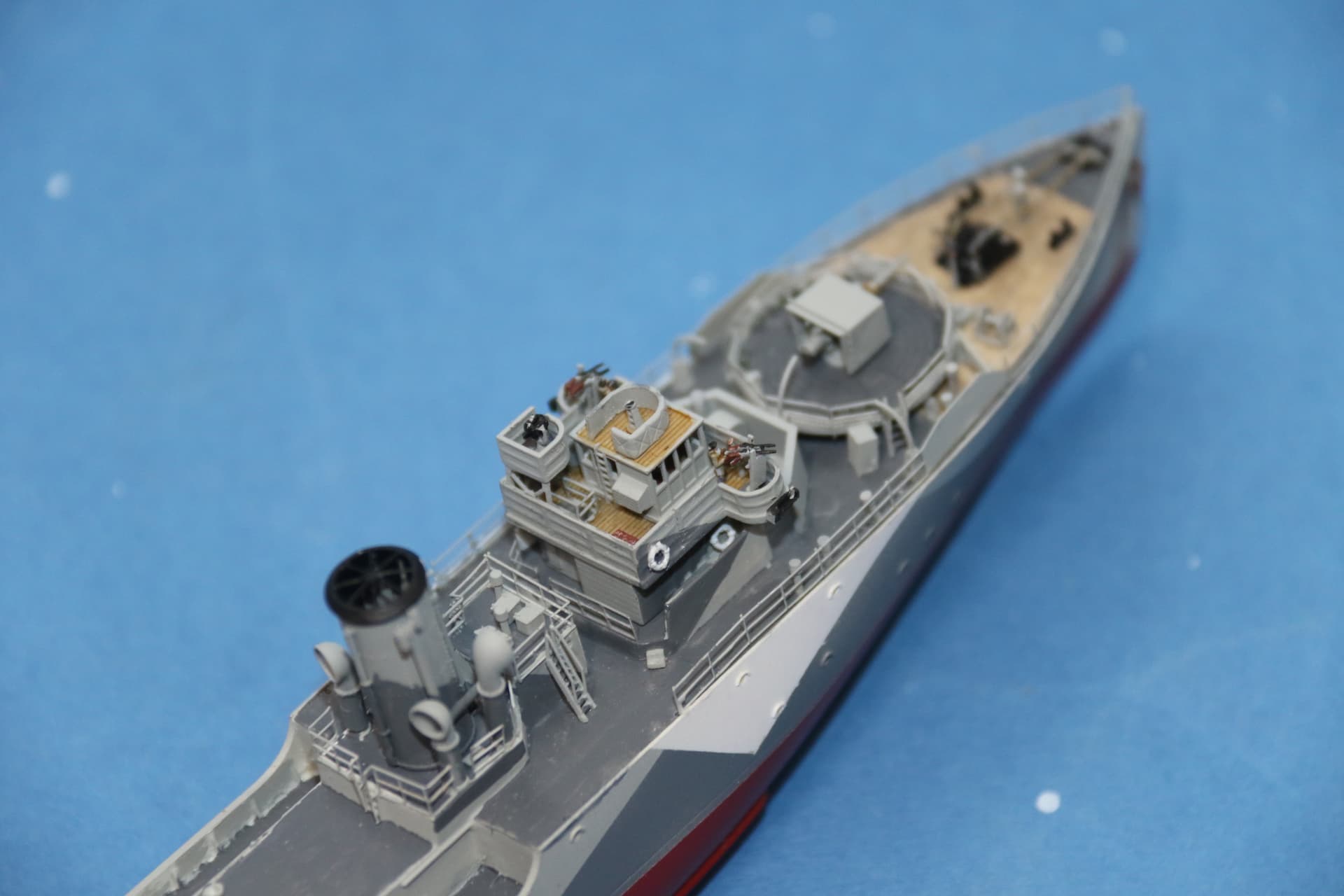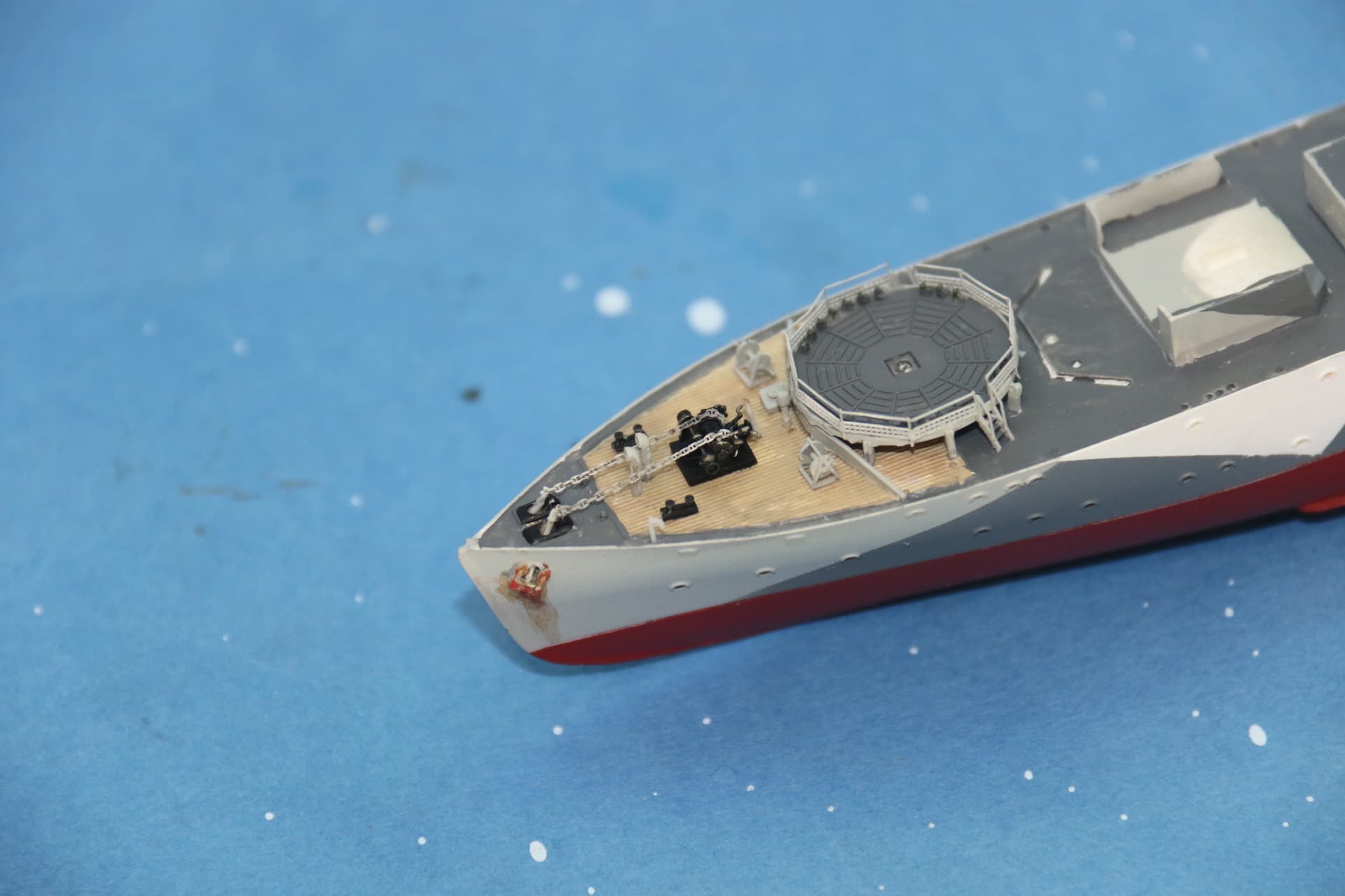 The weathering around the hawsepipes needs tidying up. The bridge structure, a couple of figures in their winter gear have been added, the helmsman and officer of the watch are inside the wheelhouse, barely visible.