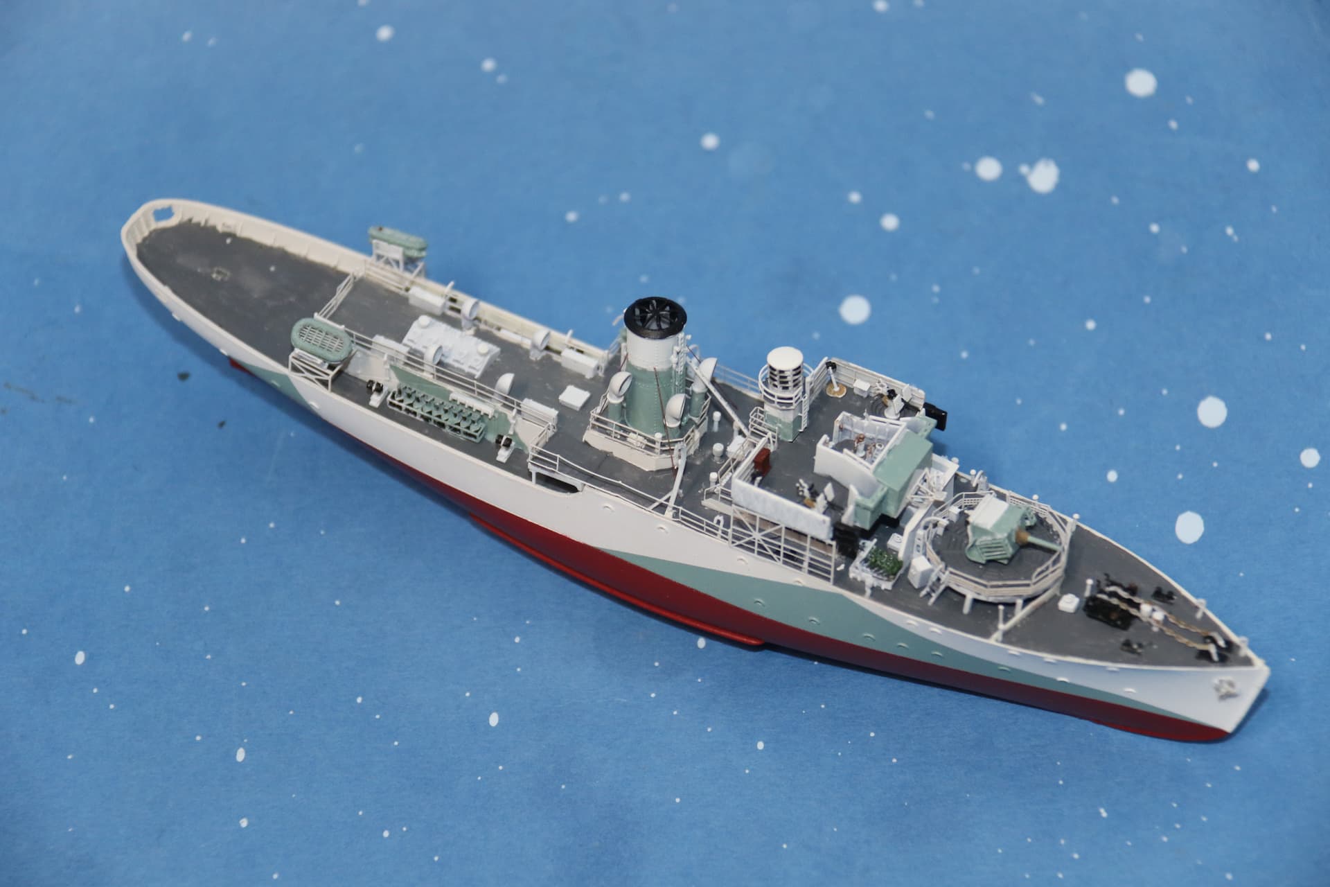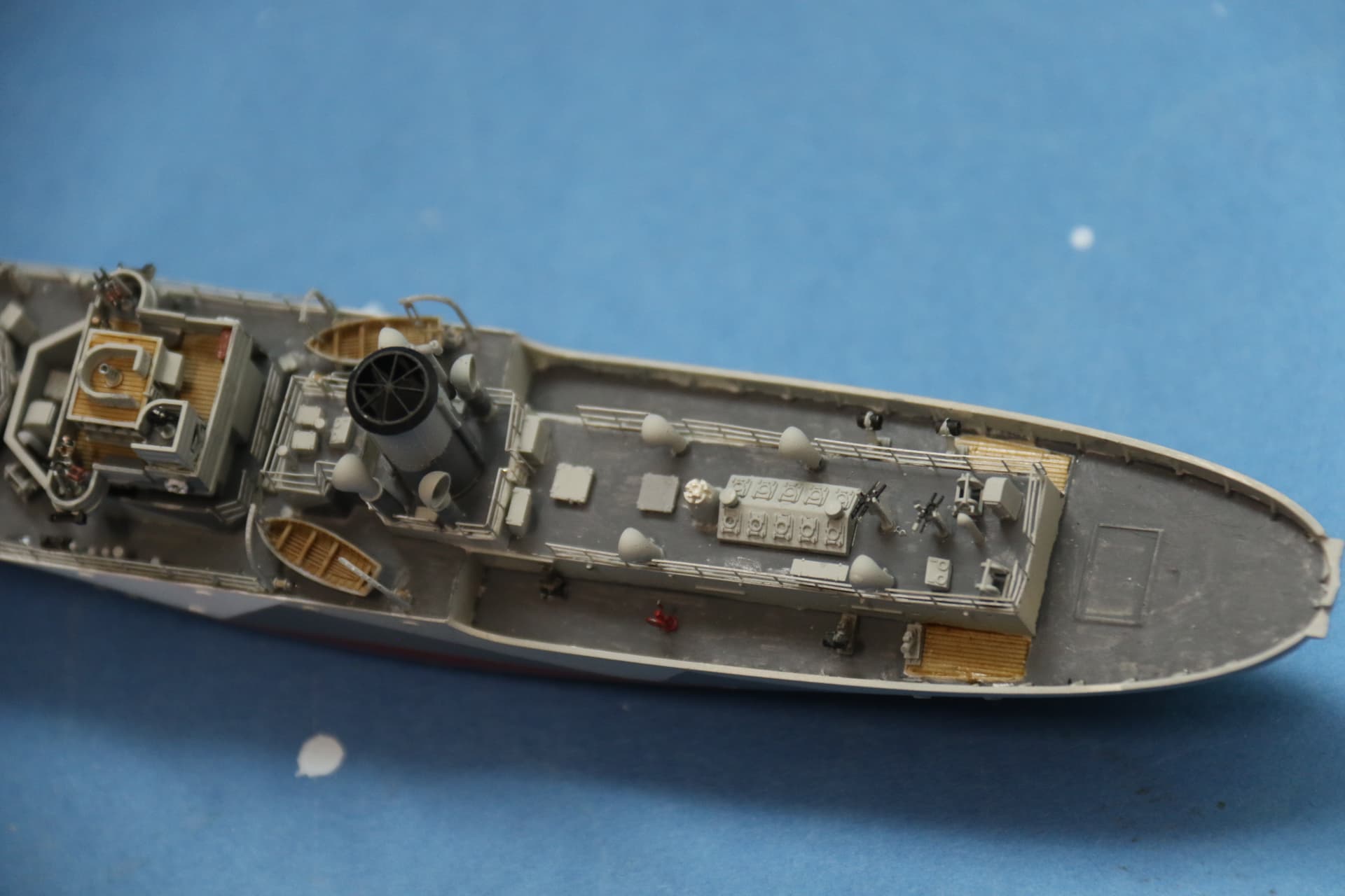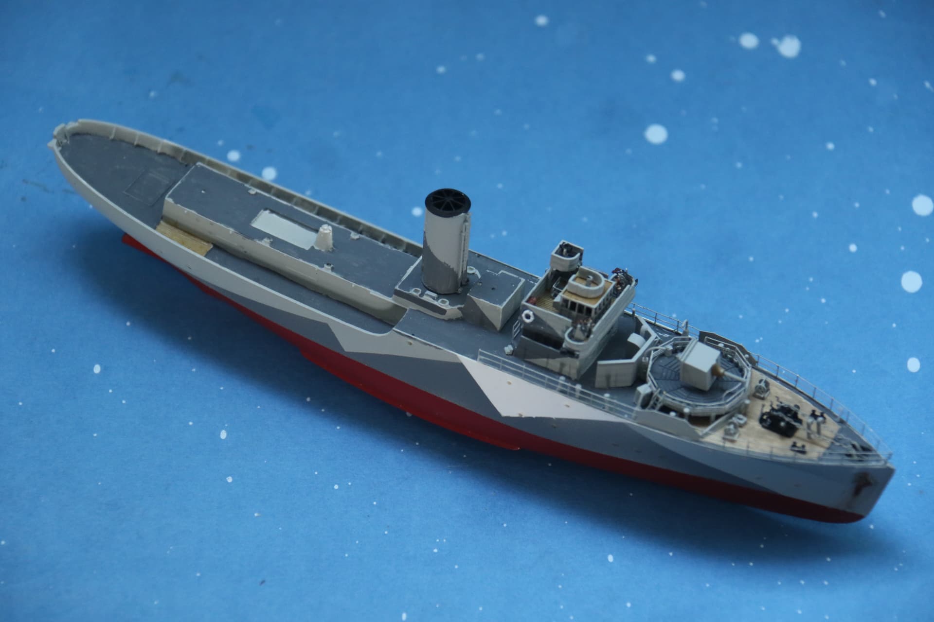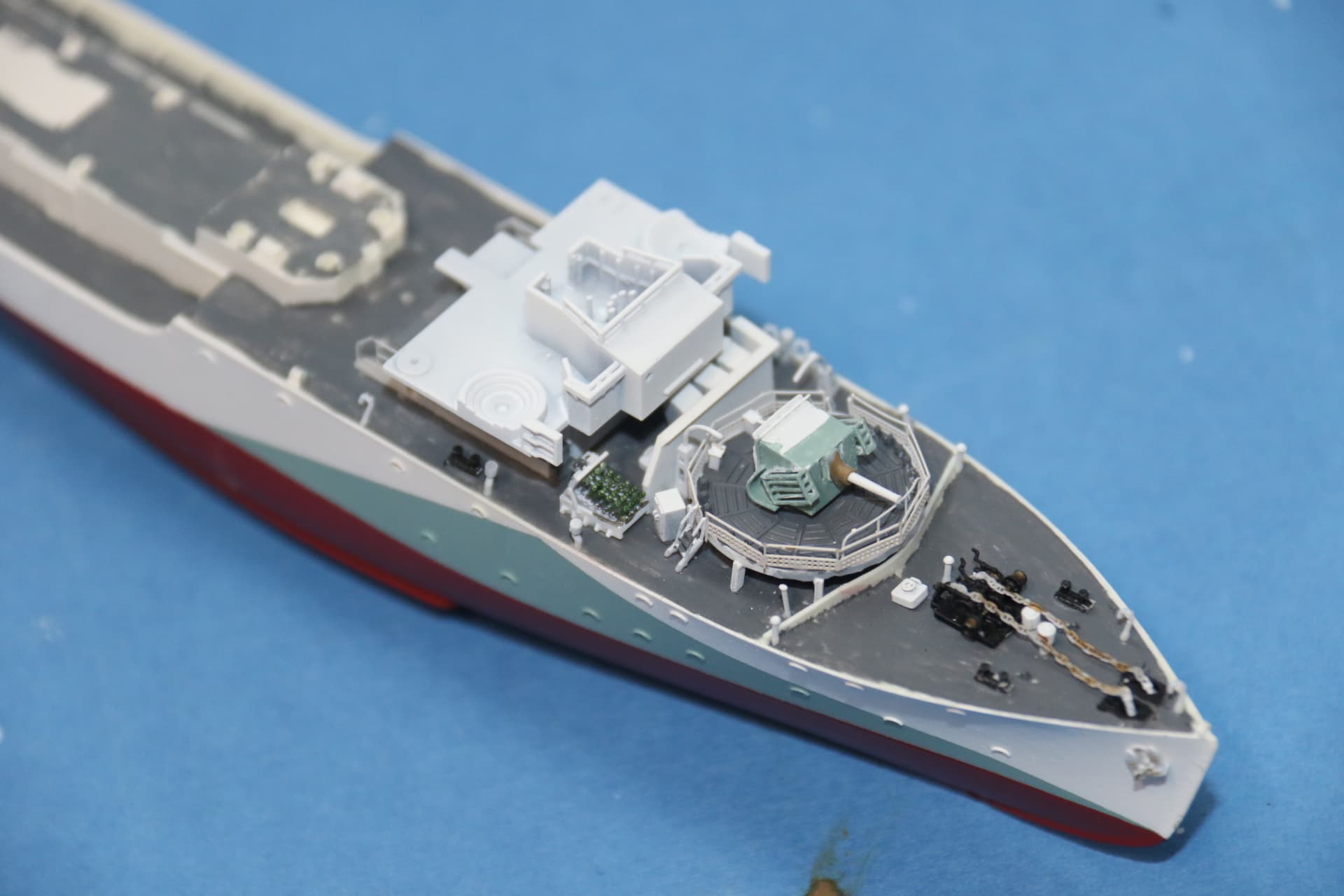 The weathering around the hawsepipes needs tidying up. The bridge structure, a couple of figures in their winter gear have been added, the helmsman and officer of the watch are inside the wheelhouse, barely visible.