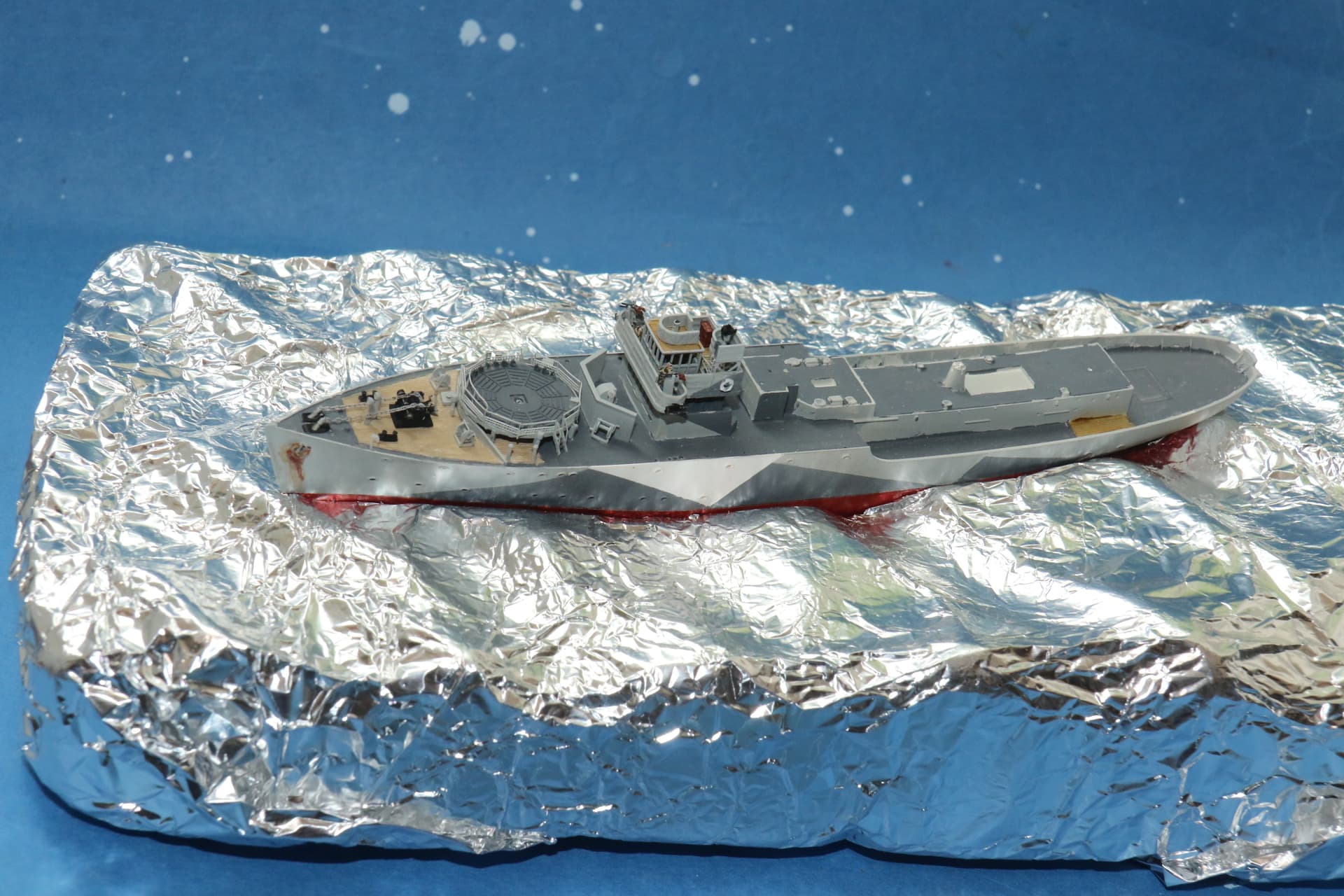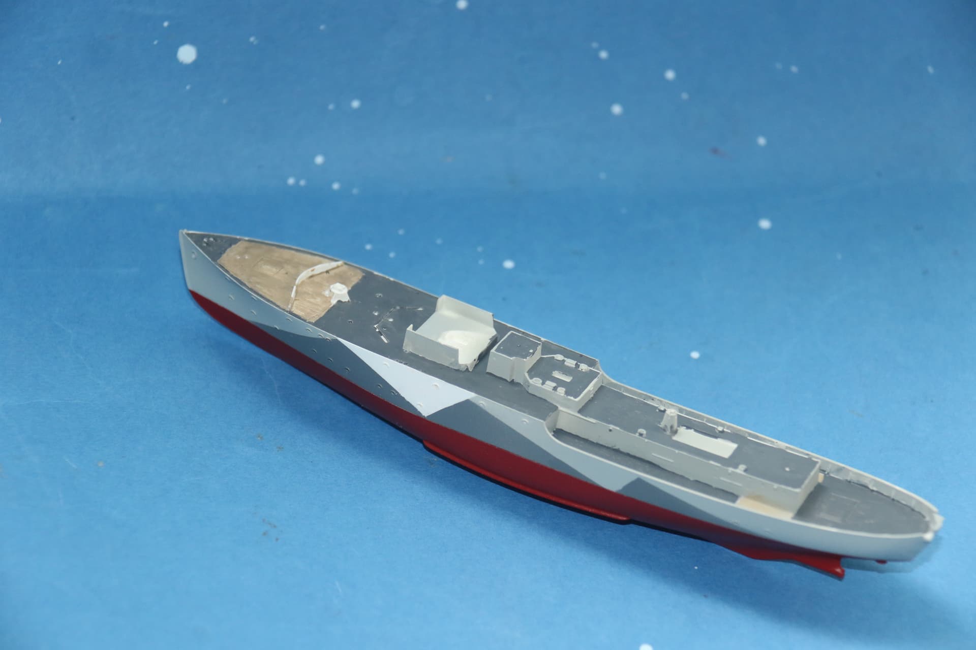 The Bridge in place, and the build so far test fitted into a sea base I am working on for this ship. The sculpting of the waves still needs some tinkering to get the effect I want, a confused sea. wind against tide.